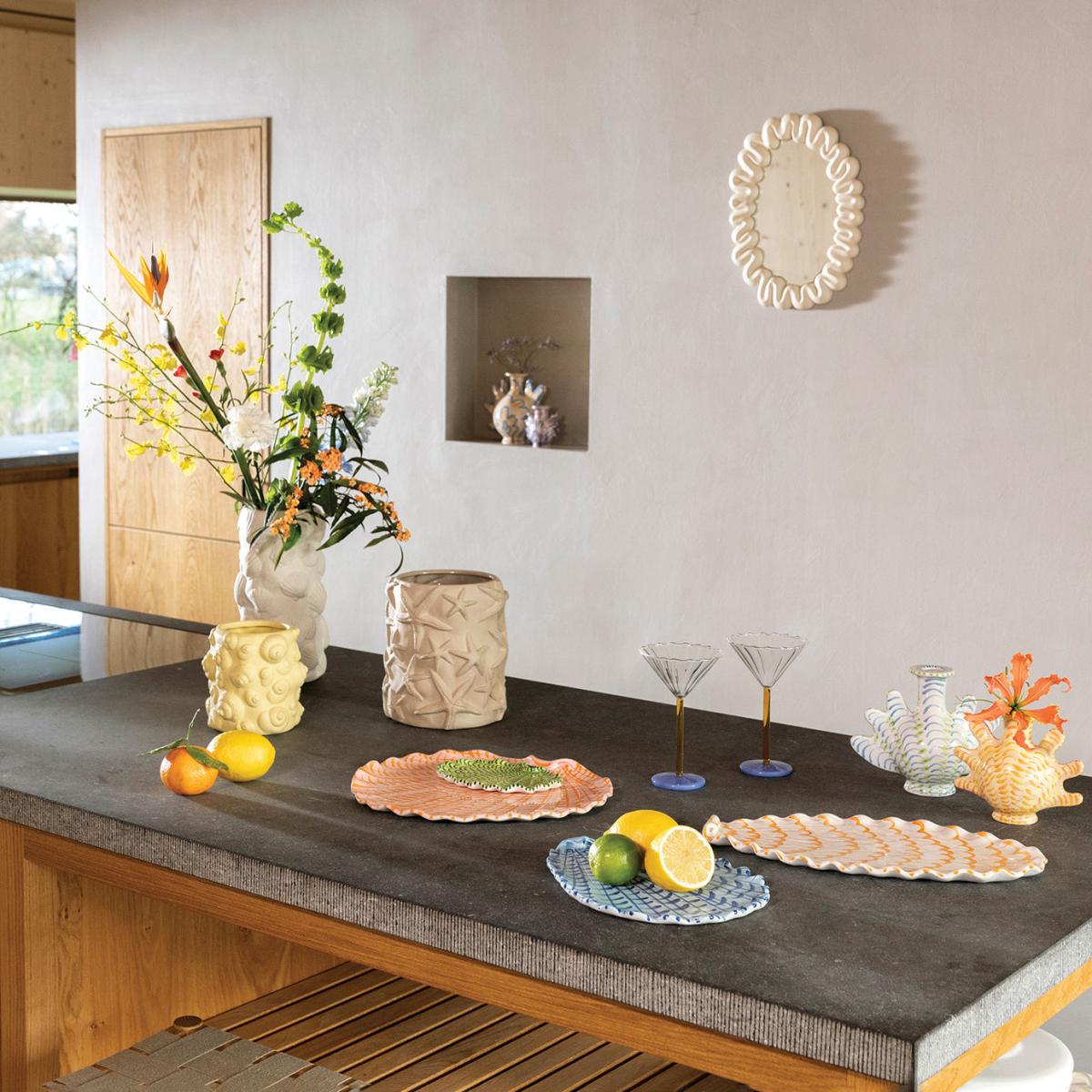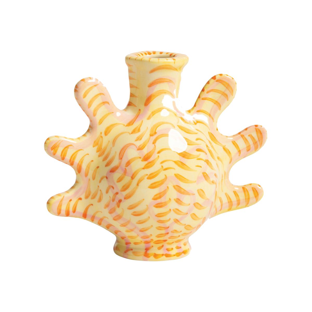 Throw yourself into summer with this collection designed by South African painter Lucie De Moyencourt. Joyful and colourful, these ceramic pieces inspired by the marine world bring a breath of freedom and good humour to your decor! Undulating corals and seashells give your home a holiday feel. This candle holder can also be used as a vase for small flowers.