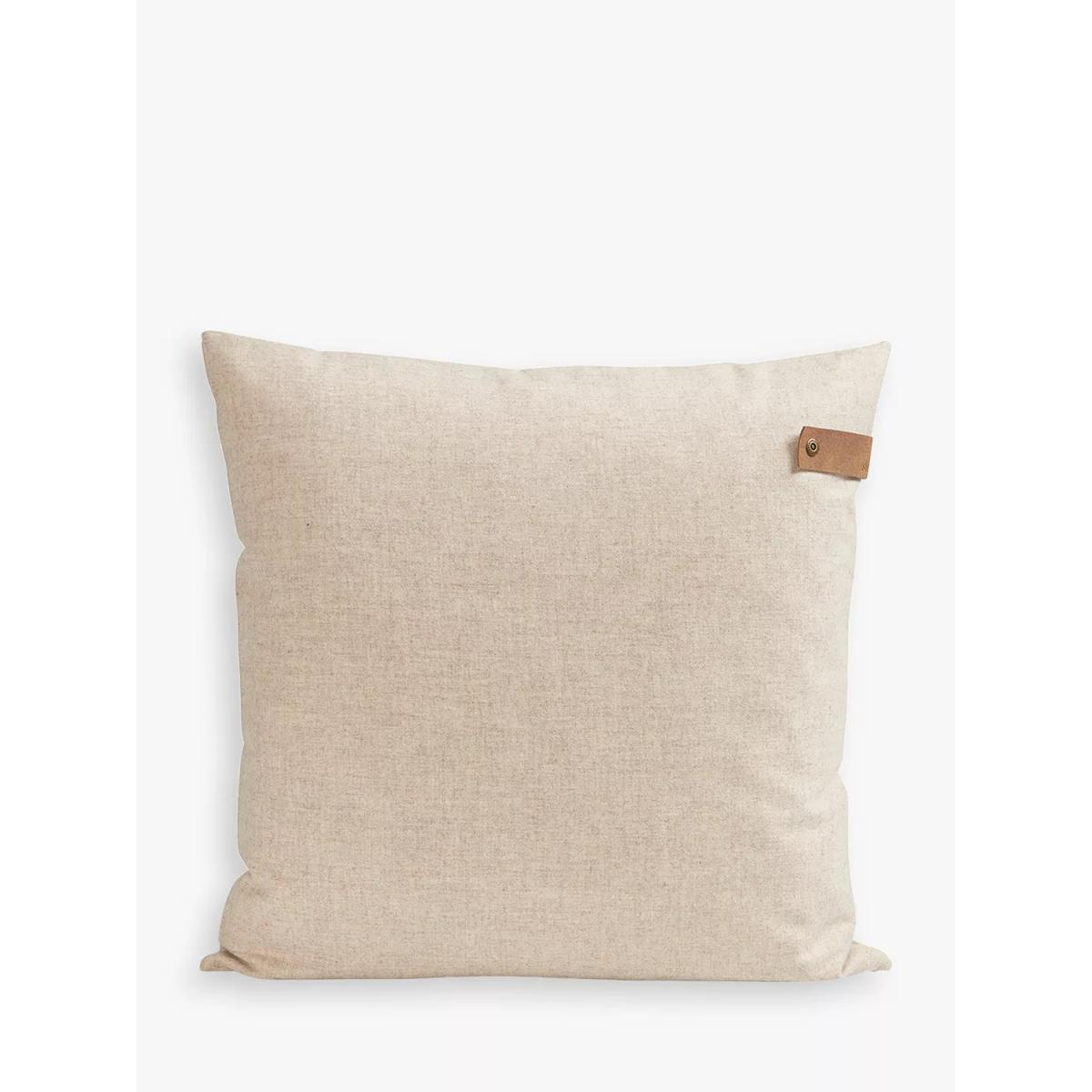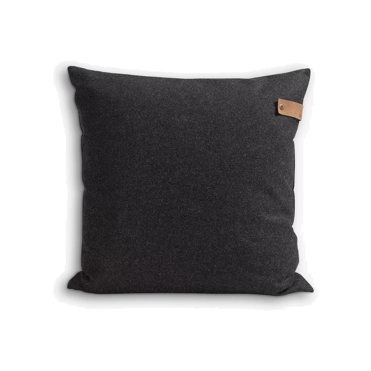 This cushion is made from soft, woven wool with a decorative faux leather handle. The cushion cover has a hidden zip and can be removed for washing.