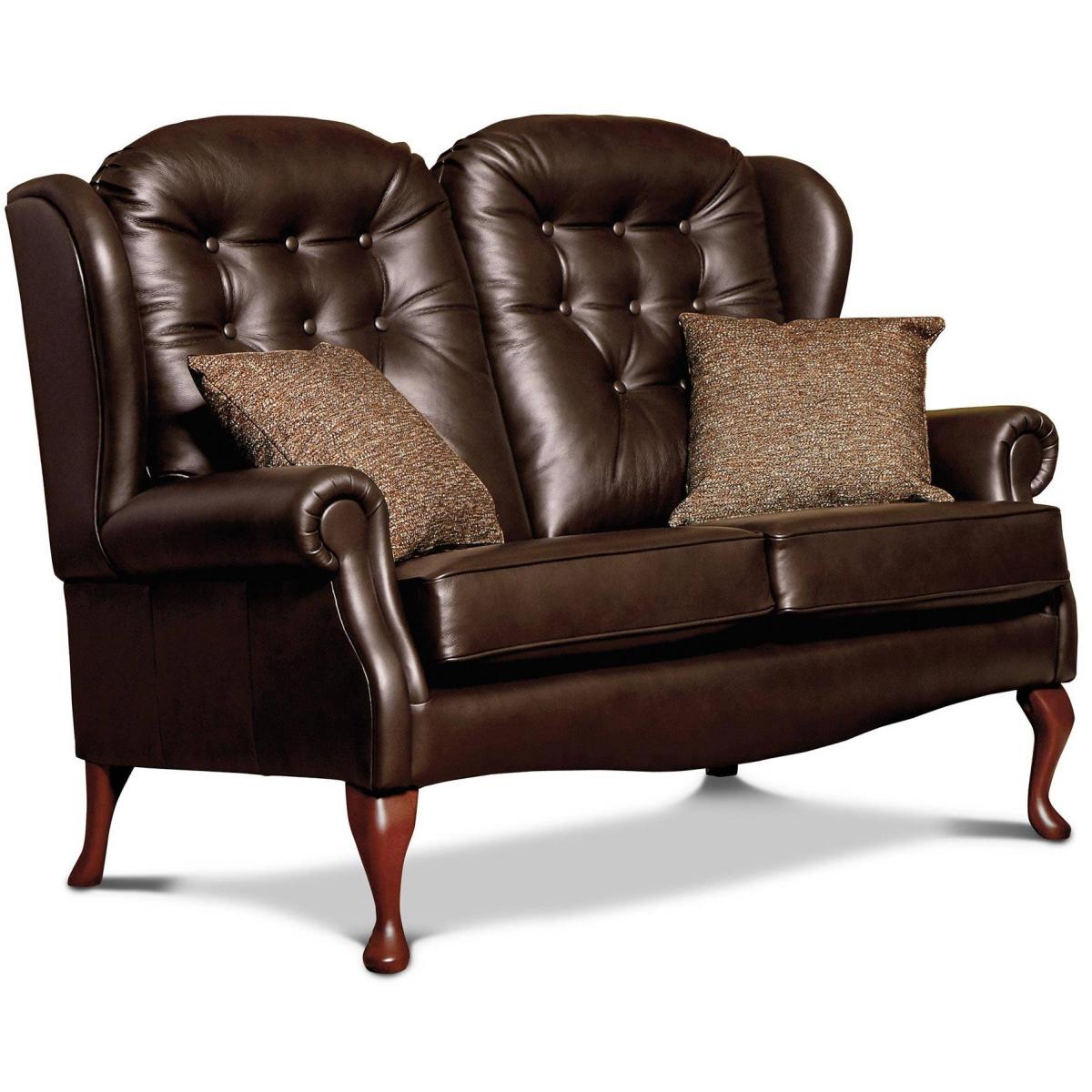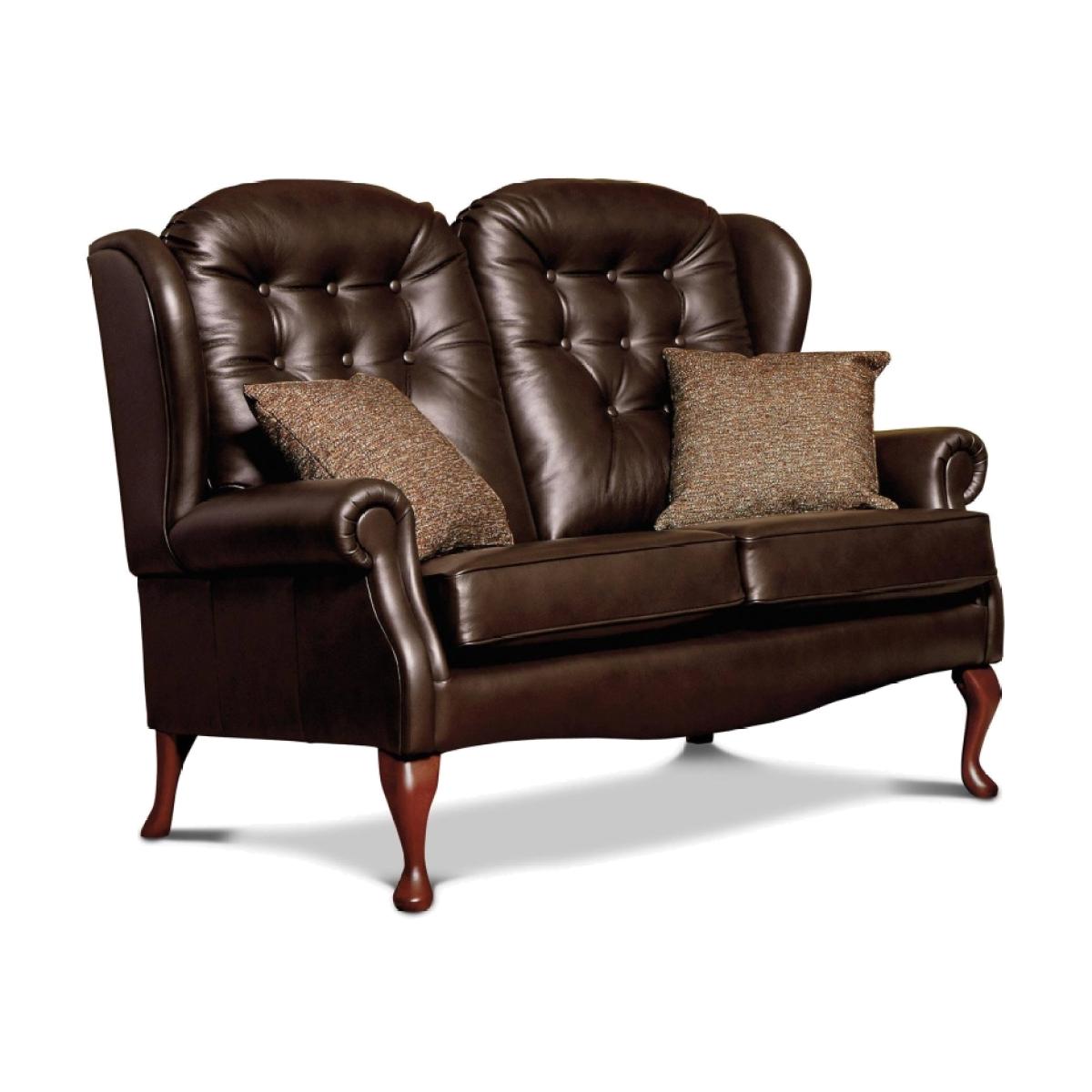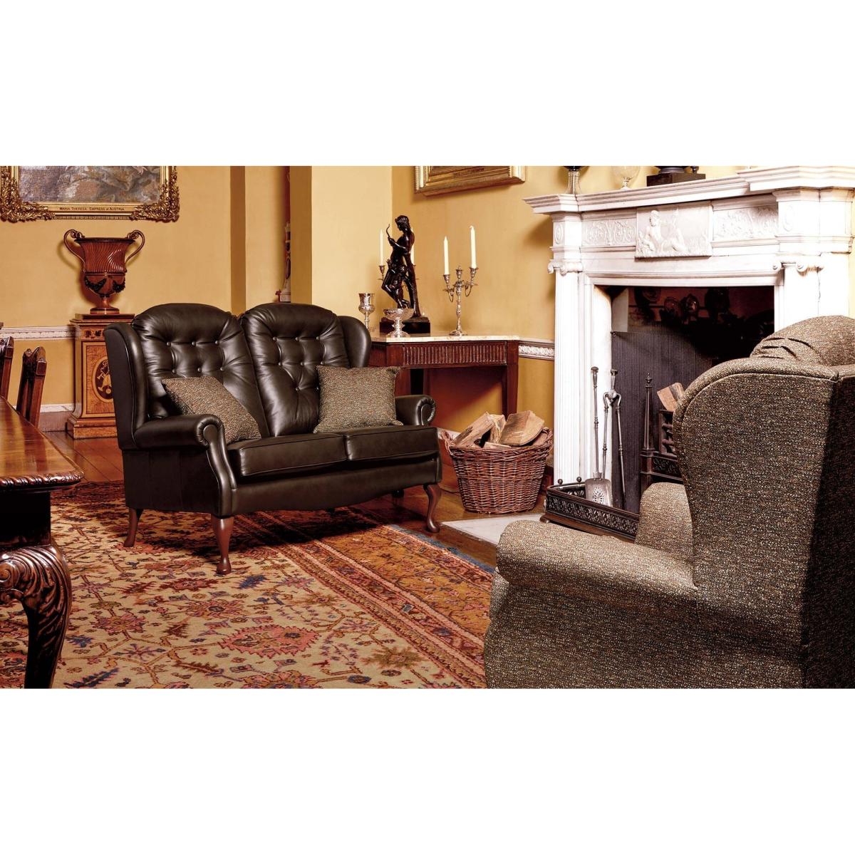The Sherborne Lynton upholstery collection is crafted with pride here in the UK and available in a wide range of sizes, using the best quality materials. The Fireside 2 seater is available with a choice of dark or light legs, with a wide range of fabric choices to choose from. Fabric ranges Atlantis, Minerva and Neptune all benefit from Aquaclean technology, giving you the reassurance that your chair will wipe clean using water only in most cases, with no need for specialist cleaning products. The Lynton fireside range has a classic design with a deep button back and gives excellent lumbar and head support. Resting on elegant wooden feet and featuring compact neat scroll arms that will suit any traditional living space. 2 Seater Sofa Dimensions: Width: 137.5cm Depth: 87.5cm Height: 106.5cm Seat Width: 105cm Seat Depth: 49cm Seat Height: 48.5cm Features: Hand-built with joints that are glued and screwed for strength and durability Fabric seat cushions only are reversible Leather seat cushions fixed Seat interior - reflex foam and full sprung seating that bounces back into place Back cushions are fixed and filled with a firm and supportive fibre All Sherborne leathers are made entirely out of full genuine hides Manufactured in the UK 5 year manufacturers guarantee All screens vary in colour reproduction and whilst every effort has been made to display the colour as accurately as possible it is for guidance only. If you would like to order Fabric Samples please click here. Shown in Coniston Sand with matching Fireside Chair on Light Oak Legs.