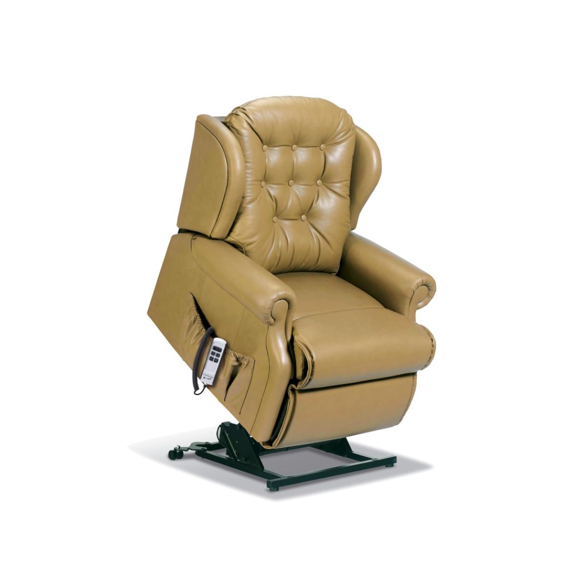 The attractive scroll arms of the Lynton are complemented by useful wings, ‘chaise’ seating and a welcoming fibre-filled back cushion. Wonderfully comfortable the Lynton Electric Riser Recliner also available in Small, Standard and Royale sizes. SINGLE and DUAL motor options available The Single Motor and Dual Motor actions both lift and tilt the Recliner forwards so that getting in and out is the easiest thing imaginable. This full powerlift facility is designed to assist sufferers of arthritis, rheumatism, MS, poor circulation and many other mobility restrictions. The smooth and easy Single Motor action enables the footrest to be fully raised before the back starts reclining. It also allows the sleeping position to be reached (less reclined than on Dual Motor designs) from a starting position 20cm (8″) from the wall. The sophisticated Dual Motor mechanism enables you to control the backrest and footrest independently to reach the exact position you want including a near-horizontal full sleeping position (needs a 38cm (15″) gap from the wall). Features: Show in Como Apple fabric and Queensbury Toast leather Designed with full powerlift facility to assist sufferers of arthritis, rheumatism, MS, poor circulation and many other mobility restrictions 5 Year Guarantee on all Recliner actions, frames, motors, handsets and all other electrical parts Single-use Emergency Back-up fitted as standard Supplied with castors for ease of movement. Front castors lift away to ensure stability in raised positions. Supplied with removable back to make the task of delivering the Recliner into your home so much easier Maximum recommended weight 160kg (25 stone) Choice of Soft Covers or Leather Petite Chair Dimensions: Height: 97cm Width: 77cm Depth: 86cm Seat Height: 45.5cm Seat Width: 45cm Seat Depth: 49.5cm All screens vary in colour reproduction and whilst every effort has been made to display the colour as accurately as possible it is for guidance only.