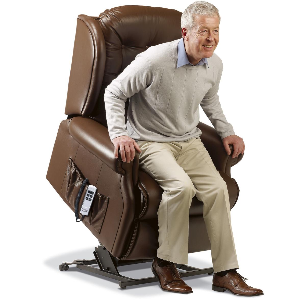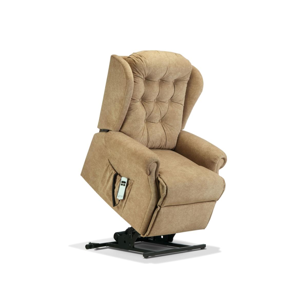 The attractive scroll arms of the Lynton are complemented by useful wings, ‘chaise’ seating and a welcoming fibre-filled back cushion. Wonderfully comfortable the Lynton Electric Riser Recliner also available in Small, Standard and Royale sizes. SINGLE and DUAL motor options available The Single Motor and Dual Motor actions both lift and tilt the Recliner forwards so that getting in and out is the easiest thing imaginable. This full powerlift facility is designed to assist sufferers of arthritis, rheumatism, MS, poor circulation and many other mobility restrictions. The smooth and easy Single Motor action enables the footrest to be fully raised before the back starts reclining. It also allows the sleeping position to be reached (less reclined than on Dual Motor designs) from a starting position 20cm (8″) from the wall. The sophisticated Dual Motor mechanism enables you to control the backrest and footrest independently to reach the exact position you want including a near-horizontal full sleeping position (needs a 38cm (15″) gap from the wall). Features: Show in Nautilus Biscuit fabric and Queensbury Brazil leather Designed with full powerlift facility to assist sufferers of arthritis, rheumatism, MS, poor circulation and many other mobility restrictions 5 Year Guarantee on all Recliner actions, frames, motors, handsets and all other electrical parts Single-use Emergency Back-up fitted as standard Supplied with castors for ease of movement. Front castors lift away to ensure stability in raised positions. Supplied with removable back to make the task of delivering the Recliner into your home so much easier Maximum recommended weight 160kg (25 stone) Choice of Soft Covers or Leather Royale Chair Dimensions: Height: 114cm Width: 89cm Depth: 94cm Seat Height: 49cm Seat Width: 52.5cm Seat Depth: 55cm All screens vary in colour reproduction and whilst every effort has been made to display the colour as accurately as possible it is for guidance only.