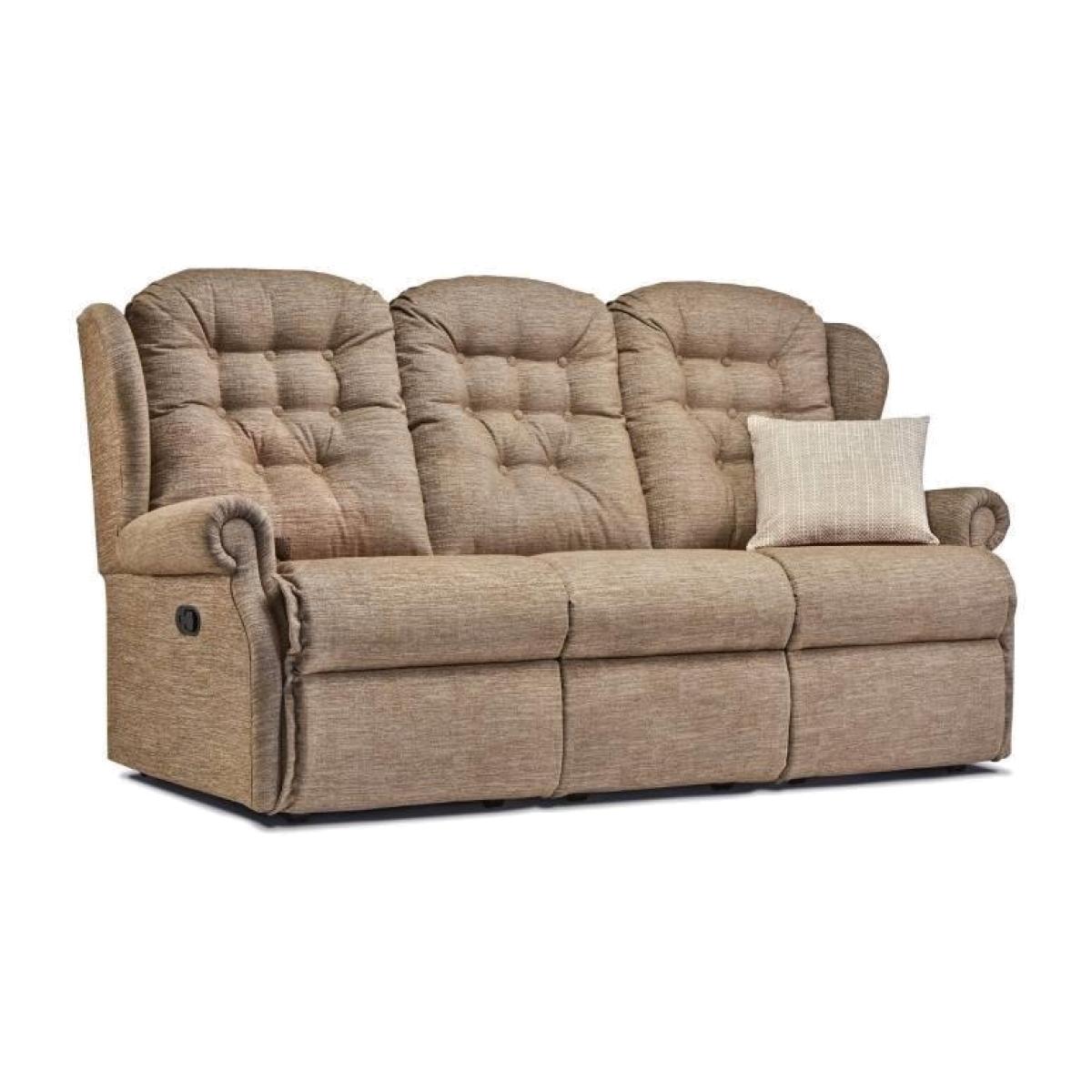 The Lynton recliner sofa is available in small and standard sizes, with a wide range of fabric and leather choices to choose from. Fabric ranges Atlantis, Minerva and Neptune all benefit from Aquaclean technology, giving you the reassurance that your chair will wipe clean using water only in most cases, with no need for specialist cleaning products. The Lynton has a deep buttoned back with padded winged sides for extra comfort and elegant scroll arms. This classic design will complement any traditional living space. You can put your feet up and relax with great comfort from the reflex foam and chaise seating. With a smooth recliner action your feet will be raised for you to lean back and relax. To return to an upright position press gently with your legs on the footrest. Resting on castors you will be able to move around with ease for cleaning or rearranging whenever the mood takes you. Hand-built with joints that are glued and screwed for strength and durability Seat cushions are fixed and filled with reflex foam and full sprung seating that bounces back into place Back cushions are fixed and filled with a firm and supportive fibre Supplied with removable backs to make delivering into your home so much easier Available in a wide range of fabrics and leathers Manufactured in the UK 5 year manufacturers guarantee Small 3 Seater Dimensions: Height 104cm Width 193.5cm Depth 90cm Seat Height 49cm Seat Width 159.5cm Seat Depth 51cm All screens vary in colour reproduction and whilst every effort has been made to display the colour as accurately as possible it is for guidance only. If you require material swatches sending out in the post please do email us and select 'online enquiry' as your enquiry type.