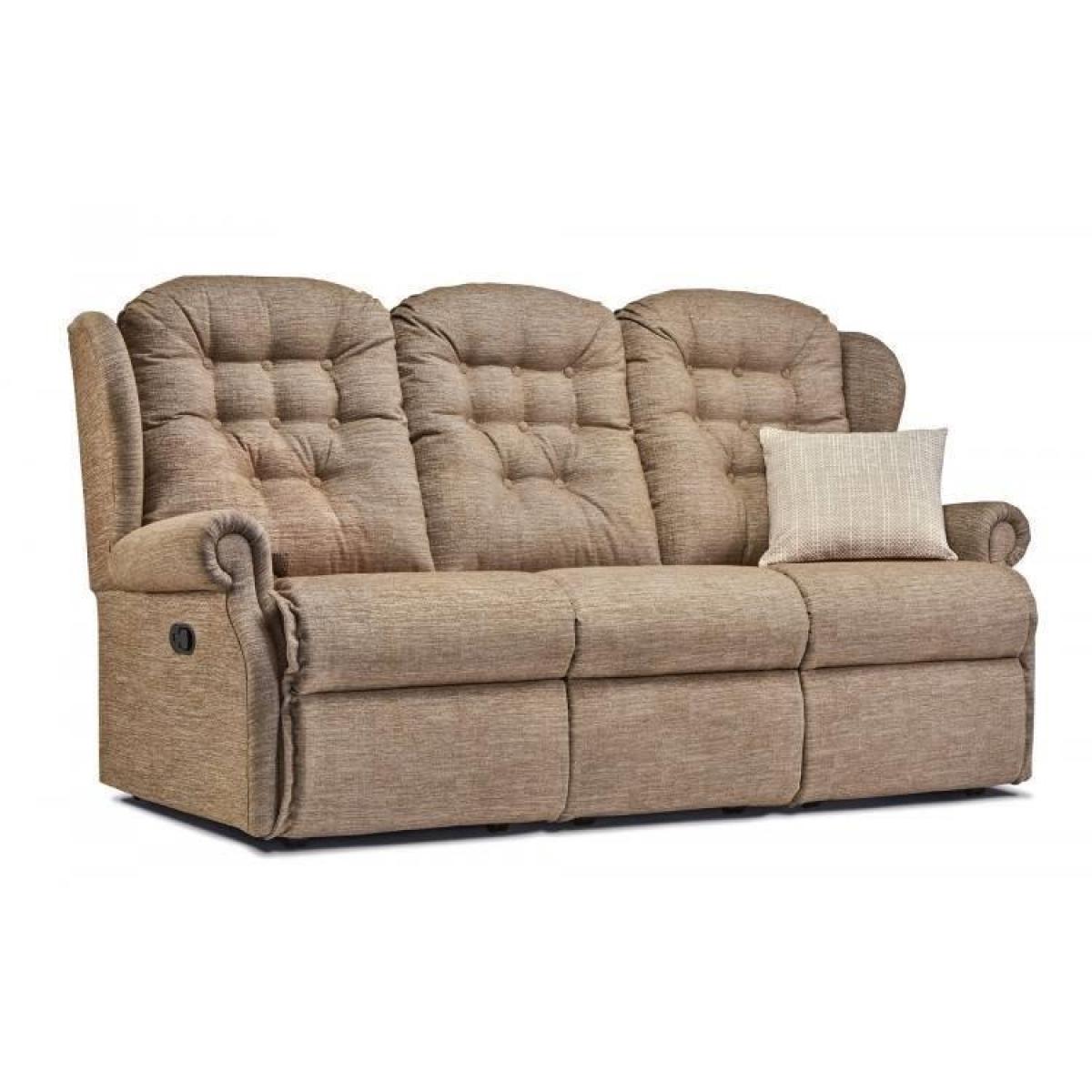 The Lynton recliner sofa is available in small and standard sizes, with a wide range of fabric and leather choices to choose from. Fabric ranges Atlantis, Minerva and Neptune all benefit from Aquaclean technology, giving you the reassurance that your chair will wipe clean using water only in most cases, with no need for specialist cleaning products. The Lynton has a deep buttoned back with padded winged sides for extra comfort and elegant scroll arms. This classic design will complement any traditional living space. You can put your feet up and relax with great comfort from the reflex foam and chaise seating. With a smooth recliner action your feet will be raised for you to lean back and relax. To return to an upright position press gently with your legs on the footrest. Resting on castors you will be able to move around with ease for cleaning or rearranging whenever the mood takes you. Hand-built with joints that are glued and screwed for strength and durability Seat cushions are fixed and filled with reflex foam and full sprung seating that bounces back into place Back cushions are fixed and filled with a firm and supportive fibre Supplied with removable backs to make delivering into your home so much easier Available in a wide range of fabrics and leathers Manufactured in the UK 5 year manufacturers guarantee Small 3 Seater Dimensions: Height 104cm Width 193.5cm Depth 90cm Seat Height 49cm Seat Width 159.5cm Seat Depth 51cm All screens vary in colour reproduction and whilst every effort has been made to display the colour as accurately as possible it is for guidance only. If you require material swatches sending out in the post please do email us and select 'online enquiry' as your enquiry type.