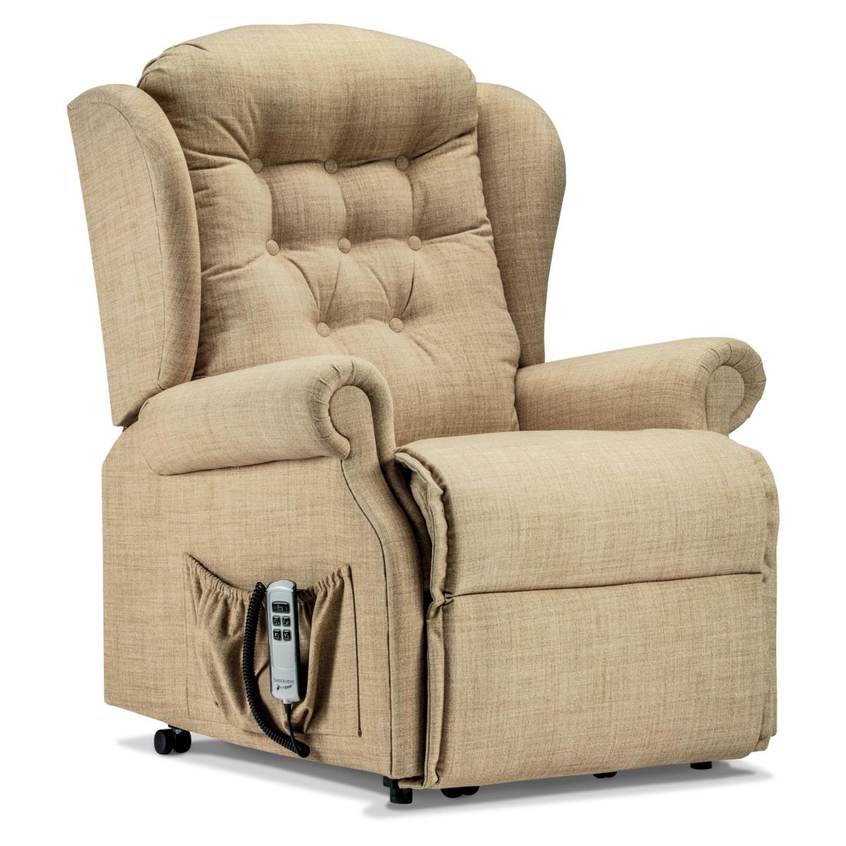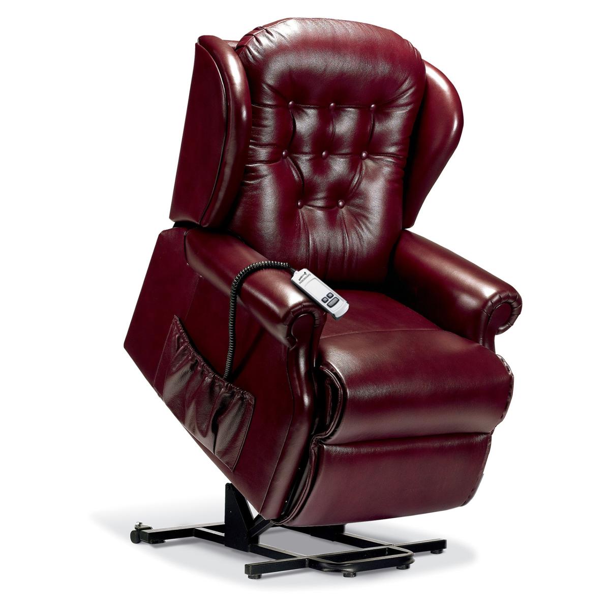 The attractive scroll arms of the Lynton are complemented by useful wings, ‘chaise’ seating and a welcoming fibre-filled back cushion. Wonderfully comfortable the Lynton Electric Riser Recliner also available in Small, Standard and Royale sizes. SINGLE and DUAL motor options available The Single Motor and Dual Motor actions both lift and tilt the Recliner forwards so that getting in and out is the easiest thing imaginable. This full powerlift facility is designed to assist sufferers of arthritis, rheumatism, MS, poor circulation and many other mobility restrictions. The smooth and easy Single Motor action enables the footrest to be fully raised before the back starts reclining. It also allows the sleeping position to be reached (less reclined than on Dual Motor designs) from a starting position 20cm (8″) from the wall. The sophisticated Dual Motor mechanism enables you to control the backrest and footrest independently to reach the exact position you want including a near-horizontal full sleeping position (needs a 38cm (15″) gap from the wall). Features: Show in Highland Beige fabric and Antique Red leather Designed with full powerlift facility to assist sufferers of arthritis, rheumatism, MS, poor circulation and many other mobility restrictions 5 Year Guarantee on all Recliner actions, frames, motors, handsets and all other electrical parts Single-use Emergency Back-up fitted as standard Supplied with castors for ease of movement. Front castors lift away to ensure stability in raised positions. Supplied with removable back to make the task of delivering the Recliner into your home so much easier Maximum recommended weight 160kg (25 stone) Choice of Soft Covers or Leather Standard Chair Dimensions: Height: 107.5cm Width: 81.5cm Depth: 92.5m Seat Height: 49cm Seat Width: 47.5cm Seat Depth: 53.5cm All screens vary in colour reproduction and whilst every effort has been made to display the colour as accurately as possible it is for guidance only.