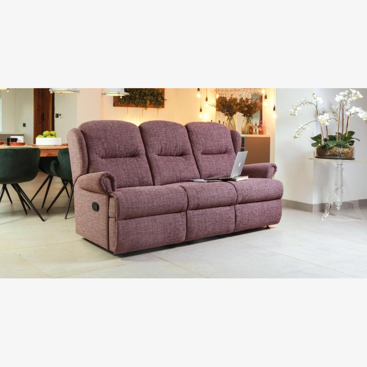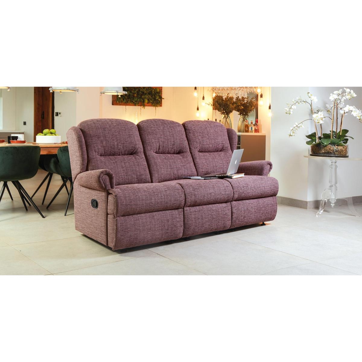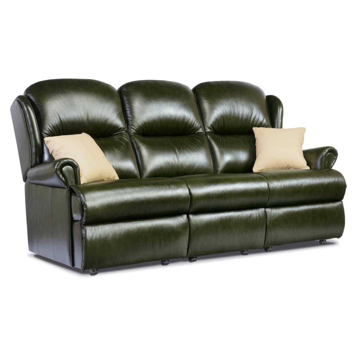 With attractive scroll arms, full-width ‘chaise’ seating and soft, fibre-filled backs for excellent head and lumbar support. Using the same super-smooth actions as the Recliner Chairs, this Malvern Reclining Settee from Sherborne is supplied in two easy bolt-together sections with removable backs. Small 3 Seater Sofa Dimensions: Height: 102.5cm Width: 196cm Depth: 96.5cm Seat Height: 49cm Seat Width: 161cm Seat Depth: 52cm Standard 3 Seater Sofa Dimensions: Height: 106cm Width: 203.5cm Depth: 99.5cm Seat Height: 49cm Seat Width: 168.5cm Seat Depth: 54.5cm Features: Shown in Ravello Plum fabric and in Manhattan Cream and Antique Green leather 5 Year Guarantee on all actions, frames and electrical parts The manual recliners and reclining settees can be chosen with either Finger-release Catches or Handle Release Choice of Leather or Soft Covers All screens vary in colour reproduction and whilst every effort has been made to display the colour as accurately as possible it is for guidance only.