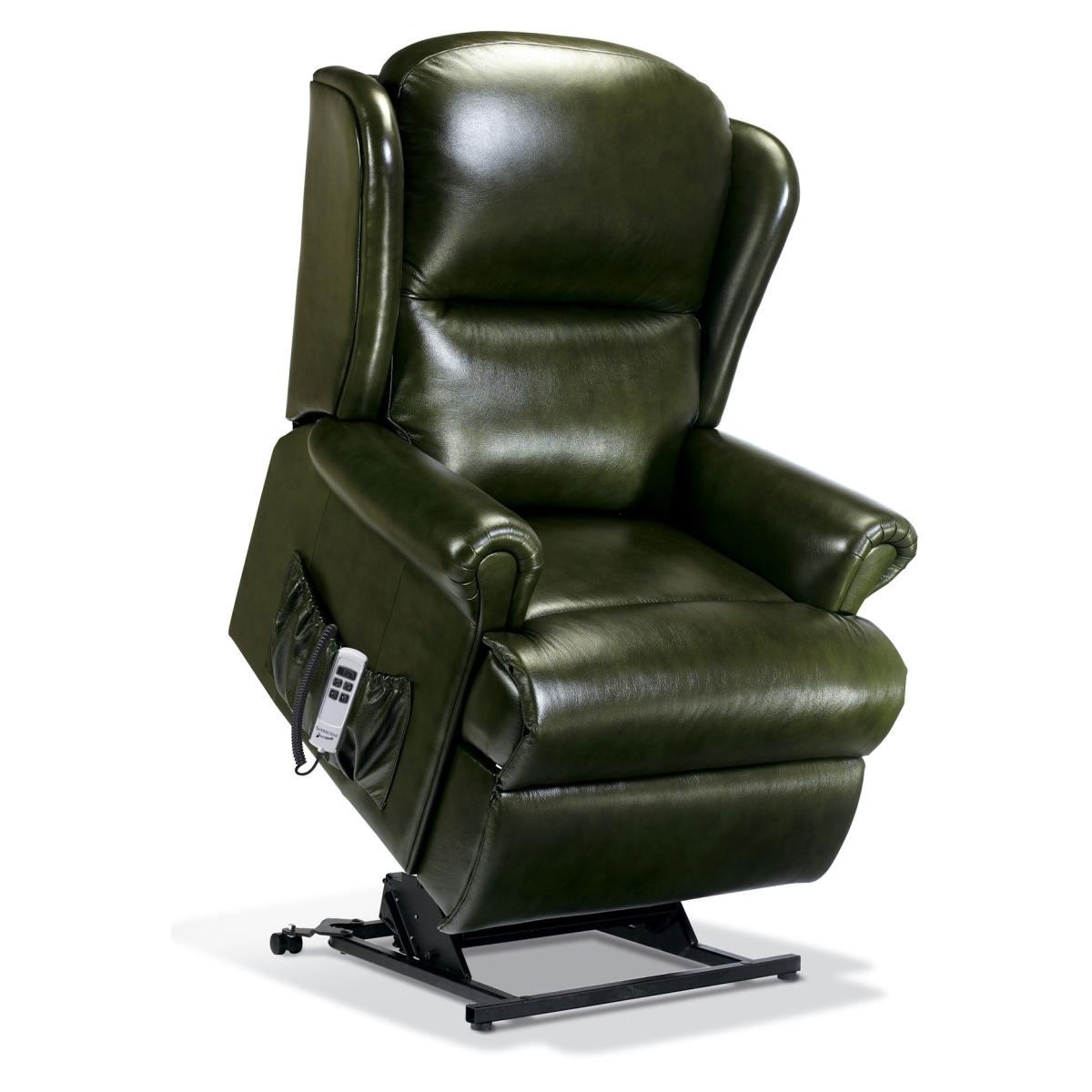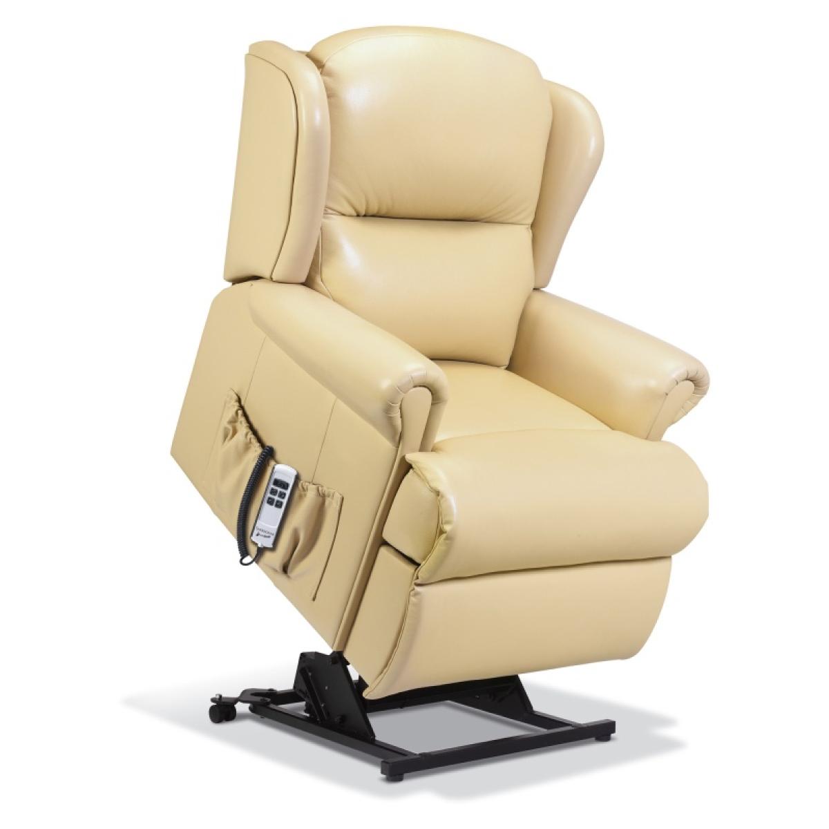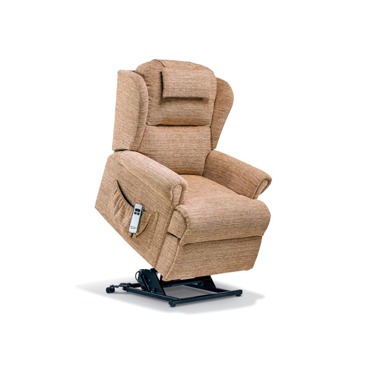 Wonderfully comfortable, the Sherborne Malvern Electric Riser Recliner is available in Petite, Small, Standard and Royale sizes. Features attractive scroll arms, full-width ‘chaise’ seating and a soft, fibre-filled back for excellent head and lumbar support. SINGLE and DUAL motor options available The Single Motor and Dual Motor actions both lift and tilt the Recliner forwards so that getting in and out is the easiest thing imaginable. This full powerlift facility is designed to assist sufferers of arthritis, rheumatism, MS, poor circulation and many other mobility restrictions. The smooth and easy Single Motor action enables the footrest to be fully raised before the back starts reclining. It also allows the sleeping position to be reached (less reclined than on Dual Motor designs) from a starting position 20cm (8″) from the wall. The sophisticated Dual Motor mechanism enables you to control the backrest and footrest independently to reach the exact position you want including a near-horizontal full sleeping position (needs a 38cm (15″) gap from the wall). Features: Shown in Ancona Oatmeal and Finsbury Salmon fabrics and in Manhattan Cream and Antique Green leathers Designed with full powerlift facility to assist sufferers of arthritis, rheumatism, MS, poor circulation and many other mobility restrictions 5 Year Guarantee on all Recliner actions, frames, motors, handsets and all other electrical parts Single-use Emergency Back-up fitted as standard Supplied with castors for ease of movement. Front castors lift away to ensure stability in raised positions. Supplied with removable back to make the task of delivering the Recliner into your home so much easier Maximum recommended weight 160kg (25 stone) Choice of Soft Covers or Leather Petite Chair Dimensions: Height: 97cm Width: 79cm Depth: 91.5cm Seat Height: 45.5cm Seat Width: 46cm Seat Depth: 50cm Small Chair Dimensions: Height: 102cm Width: 81cm Depth: 96.5cm Seat Height: 49cm Seat Width: 46cm Seat Depth: 52cm Standard Chair Dimensions: Height: 105.5cm Width: 83.5cm Depth: 99.5cm Seat Height: 49cm Seat Width: 48.5cm Seat Depth: 54.5cm Royale Chair Dimensions: Height: 111.5cm Width: 88.5cm Depth: 102cm Seat Height: 49cm Seat Width: 53.5cm Seat Depth: 56cm All screens vary in colour reproduction and whilst every effort has been made to display the colour as accurately as possible it is for guidance only.