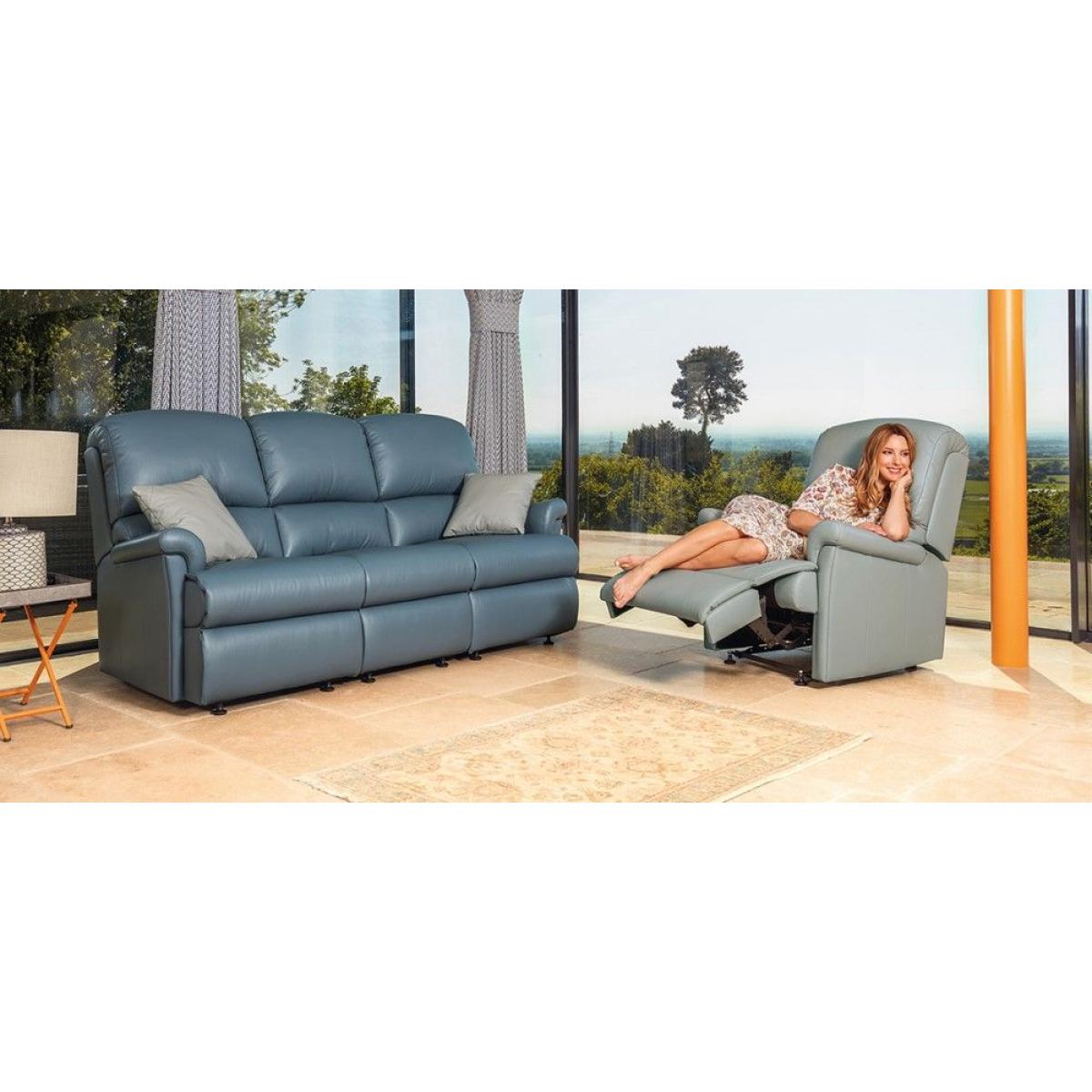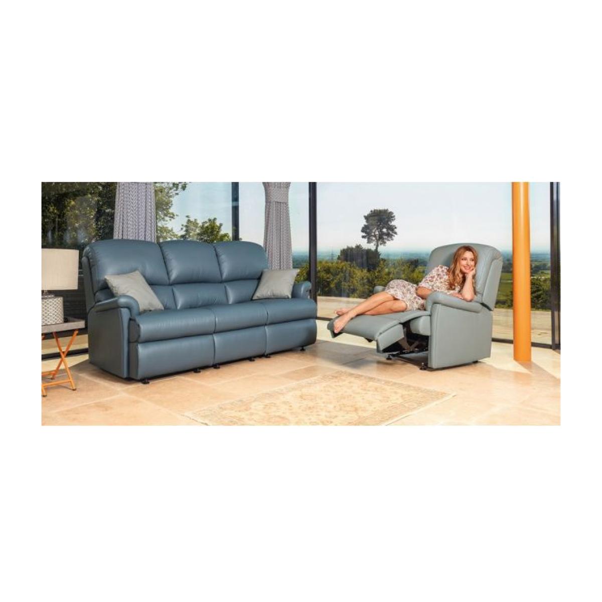 The Nevada Collection offers exceptional comfort with its soft, welcoming back design and soft 'pillow' arms. Available in a comprehensive array of sizes and options with manual and power reclining actions across the entire range. Complimenting the traditional range items are a selection of riser recliners which are available in 4 sizes and both single and dual motor versions. Note that all models in the Nevada Collection feature a sectional construction to aid delivery. Shown on Glides in Queensbury Wedgwood with Standard Recliner and Scatter Cushions in Queensbury Grey. The Nevada’s exceptionally comfortable back design is complemented by soft ‘pillow’ arms and full-width ‘chaise’ seating. Supplied in three easy bolt-together sections with removable Recliner backs for ease of delivery. Width 197.5cm Depth 97cm Height 101.5cm Choice of Soft Covers or Leather