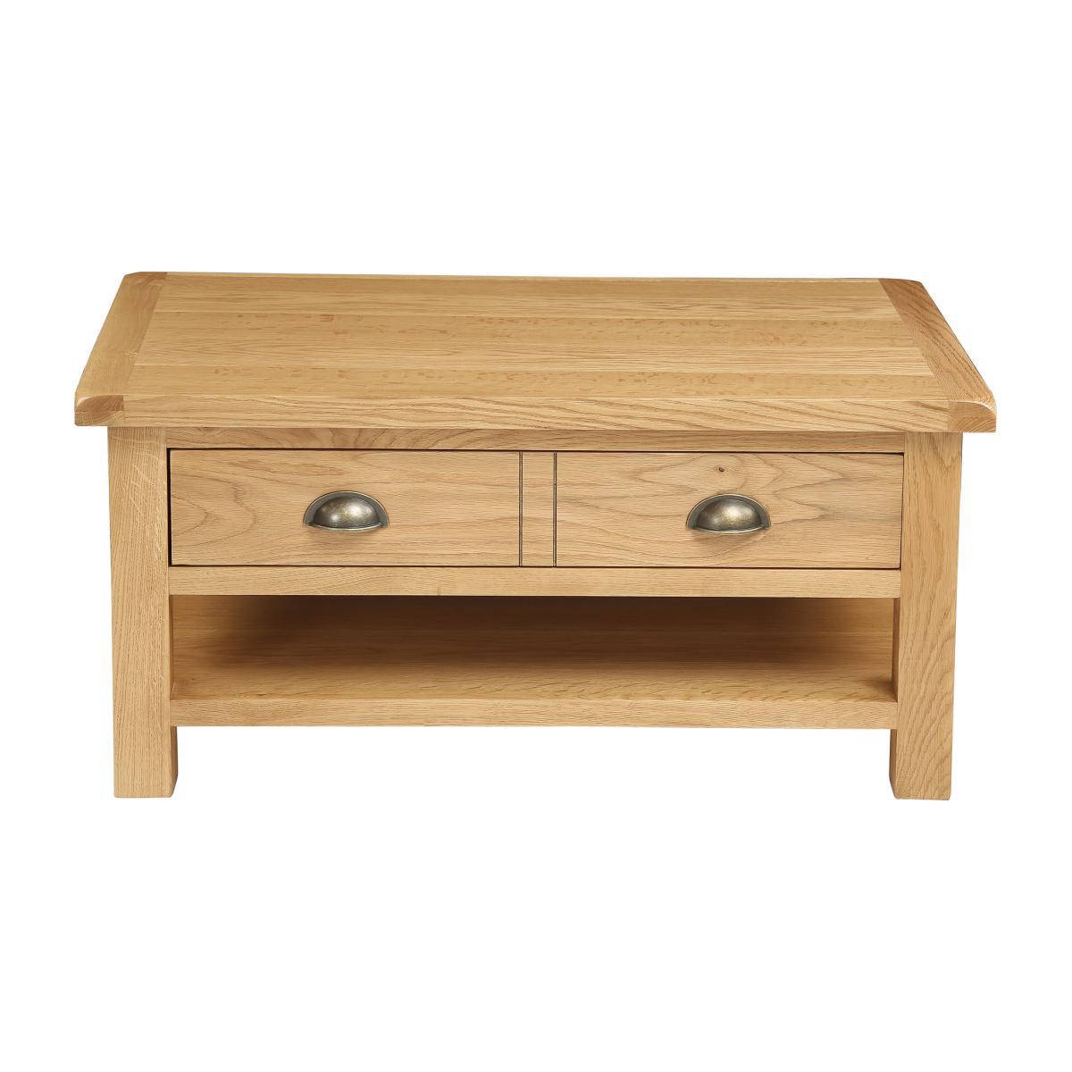 Dunelm Exclusive - Designed and Developed by Dunelm. Made from solid oak and oak veneers, the Sherbourne range is inspired by a clean, simplistic styling. Fashioned with a warm natural colourway, the Sherbourne range offers a hardwearing lacquer finish to bring out the colour variations of real wood veneer. Beautifully designed with pine drawer boxes and antique metal cup handles, this fully assembled coffee table features one large drawer with a unique runner mechanism, which allows you to access the drawer from both sides and a lower storage shelf for additional space.
