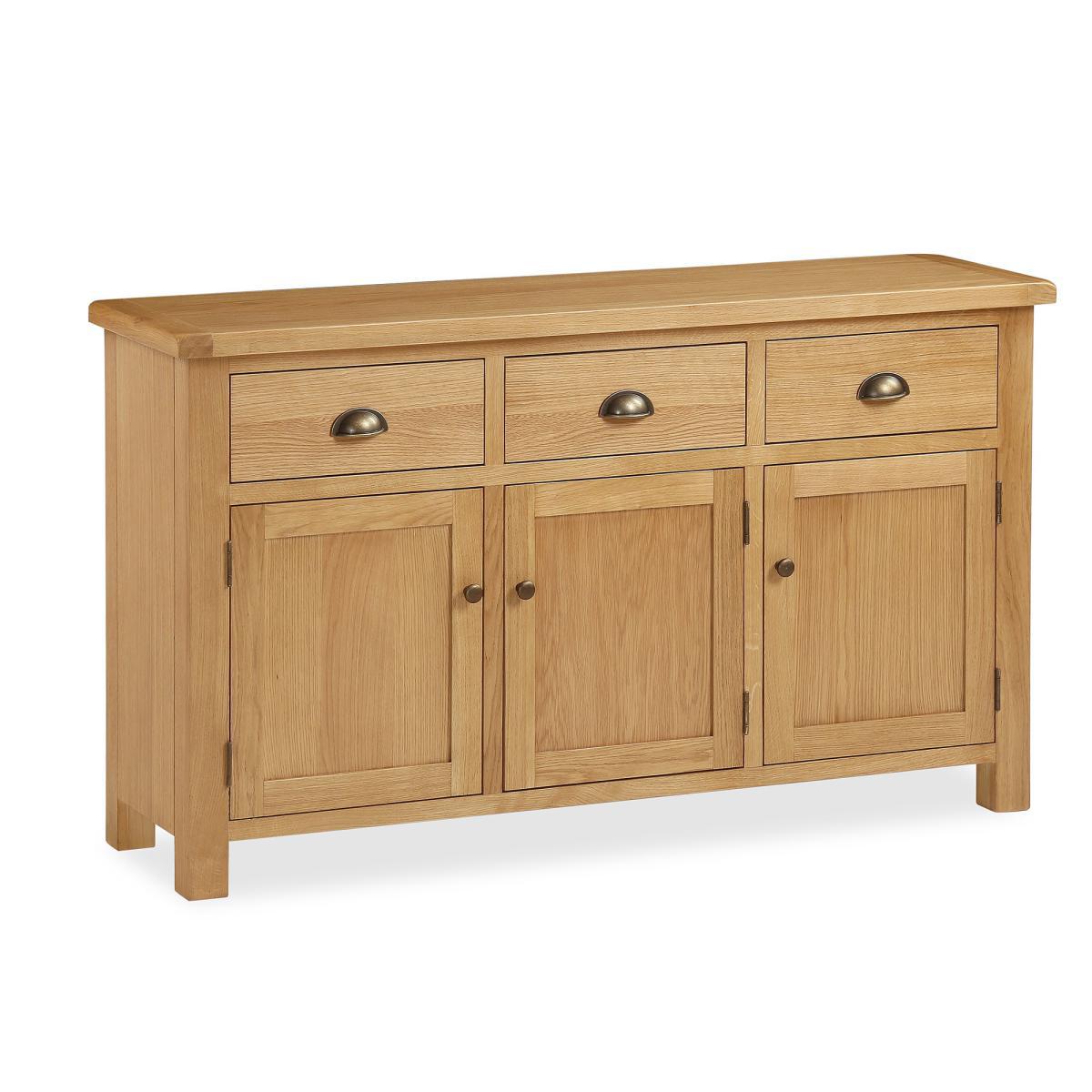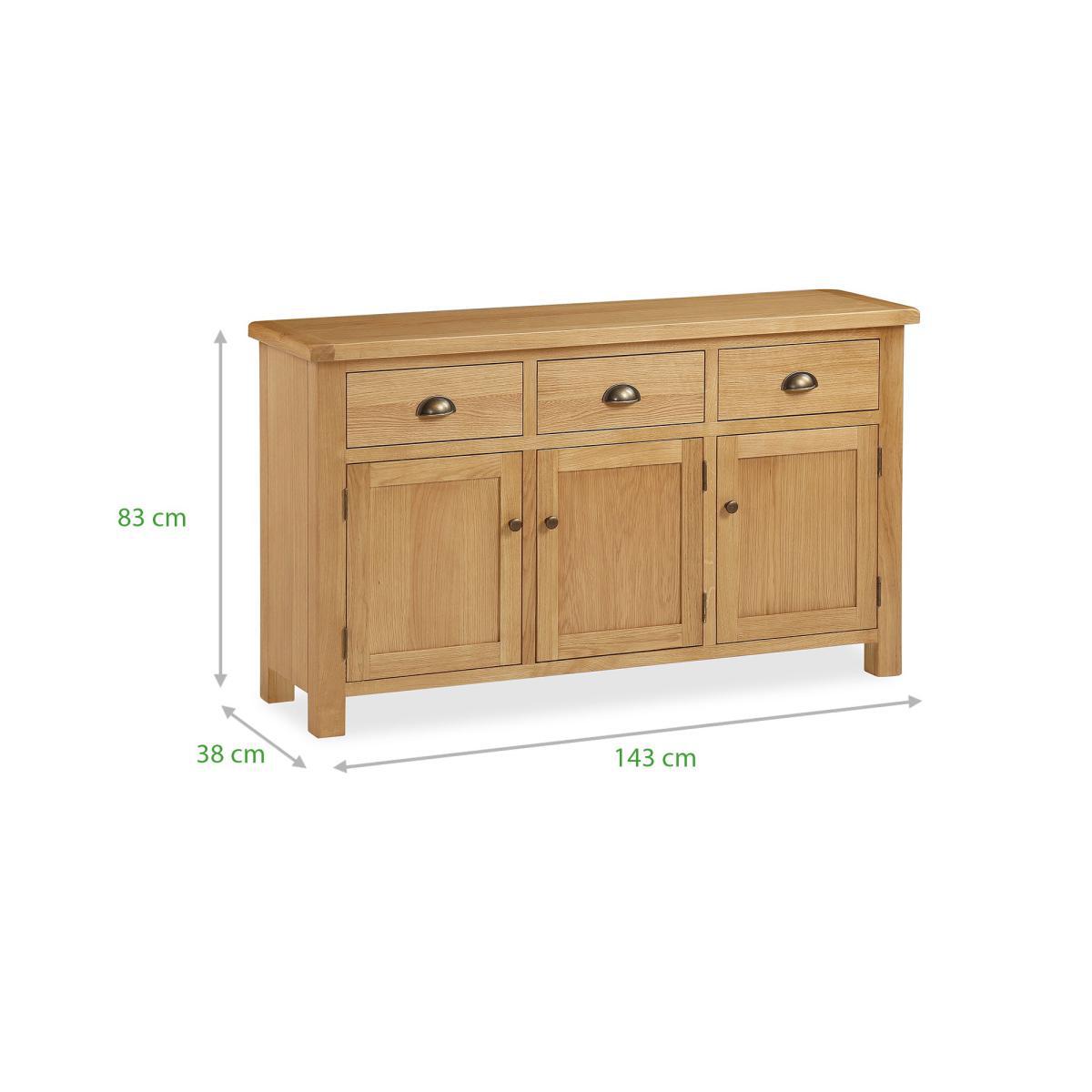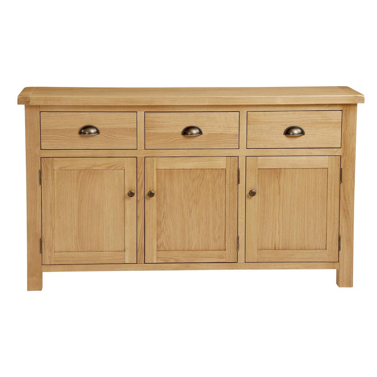 Dunelm Exclusive - Designed and Developed by Dunelm. Made from solid oak and oak veneers, the Sherbourne range is inspired by a clean, simplistic styling. Fashioned with a warm natural colourway, the Sherbourne range offers a hardwearing lacquer finish to bring out the colour variations of real wood veneer. Featuring three spacious drawers made with pine wood and one full length fixed shelf inside a double and single door cupboard. Designed with solid oak edging on the legs and top surface, this fully assembled sideboard is complete with antique metal cup handles and doorknobs.