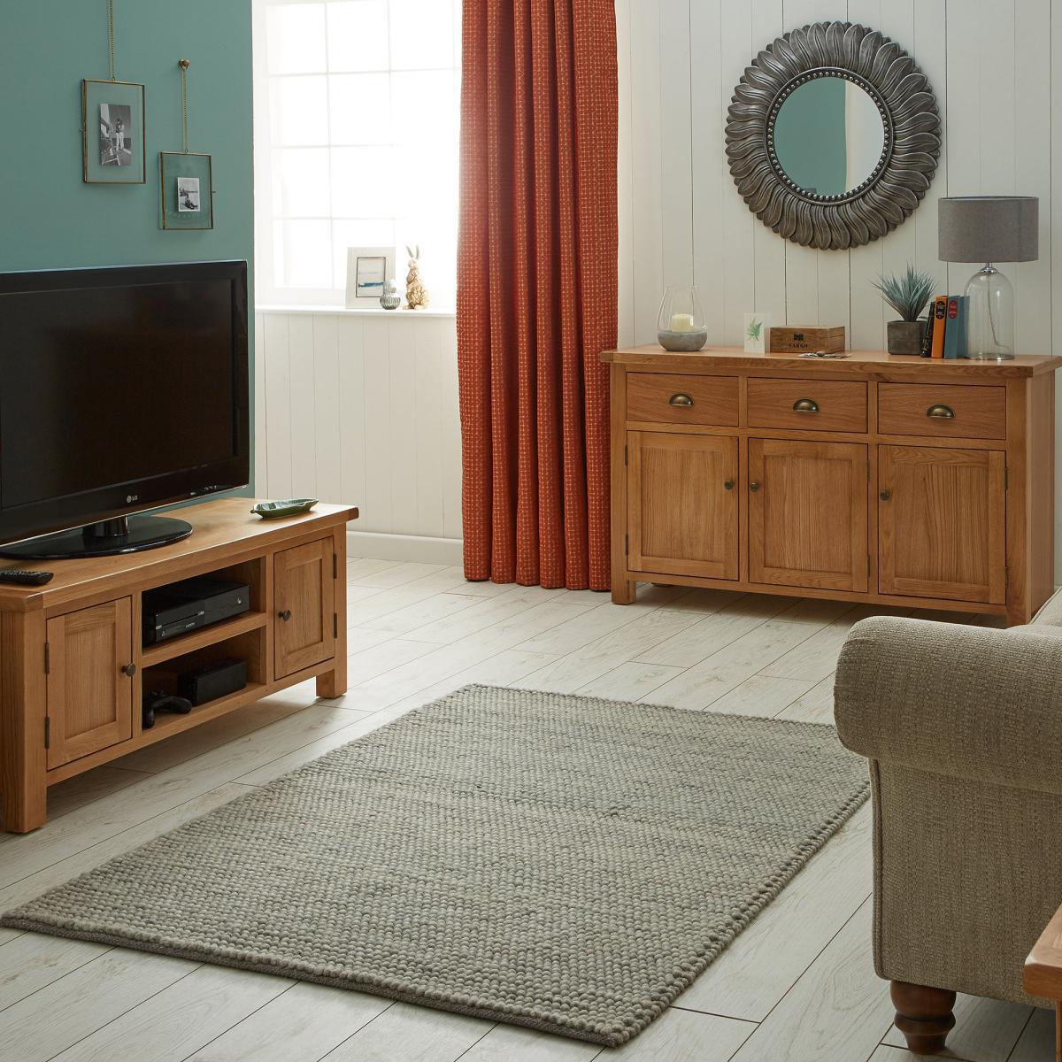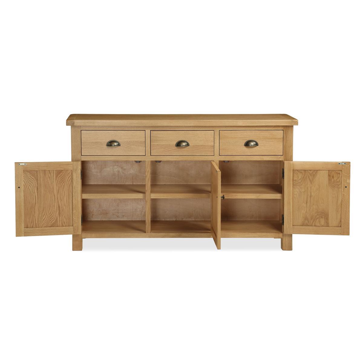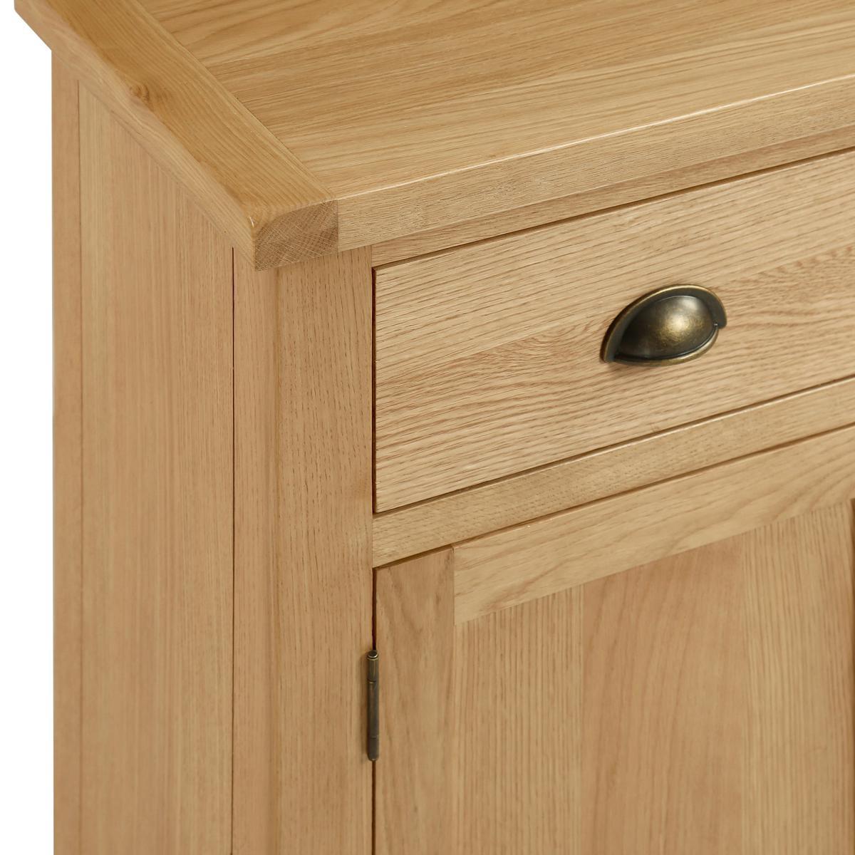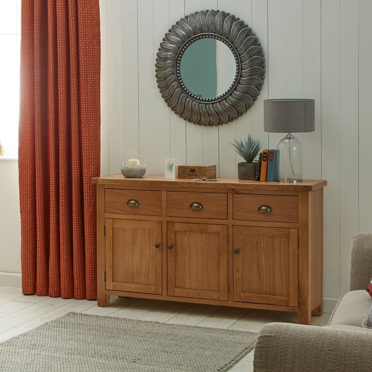 Dunelm Exclusive - Designed and Developed by Dunelm. Made from solid oak and oak veneers, the Sherbourne range is inspired by a clean, simplistic styling. Fashioned with a warm natural colourway, the Sherbourne range offers a hardwearing lacquer finish to bring out the colour variations of real wood veneer. Featuring three spacious drawers made with pine wood and one full length fixed shelf inside a double and single door cupboard. Designed with solid oak edging on the legs and top surface, this fully assembled sideboard is complete with antique metal cup handles and doorknobs.