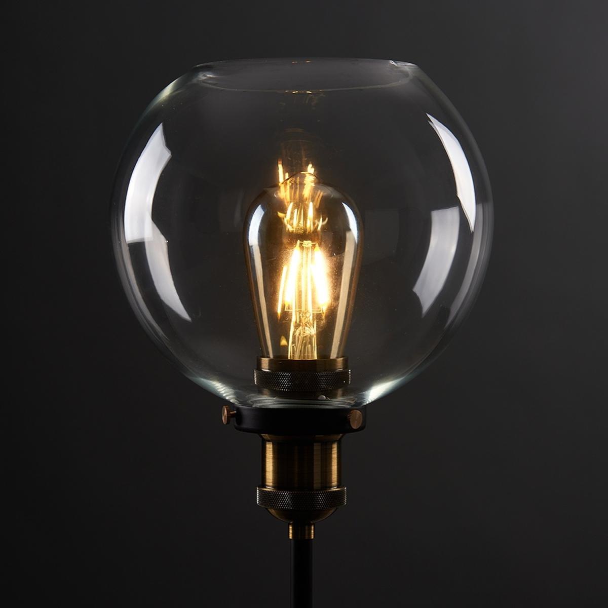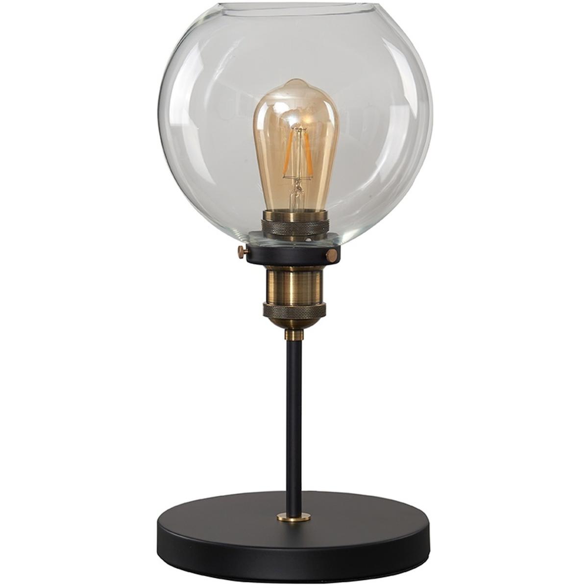 Industrial style table lamp in a contrasting black and gold effect metal finish, featuring a clear glass globe shaped light shade. The transparent open design helps shade the bulb whilst allowing light to disperse effectively and evenly throughout the room. This shade compliments the style of the fitting perfectly and will be a statement piece for any room. Complete with an in-line onoff switch. Ideal for use in hallways, living rooms, bedrooms and other living areas. Table lamps are brilliant as complementary lighting and are perfect to light up dull corners.
