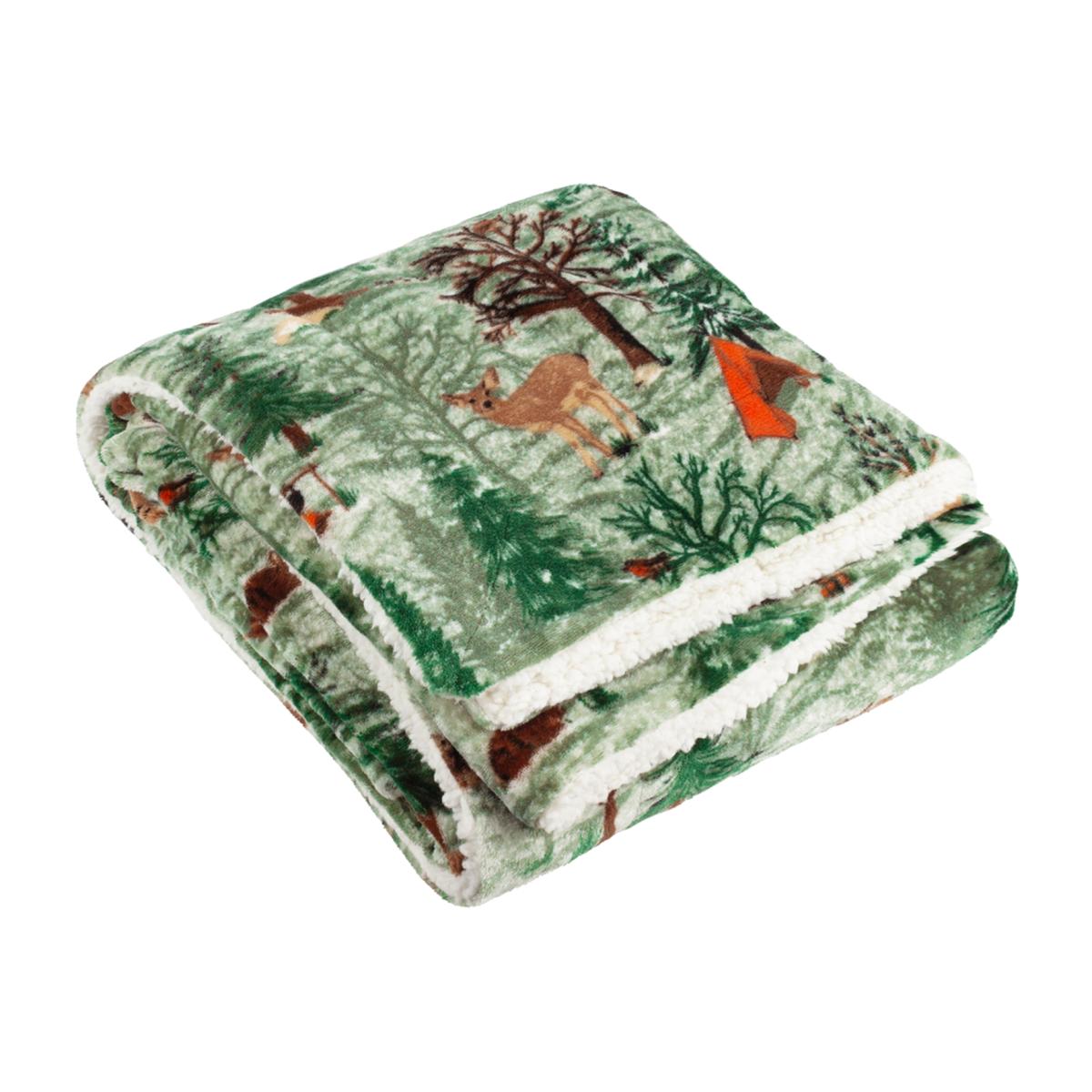 Inspired by woodland walks in winter. Natural, soft greens are found in our forests. The Lodge Wood throw features a cosy campfire and woodland animal scene. Complete with a sherpa fleece reverse, keeping you lovely and warm in the colder months.