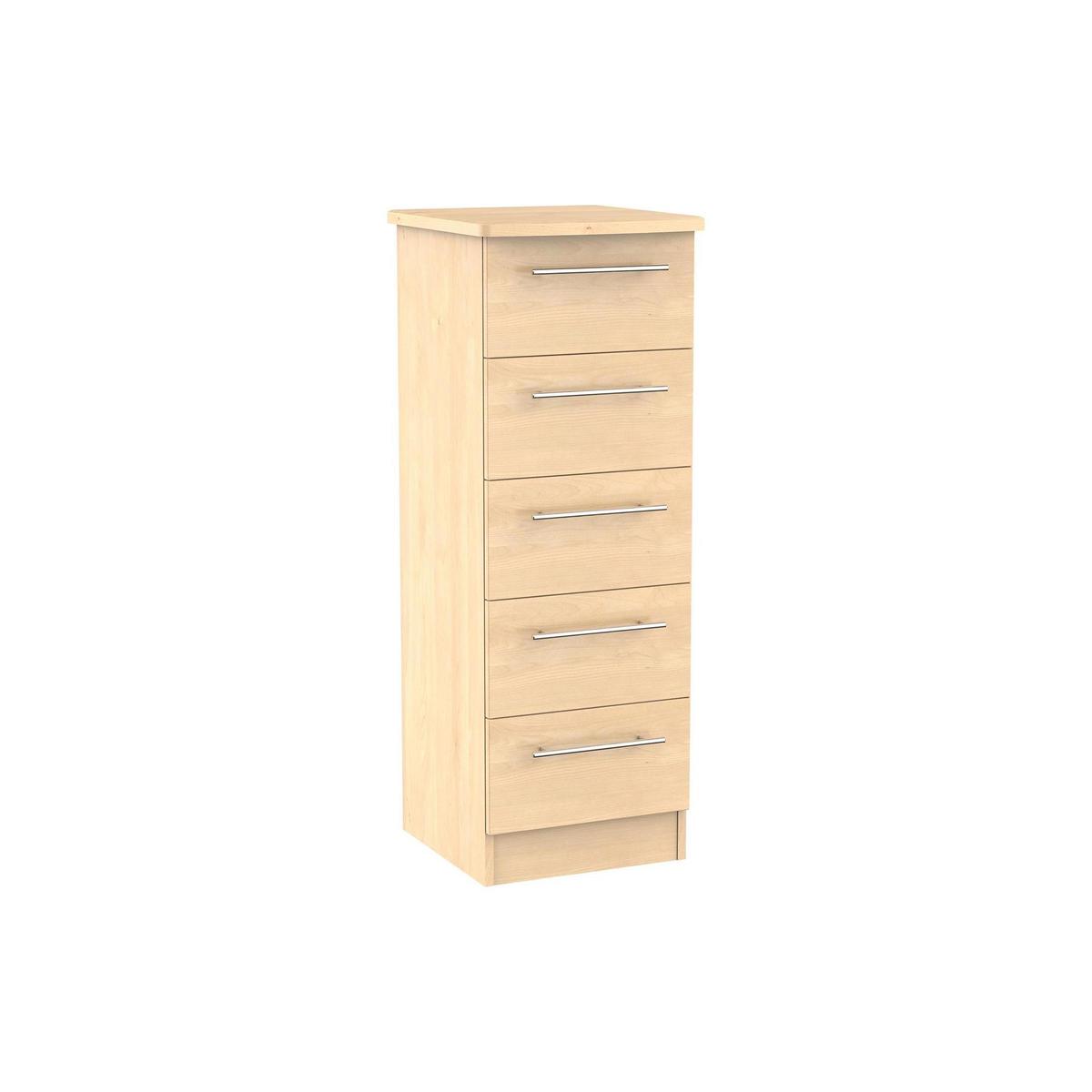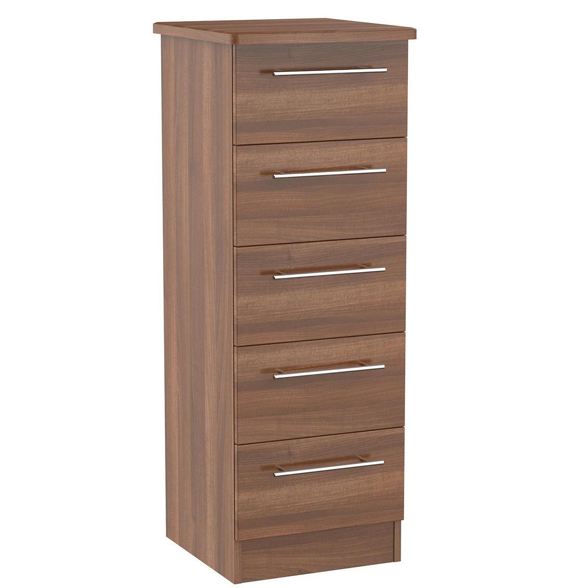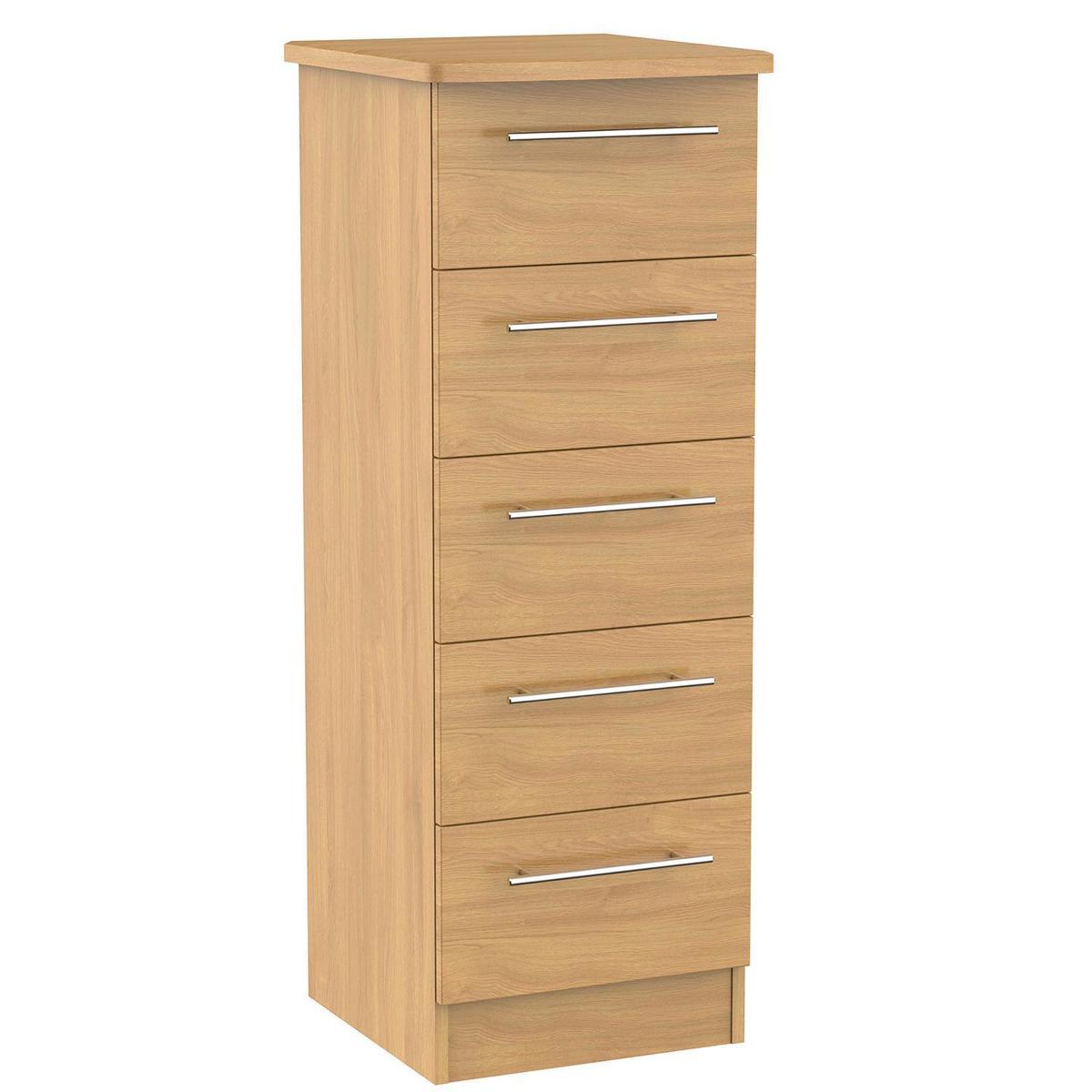 For value and high quality craftsmanship, look no further than the Sherwood 5 Drawer Tallboy. This fantastic tallboy unit houses five roomy drawers and comes with a choice of oak, maple or walnut finishes. This piece’s clean lines and sleek brushed steel handles give it a look of understated class, while each of the spacious drawers in this piece feature smooth, long-lasting metal runners. With it’s refined looks this tall chest of drawers will be at home in both modern or traditional bedroom styles. Part of the Sherwood bedroom furniture range the Sherwood 5 Drawer Tallboy will match all the items in this collection particularly well, or as a single addition to your existing bedroom set-up. This item comes fully assembled, so no cutting or drilling is required and it’s ready for use upon delivery. Please Note: Product features a curved top edge. Please Note: Some of our assembled furniture is quite large, please fully check the dimensions to ensure that your furniture will fit in your room without difficulty. Approximate dimensions are listed, please be aware that these may vary slightly. To make delivery easier the majority of our assembled furniture comes with the handles detached, these can be easily reattached once the item is unwrapped. Installation Note: This product should be fixed to a wall using a wall fastener Please note, unfortunately we cannot deliver this item to Northern Ireland and the Channel Islands.