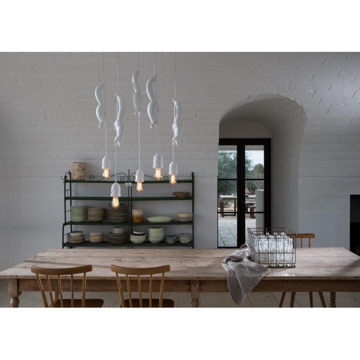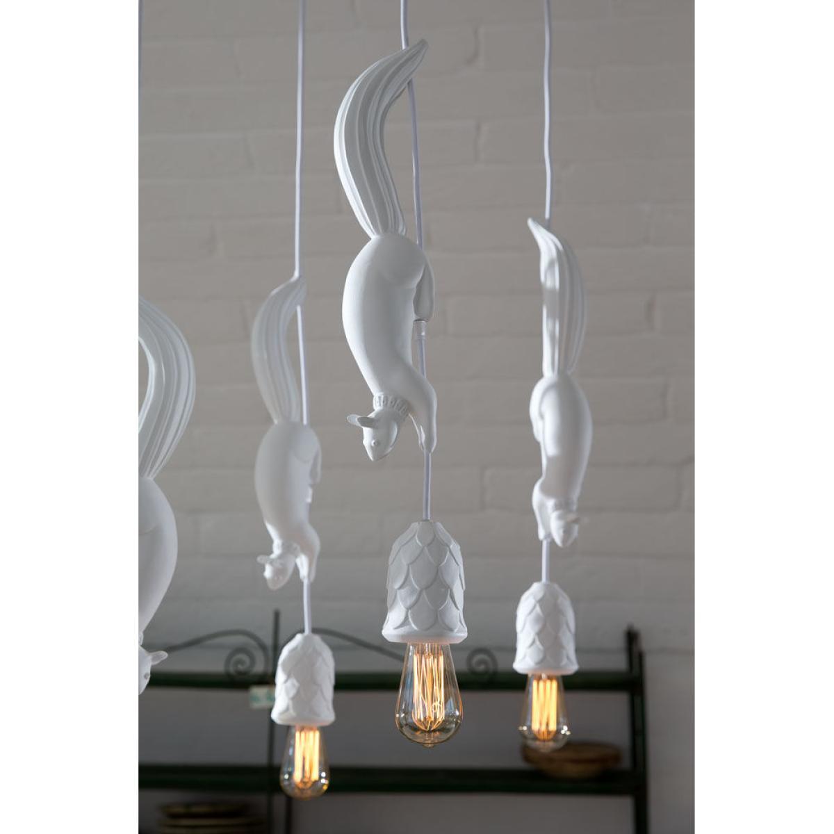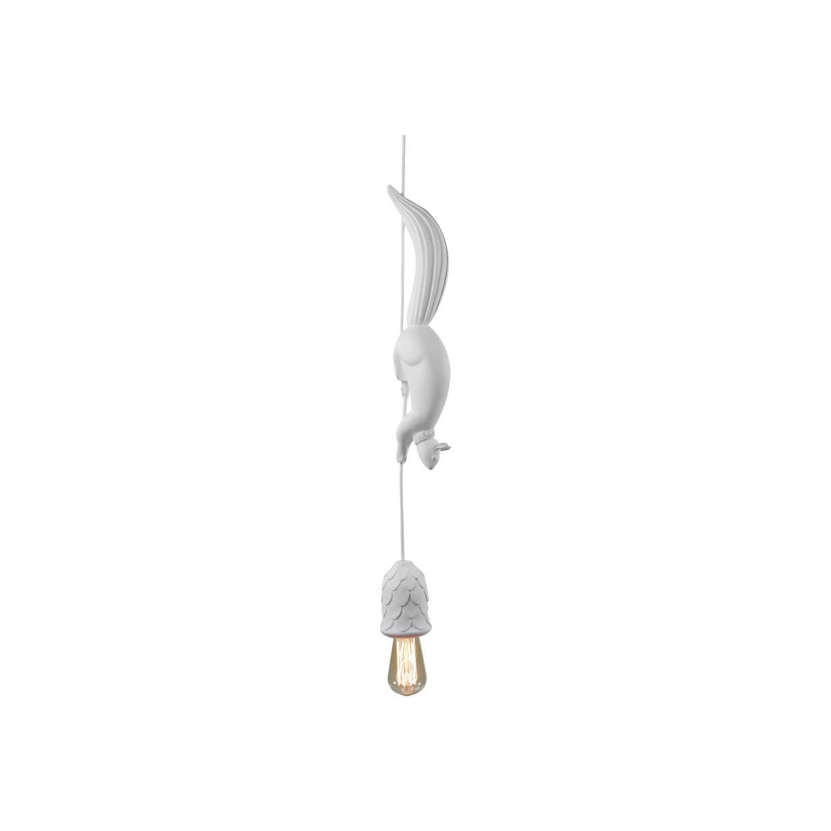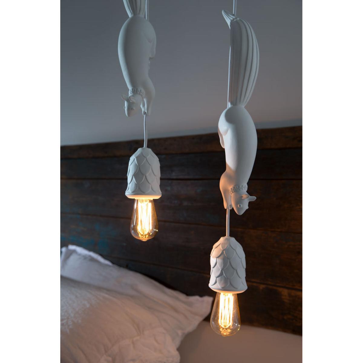 Add a touch of surreal nature with the Sherwood and Robin pendant. Matteo Ugolini created a fun, poetic lamp representing Robin, a thieving squirrel who lurked in the shadows of Sherwood Forest, where the famous Robin Hood was hiding. At the end of the cable is a nice pine cone, serving as a lampshade, which attracts the squirrel’s attention. Imitating the legendary hero, it’s surprising to imagine him running along the cable to try to recover it and then give it to those in need. This joyful pendant is equipped with a metal ceiling rose and fabric cable, while all the other elements are made of white ceramic with a superb matt finish. As both a decorative element and a light source, Sherwood and Robin bring character to any of your rooms. What’s more, its magical world and captivating design will appeal to both young and old alike! The Sherwood and Robin pendant is also available in a version with two squirrels or even with no squirrels at all. Contact us for more details.