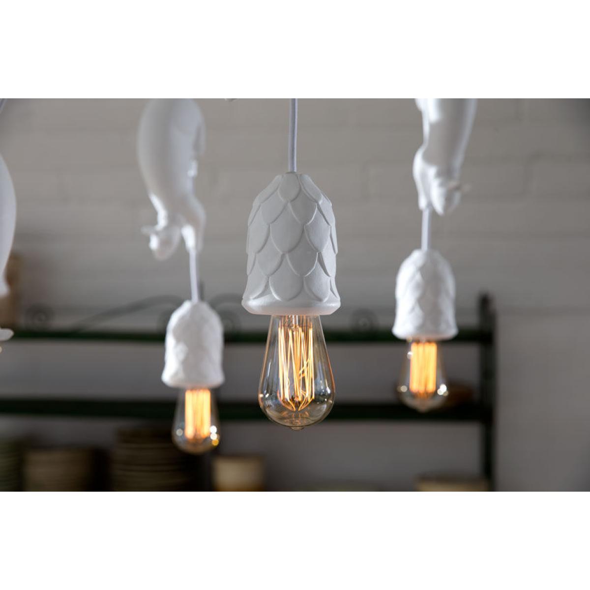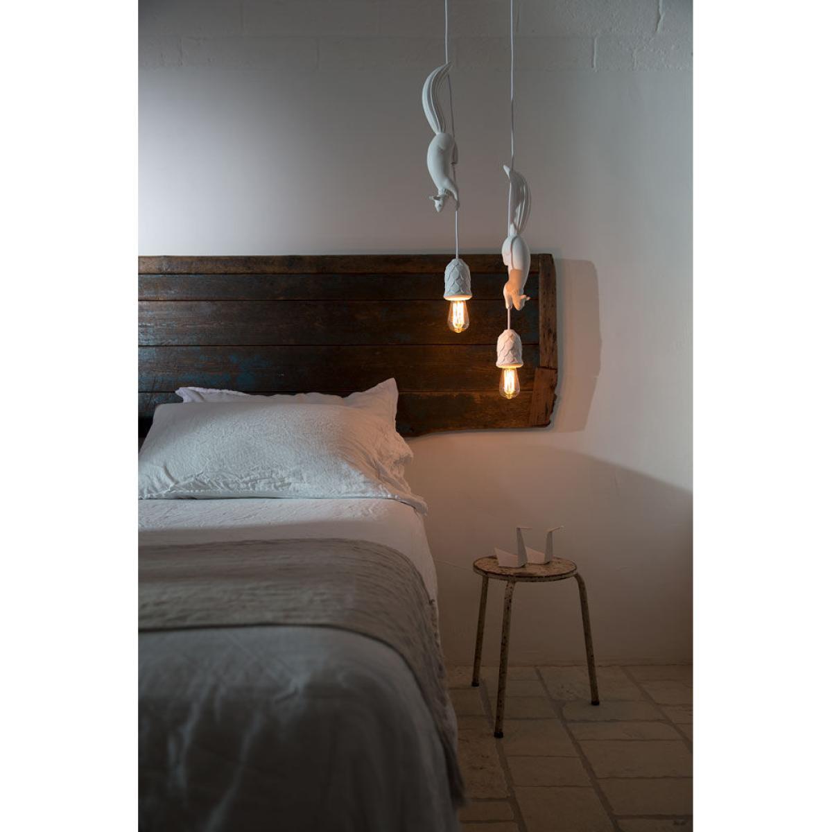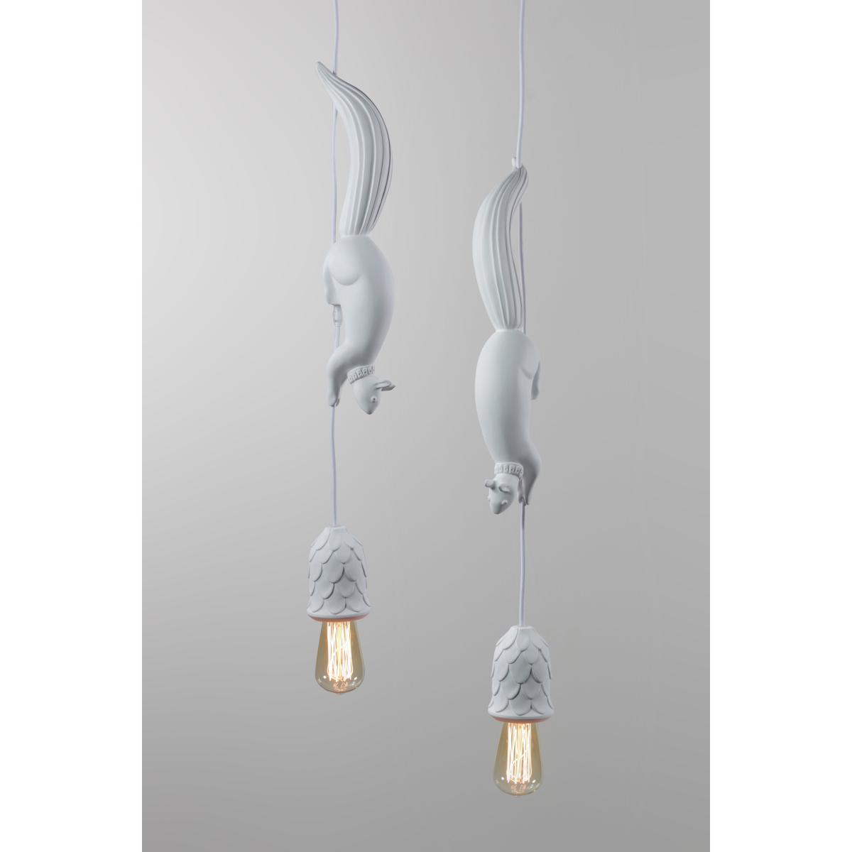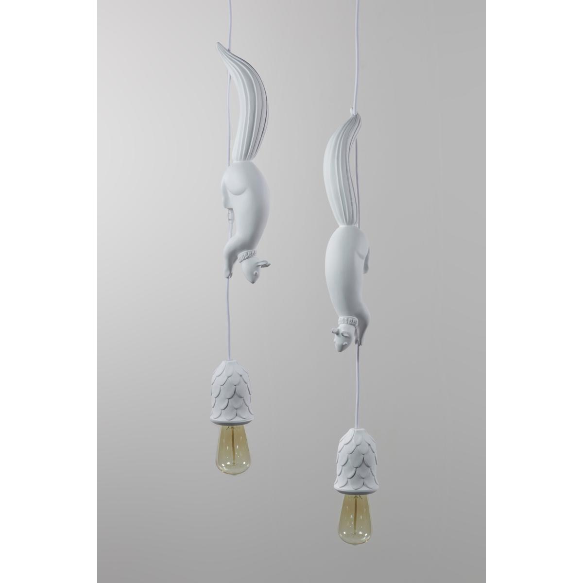 Add a touch of surreal nature with the Sherwood and Robin pendant. Matteo Ugolini created a fun, poetic lamp representing Robin, a thieving squirrel who lurked in the shadows of Sherwood Forest, where the famous Robin Hood was hiding. At the end of the cable is a nice pine cone, serving as a lampshade, which attracts the squirrel’s attention. Imitating the legendary hero, it’s surprising to imagine him running along the cable to try to recover it and then give it to those in need. This joyful pendant is equipped with a metal ceiling rose and fabric cable, while all the other elements are made of white ceramic with a superb matt finish. As both a decorative element and a light source, Sherwood and Robin bring character to any of your rooms. What’s more, its magical world and captivating design will appeal to both young and old alike! The Sherwood and Robin pendant is also available in a version with two squirrels or even with no squirrels at all. Contact us for more details.