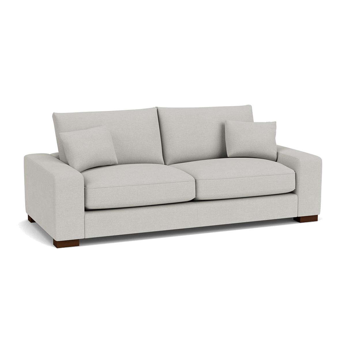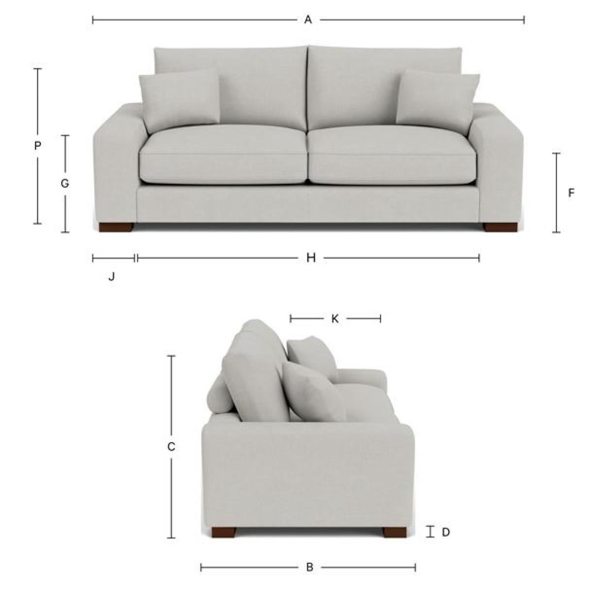 With chunky arms and feet, the Sherwood large sofa is a good-sized, traditional sofa, with feather-filled back cushions that allow you to really sit back and relax. This stylish three-Seater Sofa is available an extensive range of fabrics and leathers, so you can browse our collection to find the right choice your interior. It also comes with two scatter cushions in the same colour as your sofa. All our sofas are handmade by expert craftspeople in the UK, using a combination of traditional skills, new technology and the finest materials. External (cm): - Width (A) = 225 - Depth (B) = 105 - Height (C) = 83 Seat (cm): - Width (H) = 175 - Depth (K) = 56 - Height (F) = 45 Arm (cm): - Width (J) = 25 - Height (G) = 58 Legs (cm): - Height (D) = 11 Frame Height (without Feet): - Height (P) = 53