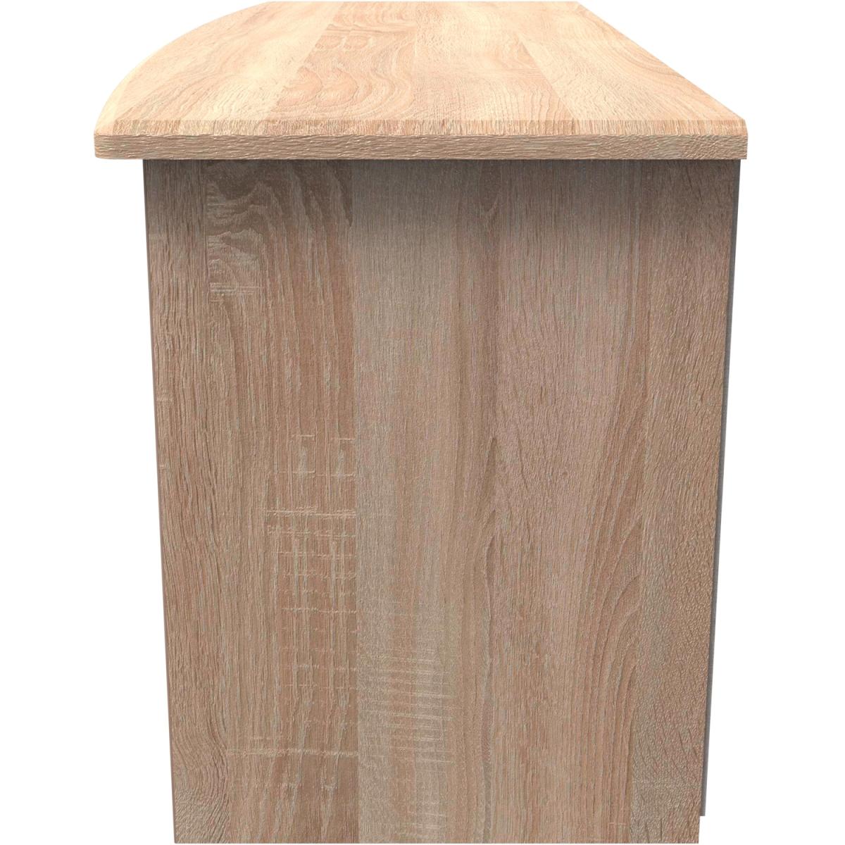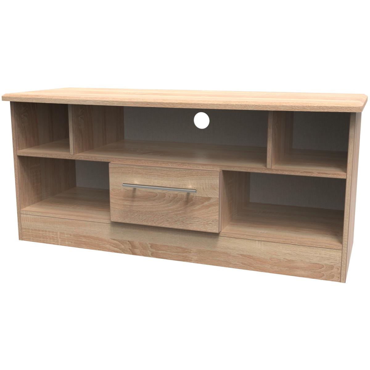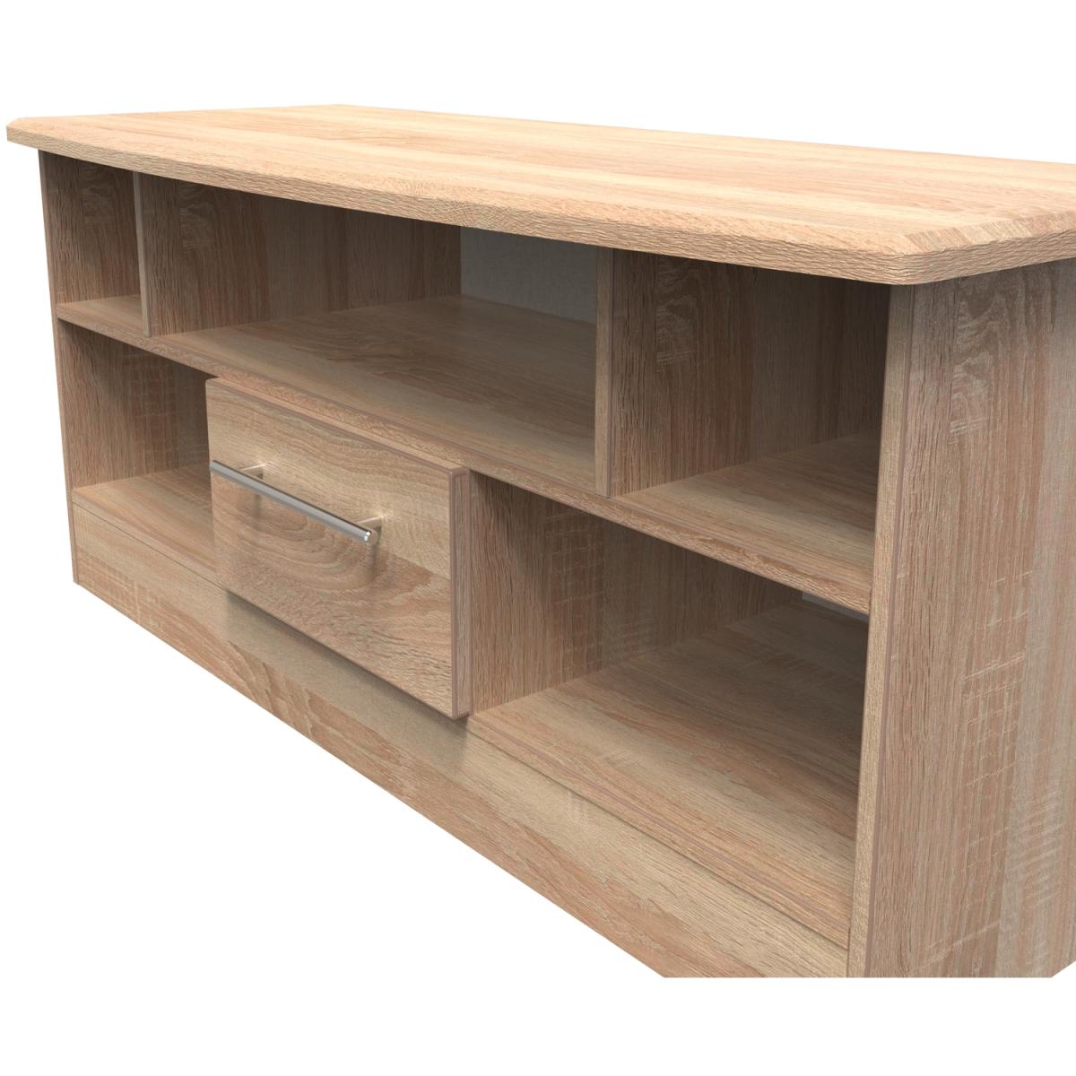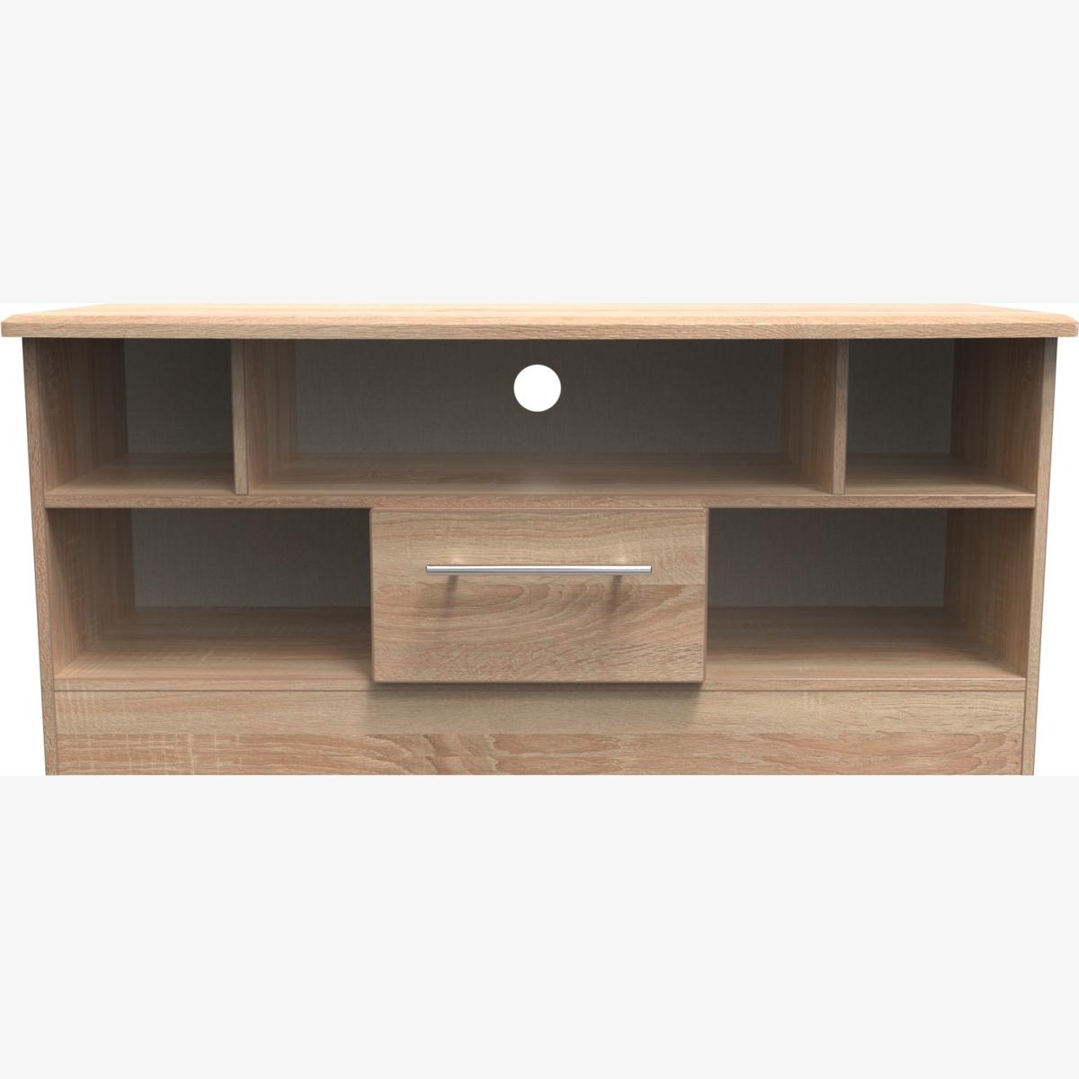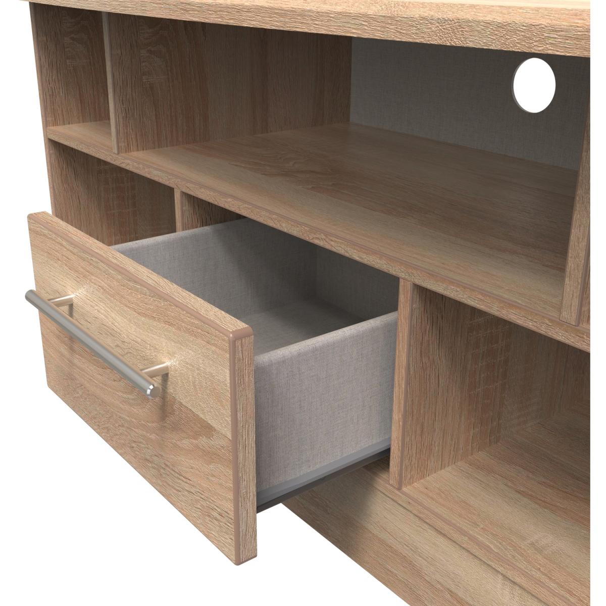 This low level TV Corner unit features plenty of open shelving and a central storage drawer and will support a flat screen TV of up to 50". The elegant, stylish Sherwood range is available in a range of durable scratch resistant natural wood or matt finishes. With metal T-Bar handles on all doors and drawers. All drawers come with long lasting metal drawer runners and a linen effect interior. All our furniture is made in the United Kingdom, to the highest quality. It is delivered direct to your location of choice by one of our two man delivery teams, and come full assembled (although legs may be removed to prevent damage in transit).