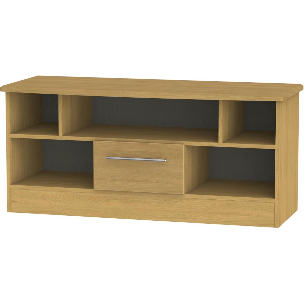 This low level TV Corner unit features plenty of open shelving and a central storage drawer and will support a flat screen TV of up to 50". The elegant, stylish Sherwood range is available in a range of durable scratch resistant natural wood or matt finishes. With metal T-Bar handles on all doors and drawers. All drawers come with long lasting metal drawer runners and a linen effect interior. All our furniture is made in the United Kingdom, to the highest quality. It is delivered direct to your location of choice by one of our two man delivery teams, and come full assembled (although legs may be removed to prevent damage in transit).