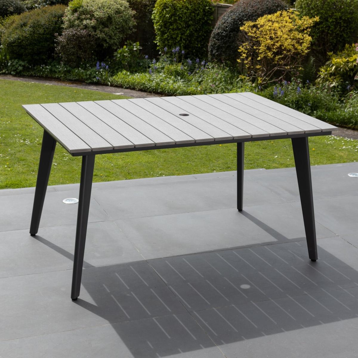 I love this outdoor dining table for its sleek, modern design and versatile colour palette, making it a great focal point for any garden or patio. Its grey and black finish brings a contemporary edge that works well with both minimalist and industrial-inspired exteriors, but it can also be easily dressed up with colourful tableware or cosy textiles for a more relaxed vibe. In terms of styling tips, pairing it with monochrome or neutral-toned outdoor chairs offers a clean look, while adding textured accessories like woven placemats or potted greenery can soften the overall aesthetic. It's practical too-its durable surface makes it perfect for outdoor use, and it’s easy to coordinate with other garden furniture for a cohesive outdoor entertaining space.