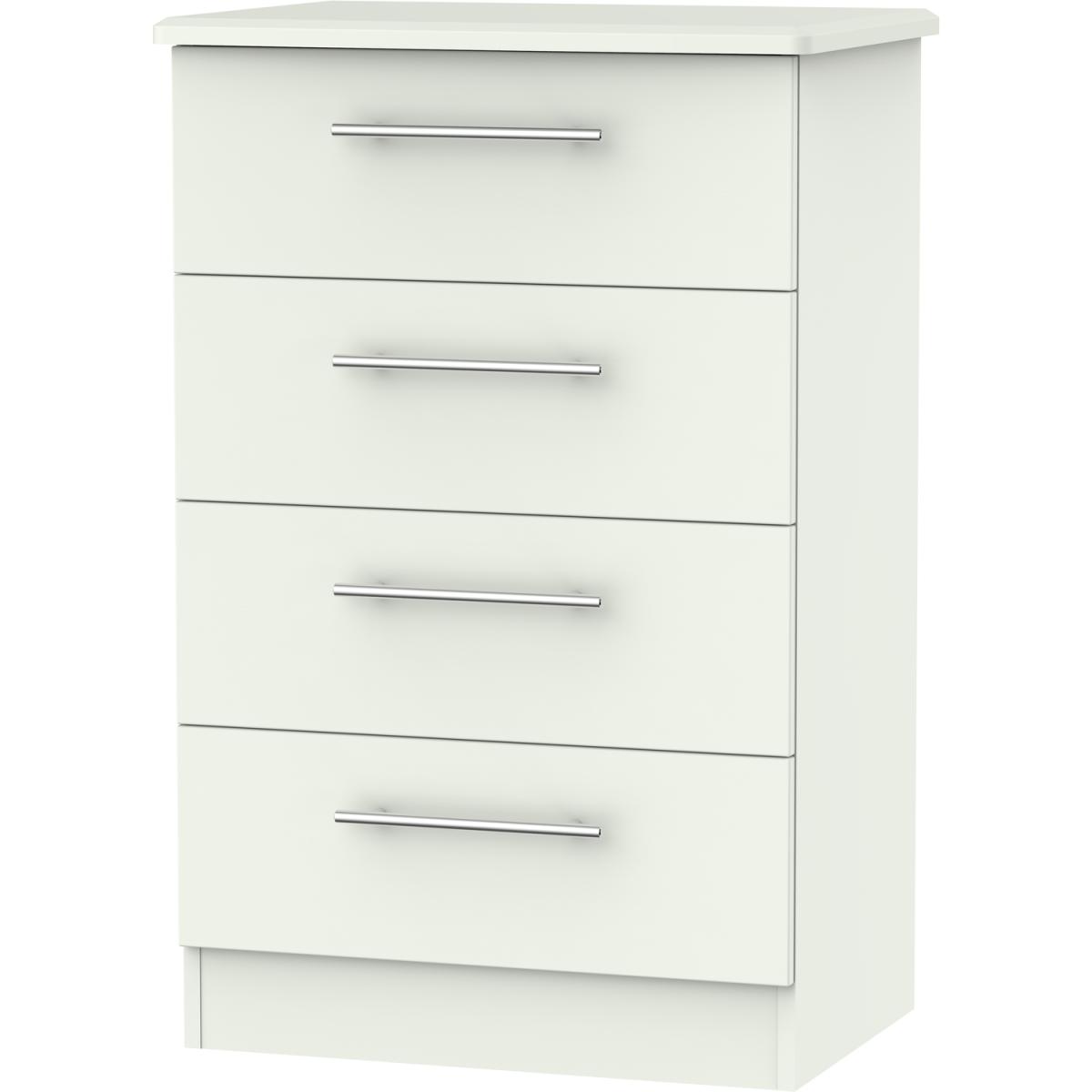 This 4 drawer mid sized chest of drawers is practical and stylish. Perfect for any home as a free standing storage unit. The elegant, stylish Sherwood range is available in a range of durable scratch resistant natural wood or matt finishes. With metal T-Bar handles on all doors and drawers. All drawers come with long lasting metal drawer runners and a linen effect interior. All our furniture is made in the United Kingdom, to the highest quality. It is delivered direct to your location of choice by one of our two man delivery teams, and come full assembled (although legs may be removed to prevent damage in transit).