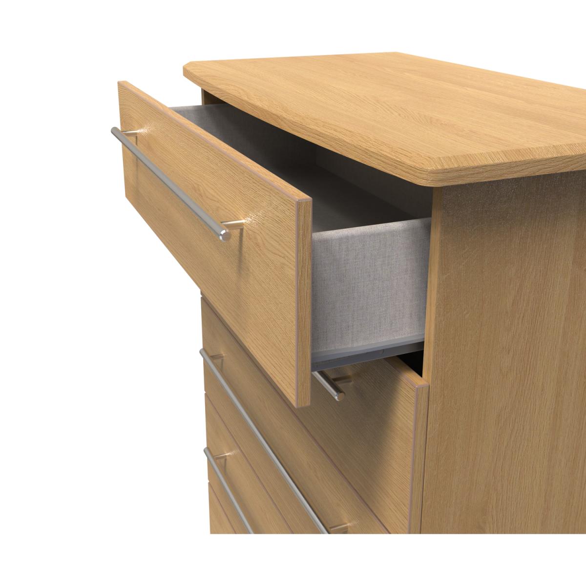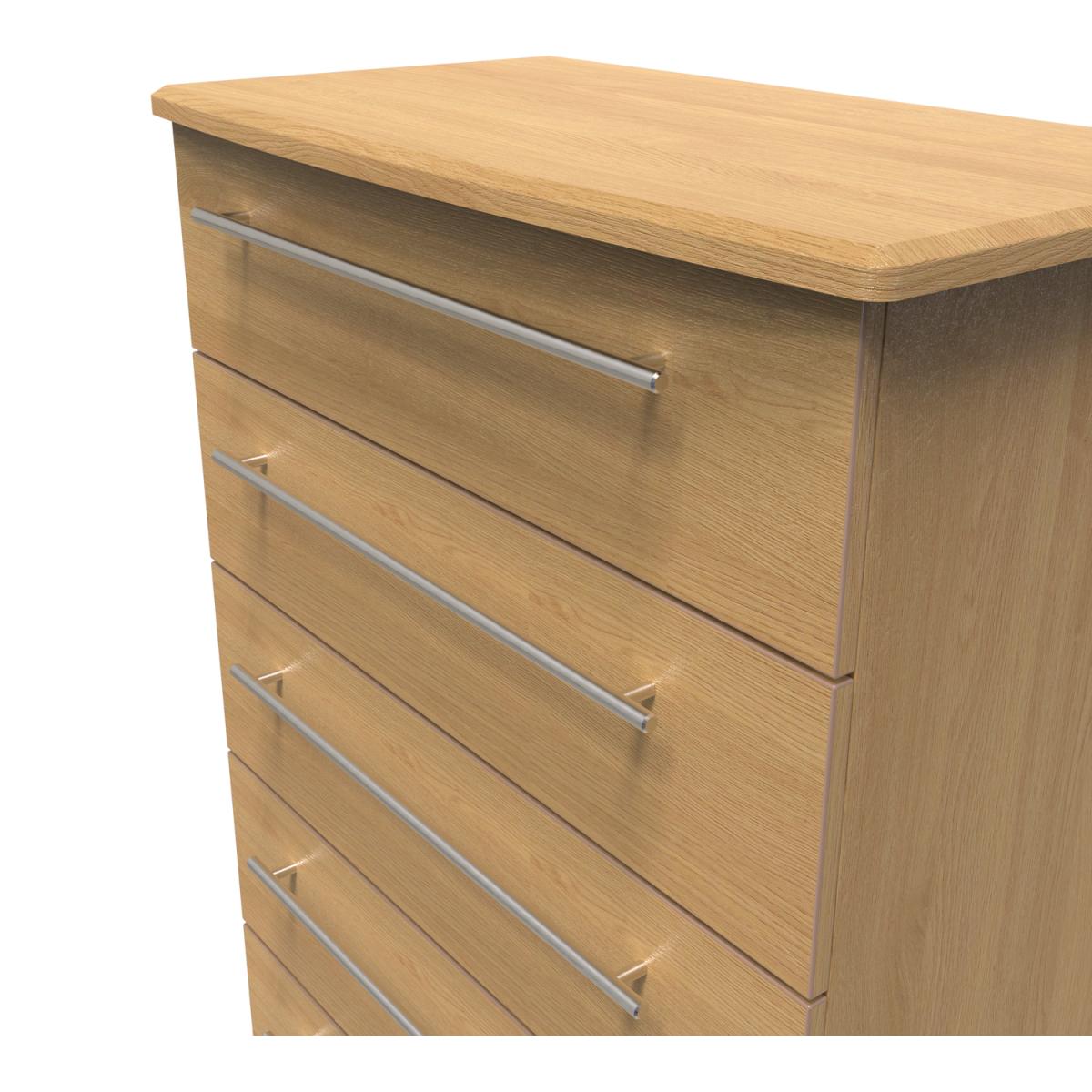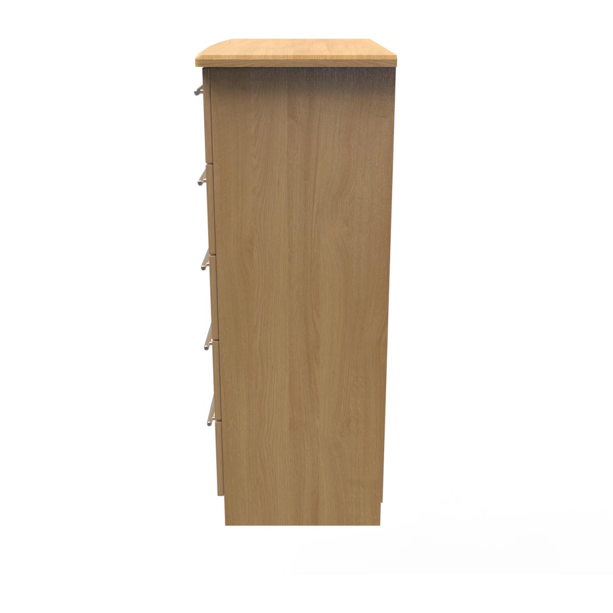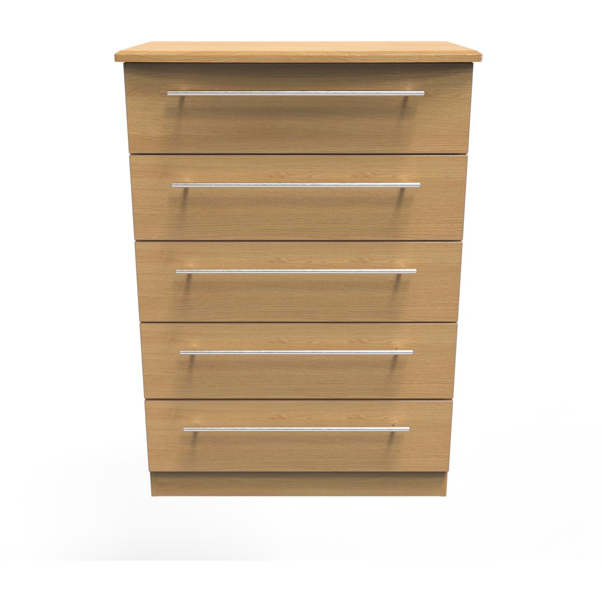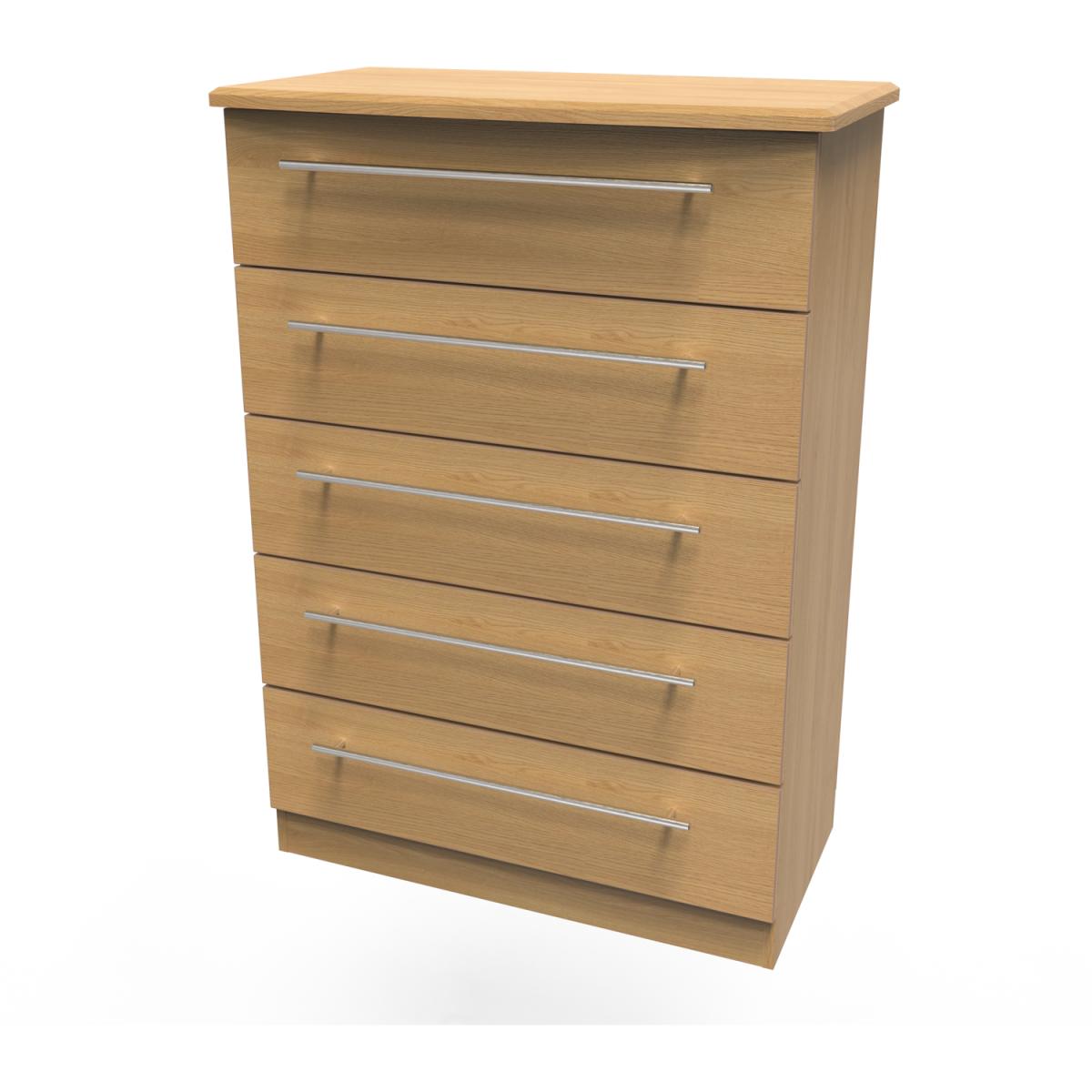 This wide 5 drawer chest of drawers is practical and stylish. Perfect for any home as a free standing storage unit. The elegant, stylish Sherwood range is available in a range of durable scratch resistant natural wood or matt finishes. With metal T-Bar handles on all doors and drawers. All drawers come with long lasting metal drawer runners and a linen effect interior. All our furniture is made in the United Kingdom, to the highest quality. It is delivered direct to your location of choice by one of our two man delivery teams, and come full assembled (although legs may be removed to prevent damage in transit).