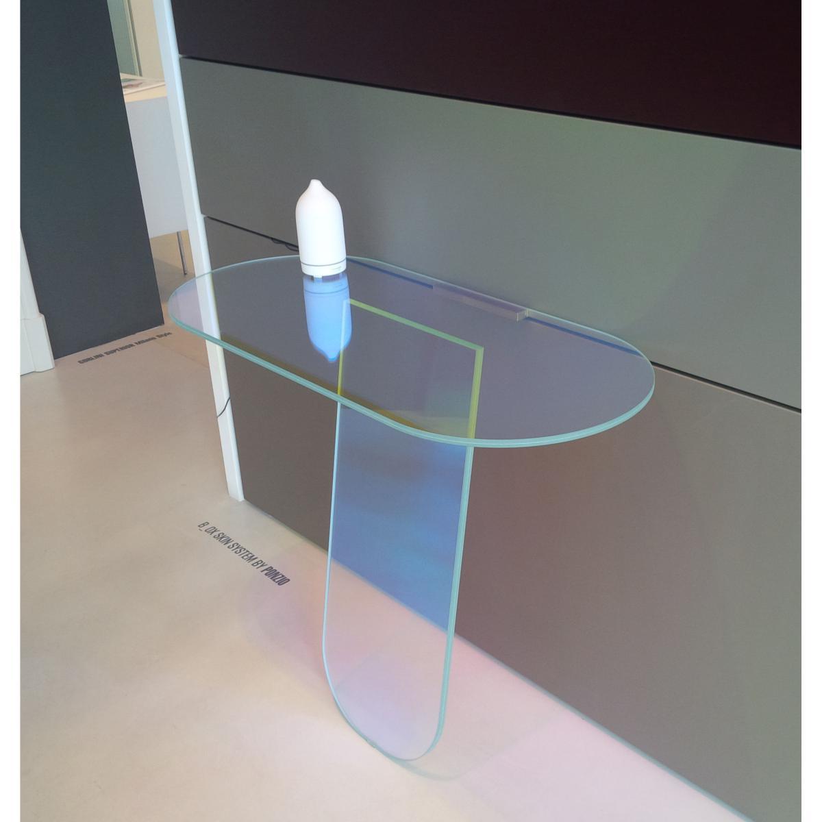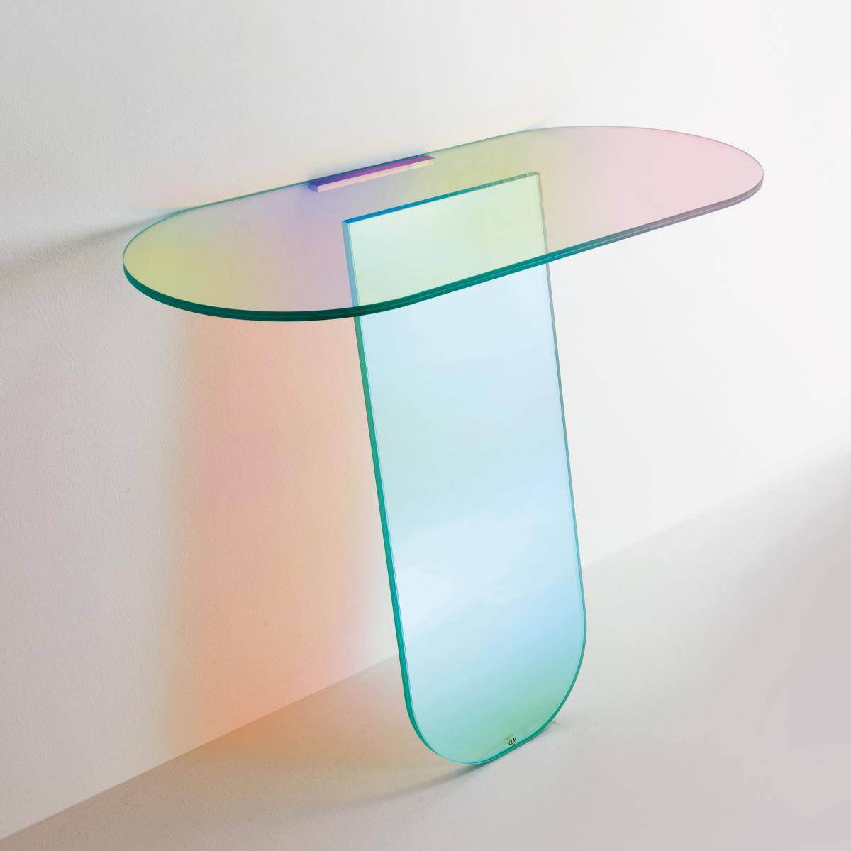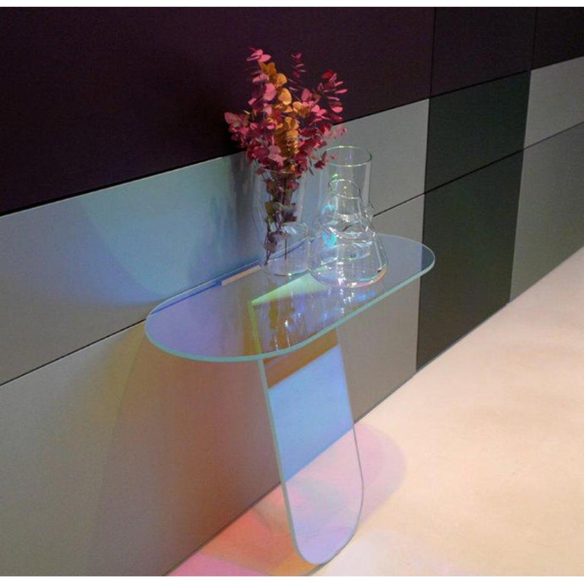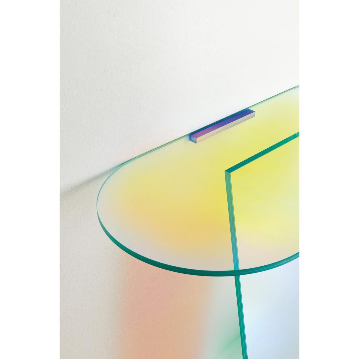 Poetic and innovative, this console in multicolored glass is transformed and changes its appearance. A magic effect imagined by the high priestess of design: Patricia Urquiola. Thanks to an innovative multi-chromatic finish, the glass reproduces the shimmering color variations of a soap bubble. The colors vary according to the light and the angle of view, creating a set of interactions with the observer. From pink to green, from orange to yellow, ethereal and iridescent colors succeed each other, become lighter or darker. A bluffing effect!.