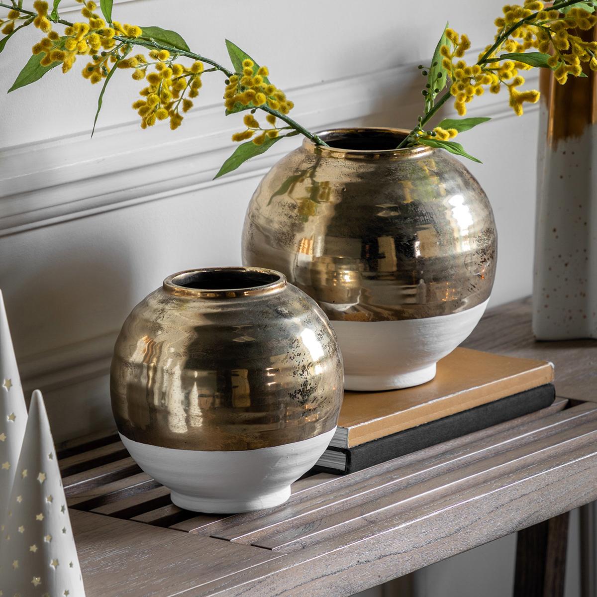 I love this large Shimmer Vase for its versatile elegance-its white and gold finish makes it a standout piece that can easily elevate both contemporary and traditional interiors. It works particularly well in minimal or monochrome schemes as a statement accessory, or paired with greenery or fresh flowers for a boost of colour. Practical tips include placing it on a mantle, sideboard, or centre table where its shimmer can catch the light, or grouping it with smaller vases or decorative objects for added visual interest. Its substantial size also makes it ideal for filling with larger arrangements or even used as a standalone sculptural piece, bringing a touch of opulence and sophistication to any space.