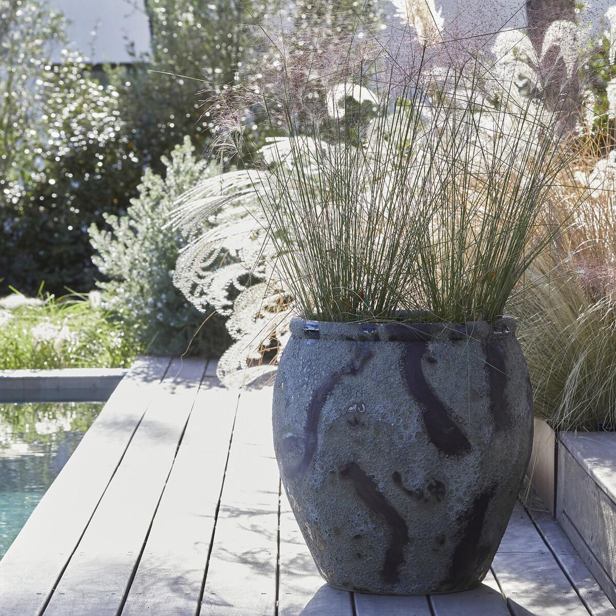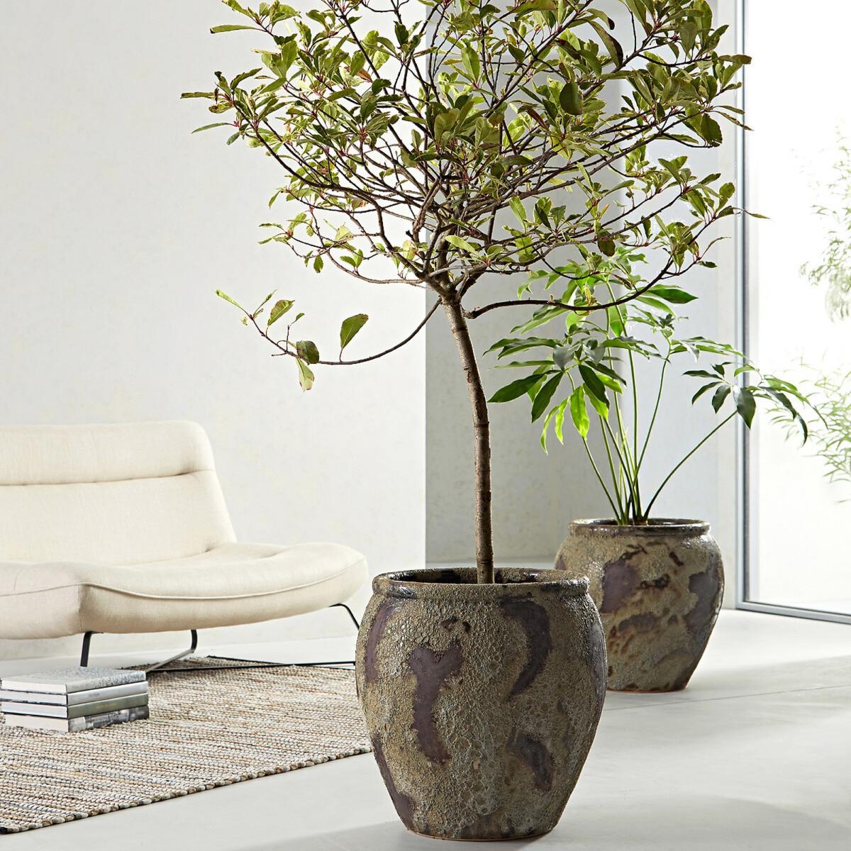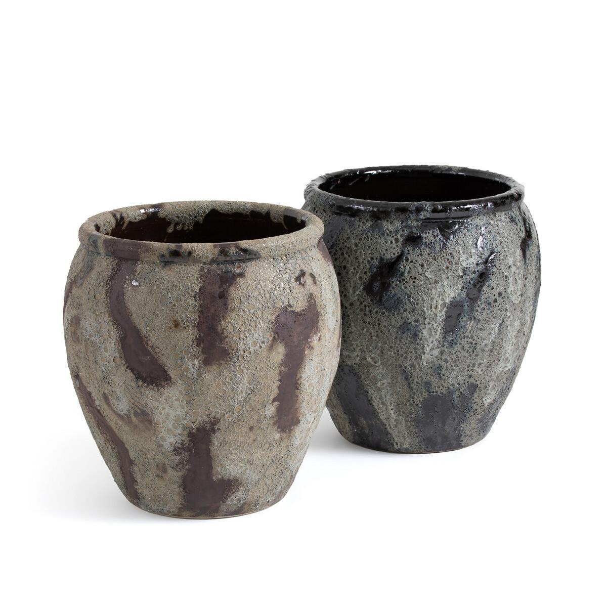 The Shin planter is made of a ceramic with a reactive glaze. Smooth and shiny aspects contrast with rougher patterns for a mix of tactile designs. The finish for each piece can be different as a result of the firing process. Each piece is unique.