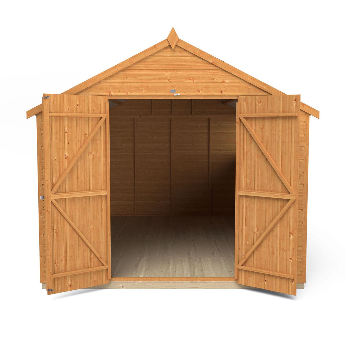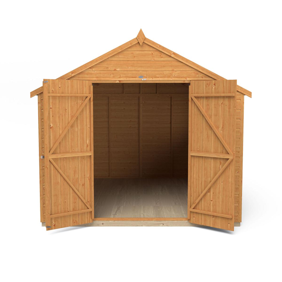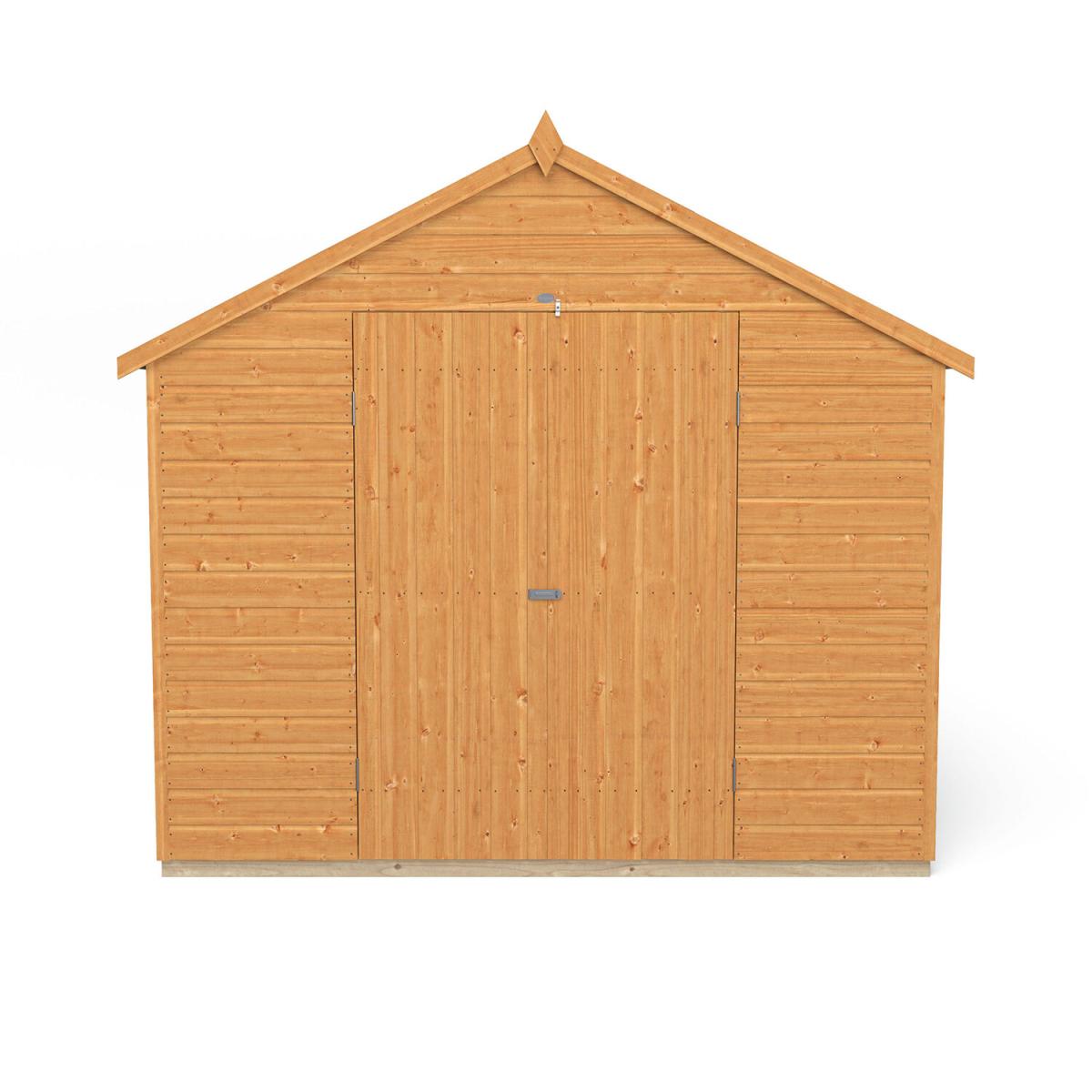 The high-quality Dip Treated 10x8 Shiplap Tongue & Groove Apex Workshop with Double Doors from Forest offers a great deal of interior space for storage of large outdoor items as well as room for use as a workshop with shelving and workbench. The sheds improved design features smaller wall sections, making it easier to handle and assemble. An attractive smooth-planed finial and barge boards finish the look of this shed. The walls use high-quality interlocking Shiplap Tongue & Groove boards that have been Dip Treated and are guaranteed against rot for 10 years, annual re-treatment is required. The design incorporates more timber framing than previously, making the shed stronger and the roof is strengthened with an additional metal roof truss bracket. The sturdy doors are braced with strong double Z framing and are hung with secure hidden hinges that cannot be accessed when the doors are closed. They can be secured by the plate hasp and staple latch (padlock not included). To personalise this building, the doors can be positioned on either end of the shed relative to the windows to suit your garden layout. Four fixed windows are glazed with shatterproof PET glazing which will not become yellow or brittle over time and allow sunlight to enter the interior while you are working. This flexible shed is made up of modular sections where same size panels are interchangeable, this means you can choose the position of the window panels during assembly. The solid timber floor is Pressure Treated for longevity and the durable sheet material roof is made weather-tight with high-quality green mineral felt. These Shiplap sheds are manufactured in the UK. All fixtures, fittings and felt needed to build this 10x8 shed are included, along with easy to follow instructions.