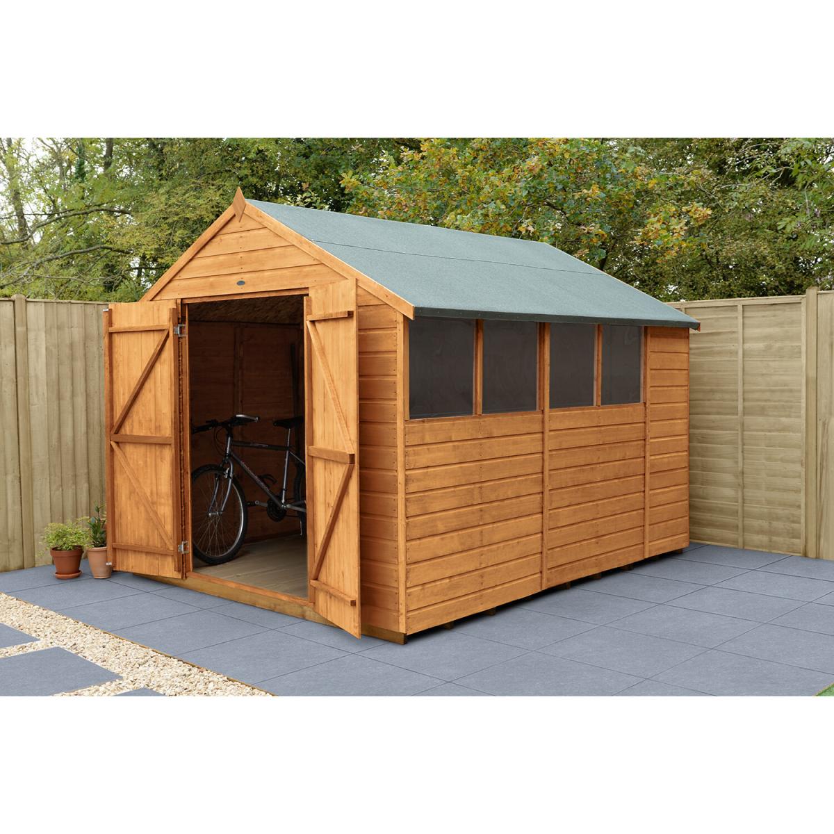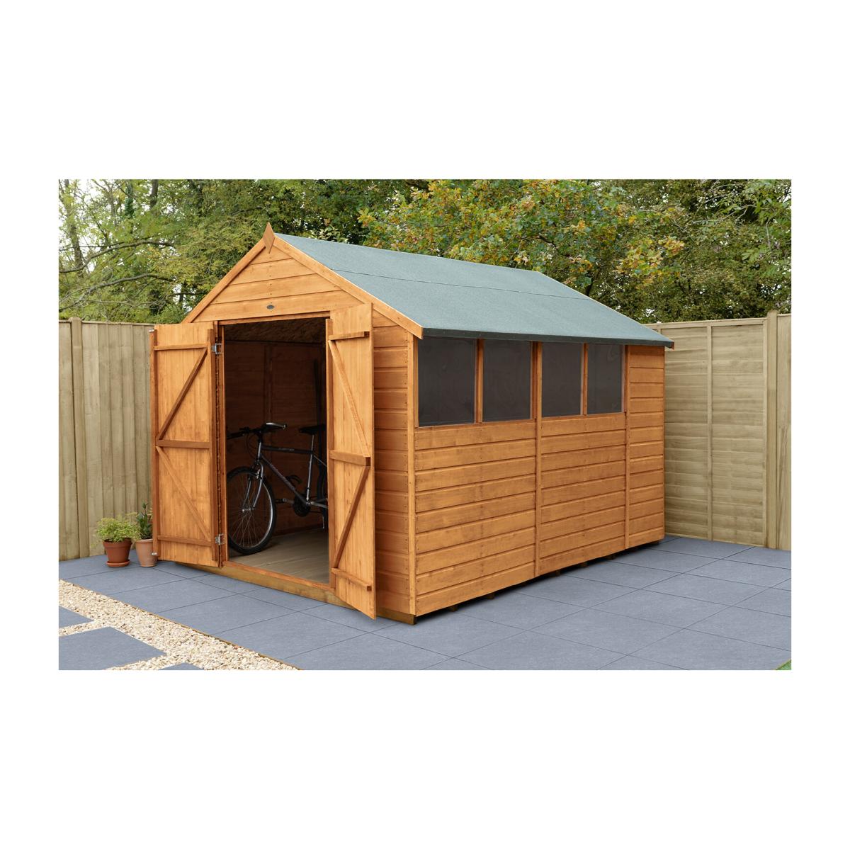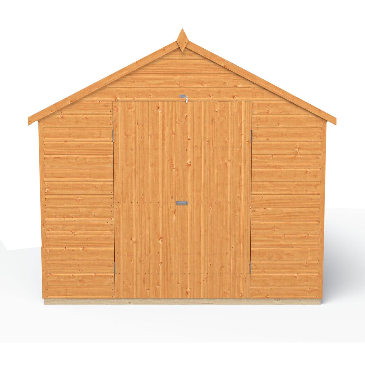 The high-quality Dip Treated 10x8 Shiplap Tongue & Groove Apex Workshop with Double Doors from Forest offers a great deal of interior space for storage of large outdoor items as well as room for use as a workshop with shelving and workbench. The sheds improved design features smaller wall sections, making it easier to handle and assemble. An attractive smooth-planed finial and barge boards finish the look of this shed. The walls use high-quality interlocking Shiplap Tongue & Groove boards that have been Dip Treated and are guaranteed against rot for 10 years, annual re-treatment is required. The design incorporates more timber framing than previously, making the shed stronger and the roof is strengthened with an additional metal roof truss bracket. The sturdy doors are braced with strong double Z framing and are hung with secure hidden hinges that cannot be accessed when the doors are closed. They can be secured by the plate hasp and staple latch (padlock not included). To personalise this building, the doors can be positioned on either end of the shed relative to the windows to suit your garden layout. Four fixed windows are glazed with shatterproof PET glazing which will not become yellow or brittle over time and allow sunlight to enter the interior while you are working. This flexible shed is made up of modular sections where same size panels are interchangeable, this means you can choose the position of the window panels during assembly. The solid timber floor is Pressure Treated for longevity and the durable sheet material roof is made weather-tight with high-quality green mineral felt. These Shiplap sheds are manufactured in the UK. All fixtures, fittings and felt needed to build this 10x8 shed are included, along with easy to follow instructions.