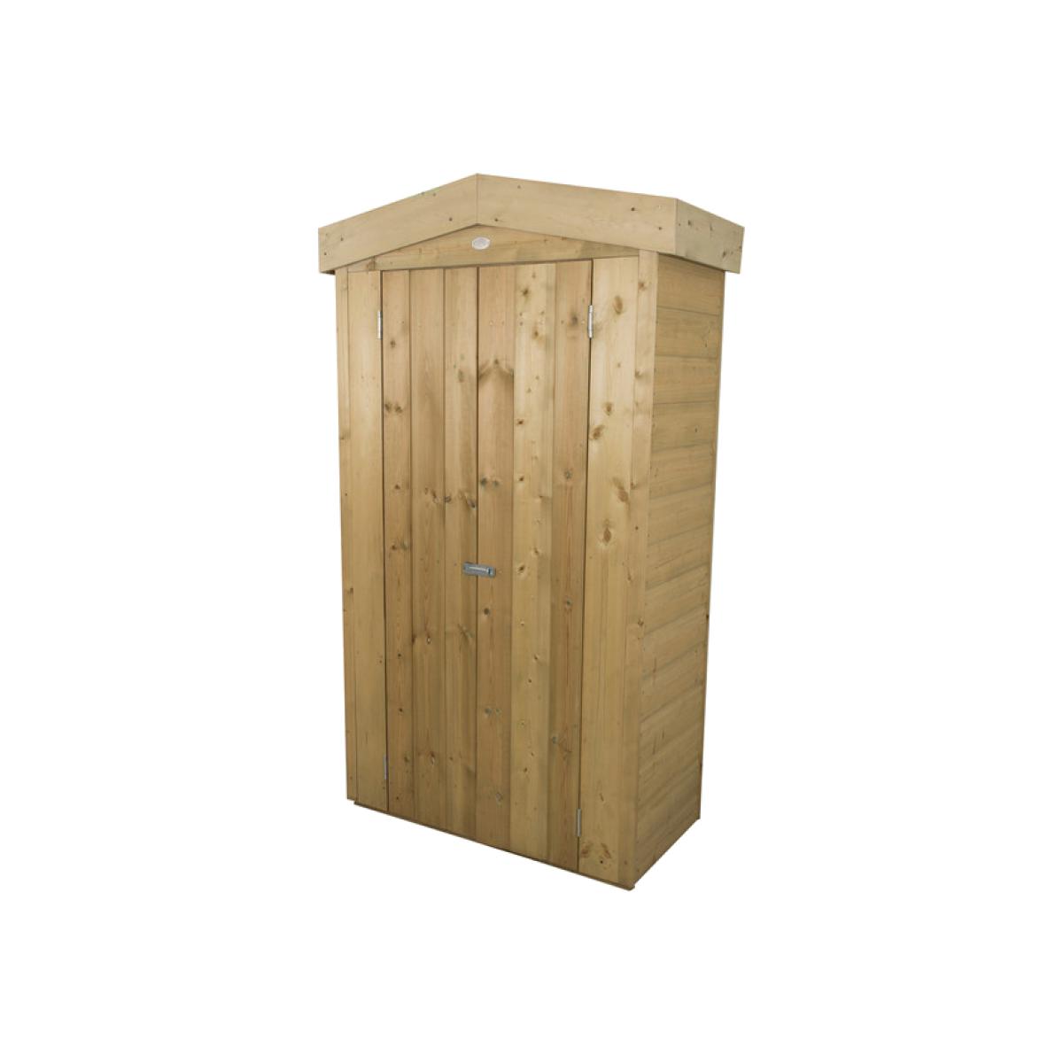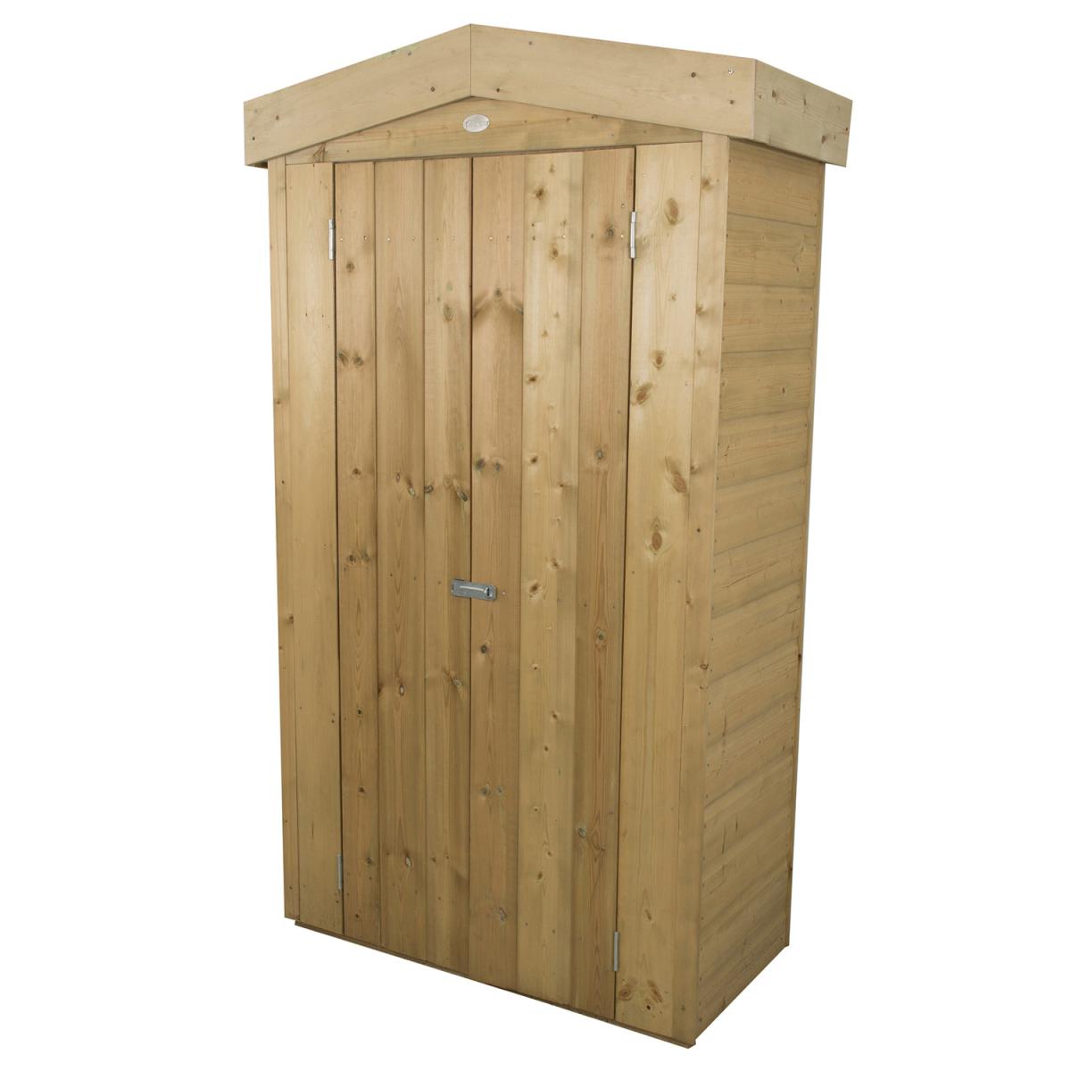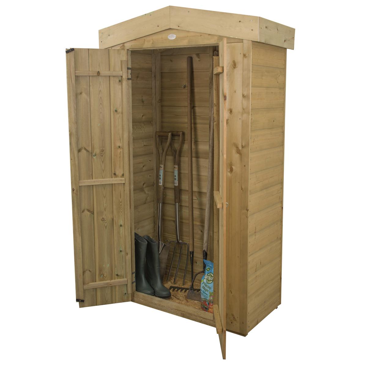 The Shiplap Tall Garden Store is an attractive and robust garden store ideal for positioning against a wall or fence, helping you save on space while keeping your garden neat and tidy. Standing at just under six foot, its tall design makes this store ideal for a wide array of outdoor equipment such as long handled gardening tools, children's toys or folding furniture. Manufactured using smooth-planed, tight fitting, Shiplap Tongue & Groove boards, along with a high quality mineral felt roof, this store is weather-tight and will keep your possessions dry no matter the weather. All timber has been pressure treated to ensure rot resistance, adding another layer of preservation. The double doors can be closed with the supplied turn-buttons and plate hasp and staple latch and secured with a padlock. This store is available with either a decorative apex roof or a neat and tidy pent roof.