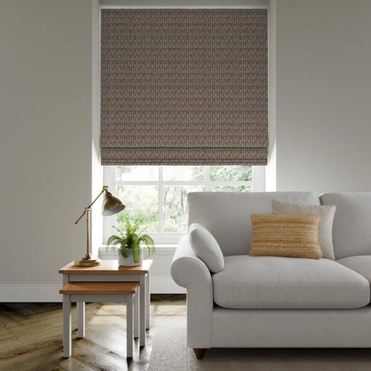 * Retro, geometric design * Choose from 3 linings * Select your fitting type * Pick a side for the operating chain * Coordinating Made to Measure and Made to Order items available to purchase separately For interiors that dare to be bold, the Shiraz Roman Blind features a retro-inspired geometric design in vivid hues. Its textured polyester composition provides structure and durability, while the colour-rich pattern adds personality to modern or mid-century spaces. Tailor your blind with multiple lining and hardware options to suit your lifestyle and décor. Choosing your lining: * Blackout provides minimal light disturbance in your home making it perfect for bedrooms. * Thermal helps to keep the warmth in and the cool air out meaning it’s great for family rooms or lounges. * Our Standard Lining is perfect if you like the glow of natural light whilst your curtains are closed whilst still maintaining your privacy. Choosing your fitting type: * Inside the recess: this gives a tidy, snug finish as it’s made to fit your window exactly. * Outside the recess: this option is great if you don’t want the blind to be visible from the outside when it’s drawn up. Choosing which side you’d like the operating chain: * Think about where your blind will be situated and what furniture may be near it – choose the side that is easier for you to access. Need help deciding or measuring?Book a free appointment with one of our consultants! They also double up as a child safety feature. If pressure is exerted the clips will detach to prevent the risk of strangulation. Please read our [Blinds Safety Guide](https://www.dunelm.com/info/buying-guides/blinds-safety-guidance) for more information. If the clips detach accidentally during normal use, they can be easily re-clipped back into place. Please note: If your measured width is over 130cm your blinds may come with a fabric join to provide the full width required.