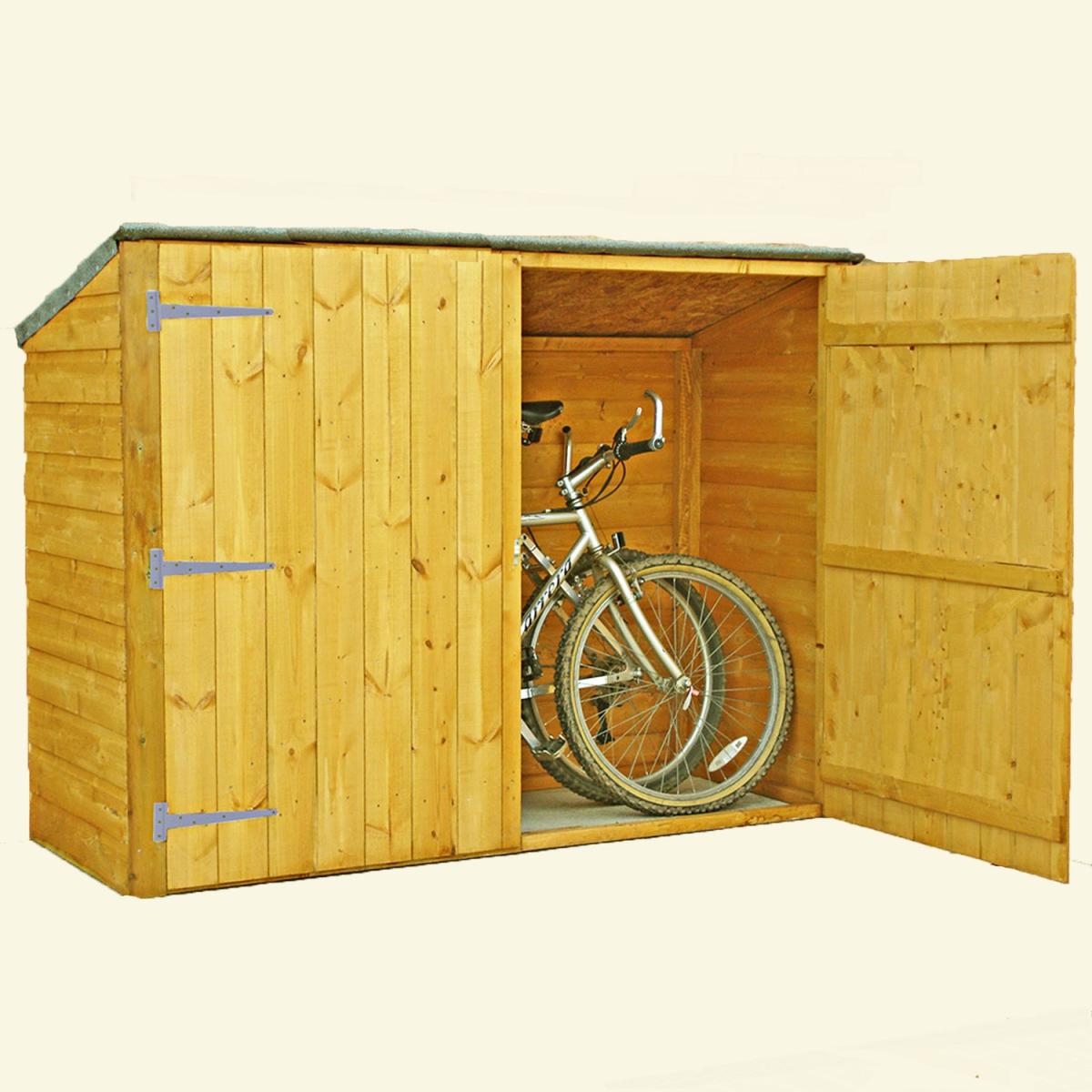 This pent roof bike store provides economic storage for up to 3 bicycles or can be used as a store for outdoor toys and garden equipment. Wide double doors allow you easy access whilst the pent roof design makes this an unobtrusive building. A hasp and staple is fitted to the door ready for your own padlock. Wall panels are made from weather resistant 12mm shiplap FSC Certified timber boards and supplied in a honey brown timber basecoat ready for your own top coat choice. The roof is constructed from solid board (OSB) for ease of installation and comes without a floor to allow wet bikes to drain off without damage to the store. The Bike Store comes complete with fixing kit, mineral roof felt, installation instructions and includes home delivery. Following your order, you will be sent a link to choose your delivery day. On the morning of delivery day you will also receive live tracking information.
