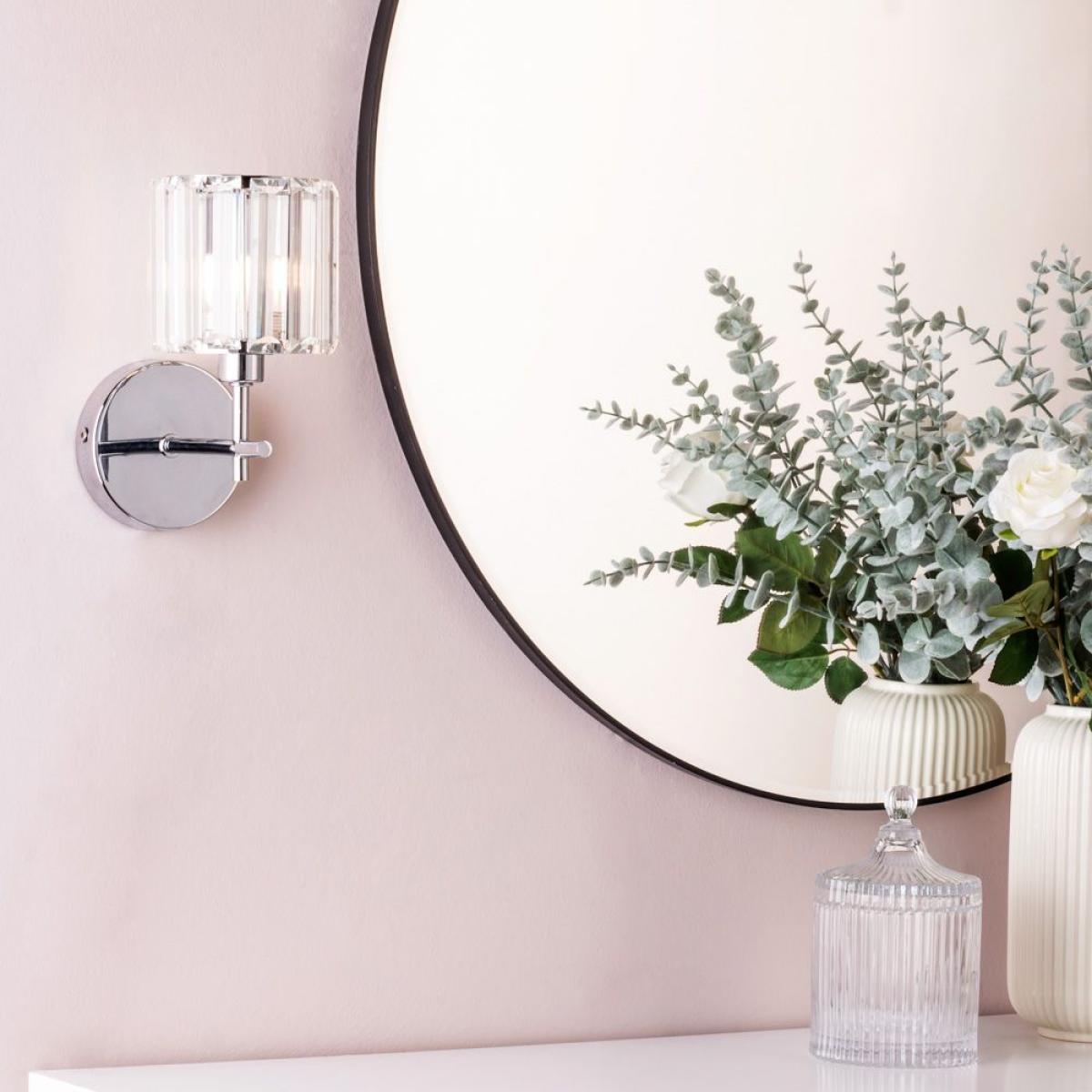 I really like this wall light for its sleek, reflective chrome finish and sophisticated crystal-style detailing, which adds a touch of glamour without being overly ornate. It works well in contemporary or art deco-inspired bathrooms, especially when paired with minimalist fixtures or glossy tiles, to create a clean, chic look. Practical styling tips include placing it beside a mirror to enhance light distribution and highlight its reflective qualities, or using multiple units in a row for a polished, cohesive effect. Its neutral chrome finish ensures it complements a range of colour schemes, making it a versatile choice for various interior styles.