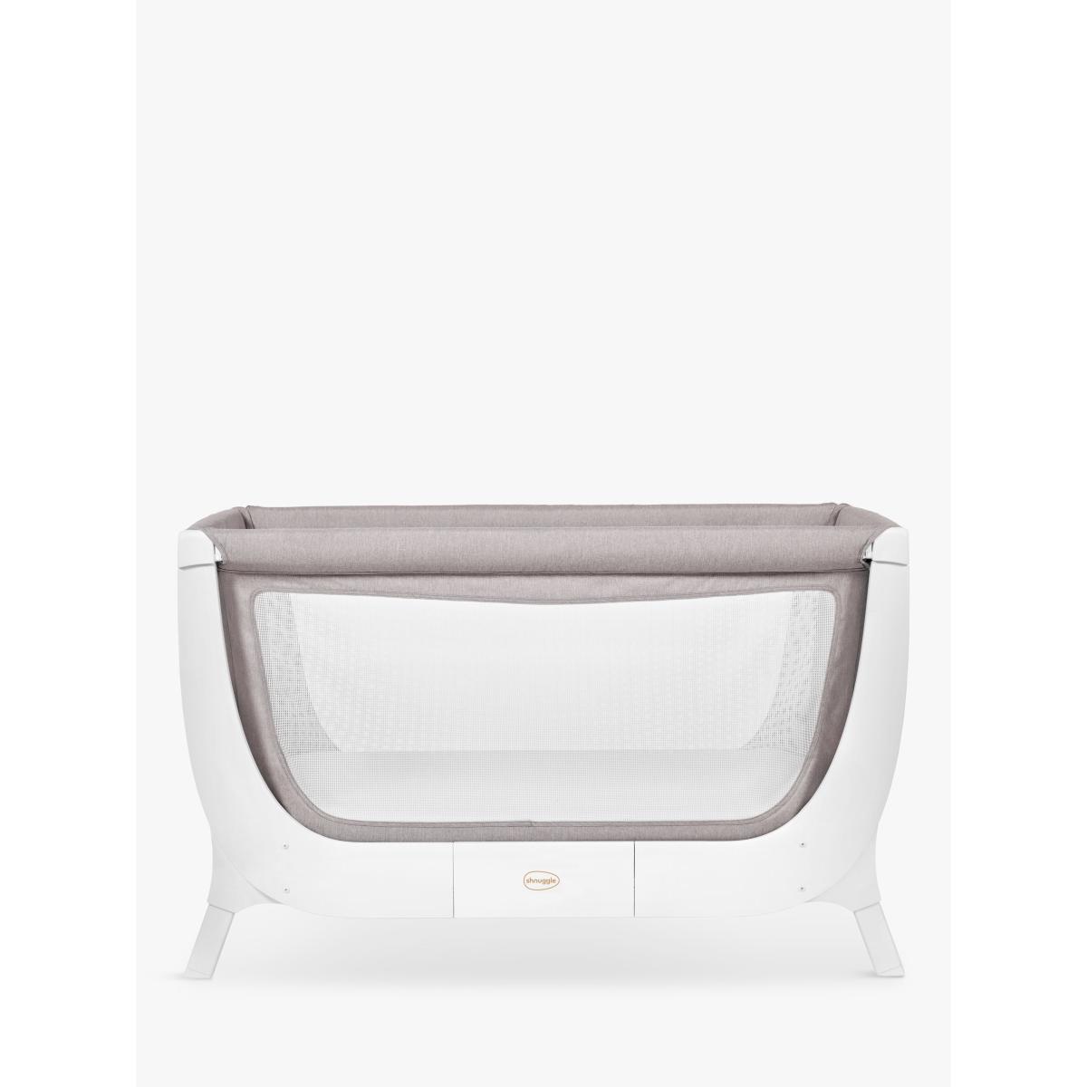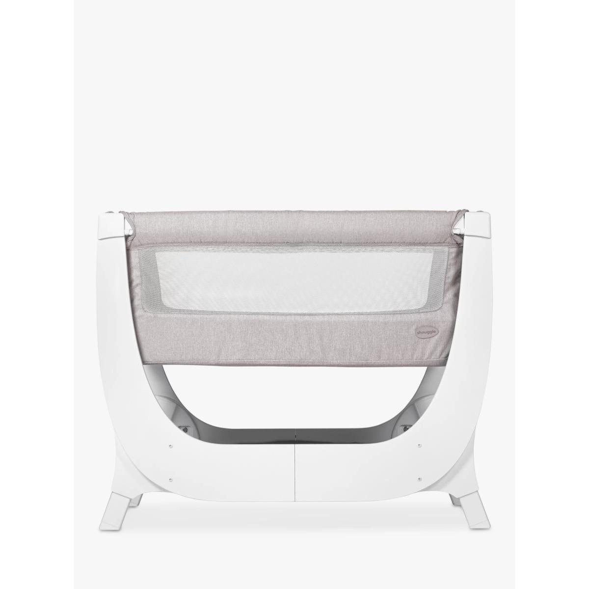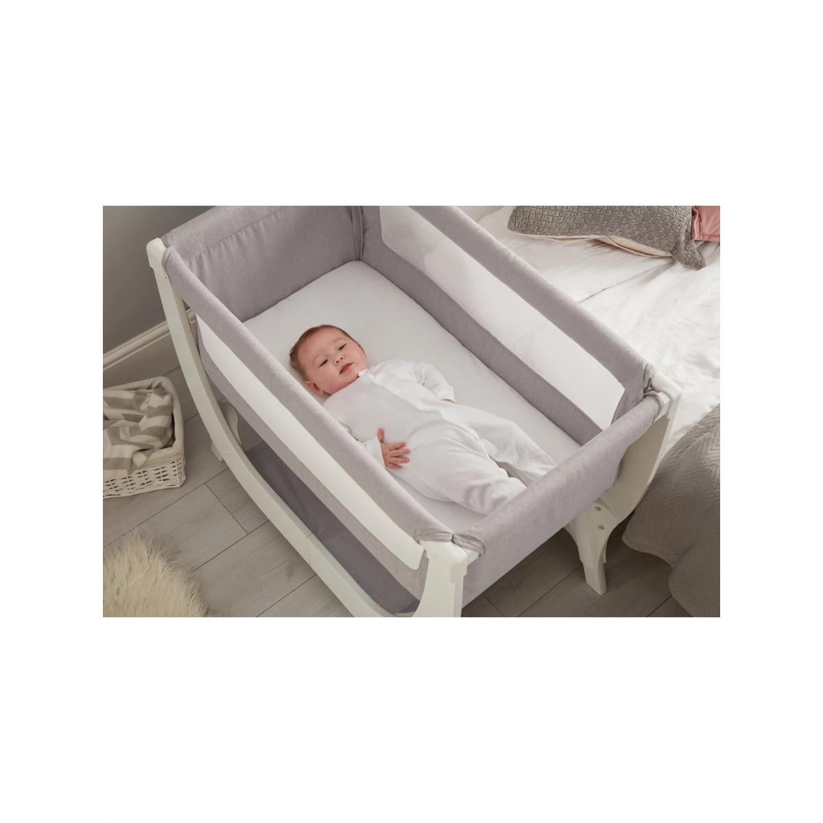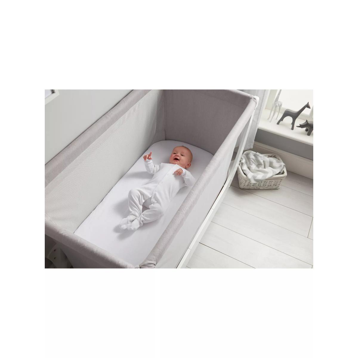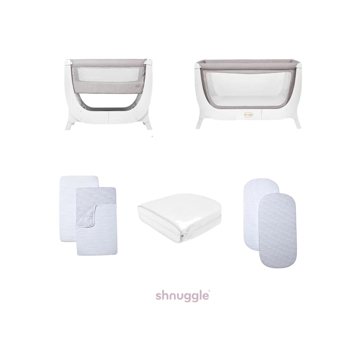 This bundle of Shnuggle products provides everything you need to create a safe and cosy place to sleep. Products include: Air Bedside Crib, Stone Grey Air Cot Conversion Kit, Stone Grey Air Cot Airflow Folding Mattress Air Crib Bedding Set: x2 crib fitted sheets, 1 reversible coverlet blanket Grey Cot Fitted Sheets, pack of 2 Shnuggle's Air Bedside Crib has a sturdy wooden frame with dual-view, breathable mesh sides for reassuring visibility and to maximise airflow. It has 7 height adjustments to match the height of your bed and it's suitable from: 0 – 6 months or when baby starts to roll over, pull up or reach a weight of 9kg. It offers a gentle incline option to help ease colic and reflux and has zip-down sides for easy access to baby. Use it as a bedside crib or standalone. The Air Cot Conversion Kit allows you to convert your Bedside Crib into a stylish cot. It's suitable from 0-2 years, or when baby starts to climb out of the cot, or reach approximately 89cm in height. Perfect for the growing period, it's designed with the same focus breathability and function as the crib, with dual-view mesh sides, removable hypo-allergenic fabrics and height adjustable legs. The Airflow Mattress has a hypo-allergenic and breathable fibre core and it's tested to BS EN ISO 9237 – 1995 for air permeability. Its water-repellant quilted cover can be removed and washed. All additional bed linen is made from super-soft and naturally breathable cotton that's machine washable at 30°C.