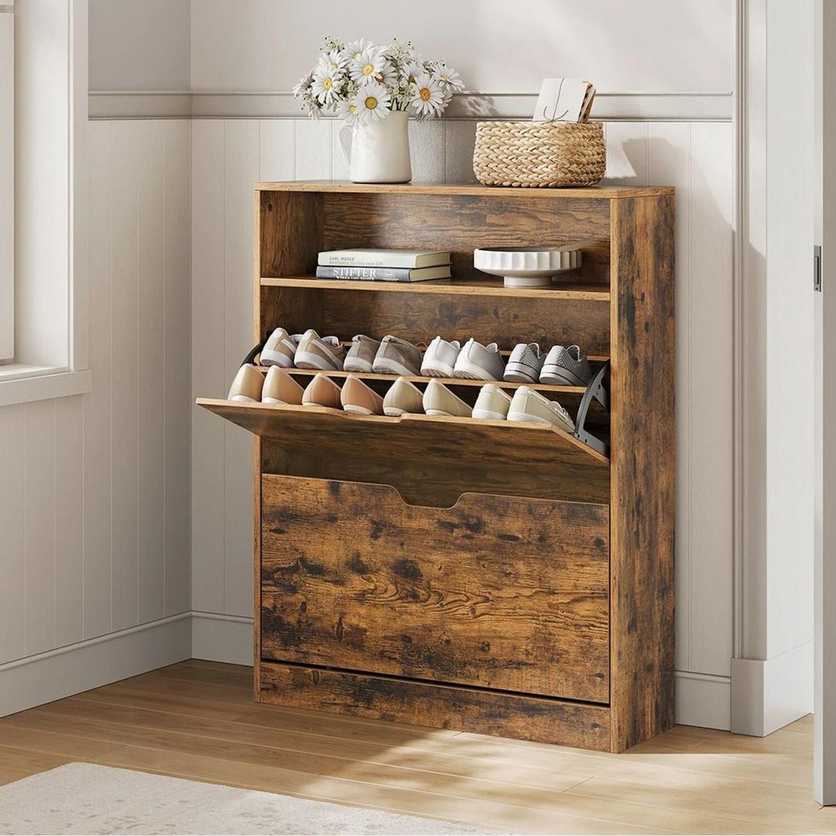 I love this shoe cabinet because of its practical design with flip doors and open compartment, making it easy to access everyday footwear while keeping things organised. Its warm brown finish adds a cosy touch that works well in both traditional and contemporary interiors. It's a versatile piece that can fit nicely in hallways, mudrooms, or even bedrooms, especially when paired with other wooden or neutral-toned furniture. For styling tips, consider stacking baskets or decorative trays on top to maximise storage and visual appeal, while keeping shoes neatly arranged inside. Overall, it’s a smart, understated addition that balances functionality with style.