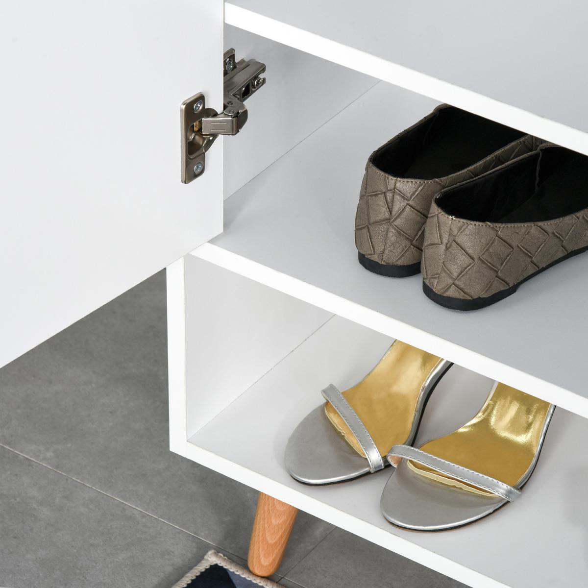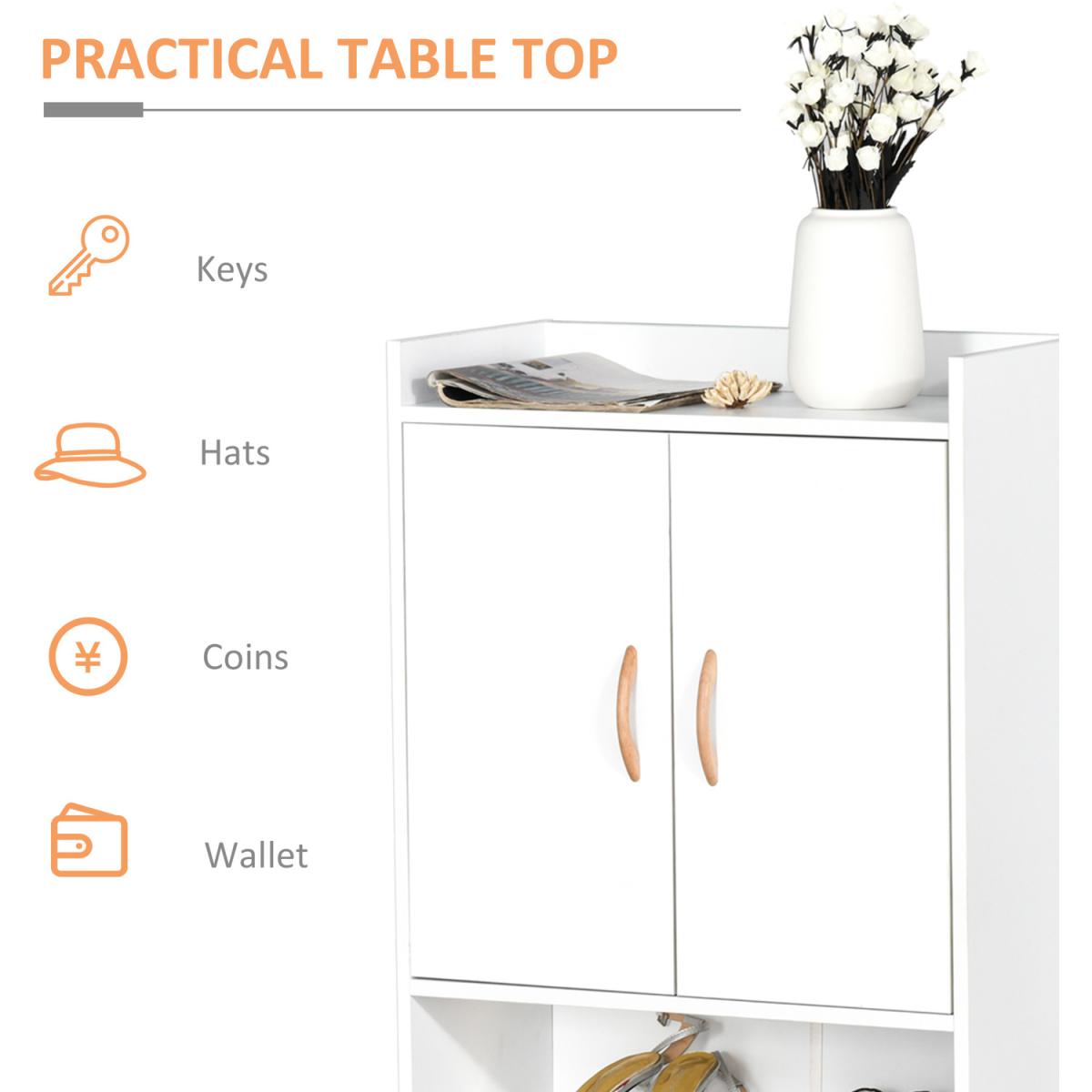 Let this modern cabinet from HOMCOM give your shoes a welcome place for the every day. The clean white design looks great in a variety of home styles. Features a concealed cabinet with three shelves, an open bottom shelf and flat top - plenty of storage. A practical solution for the home and office.