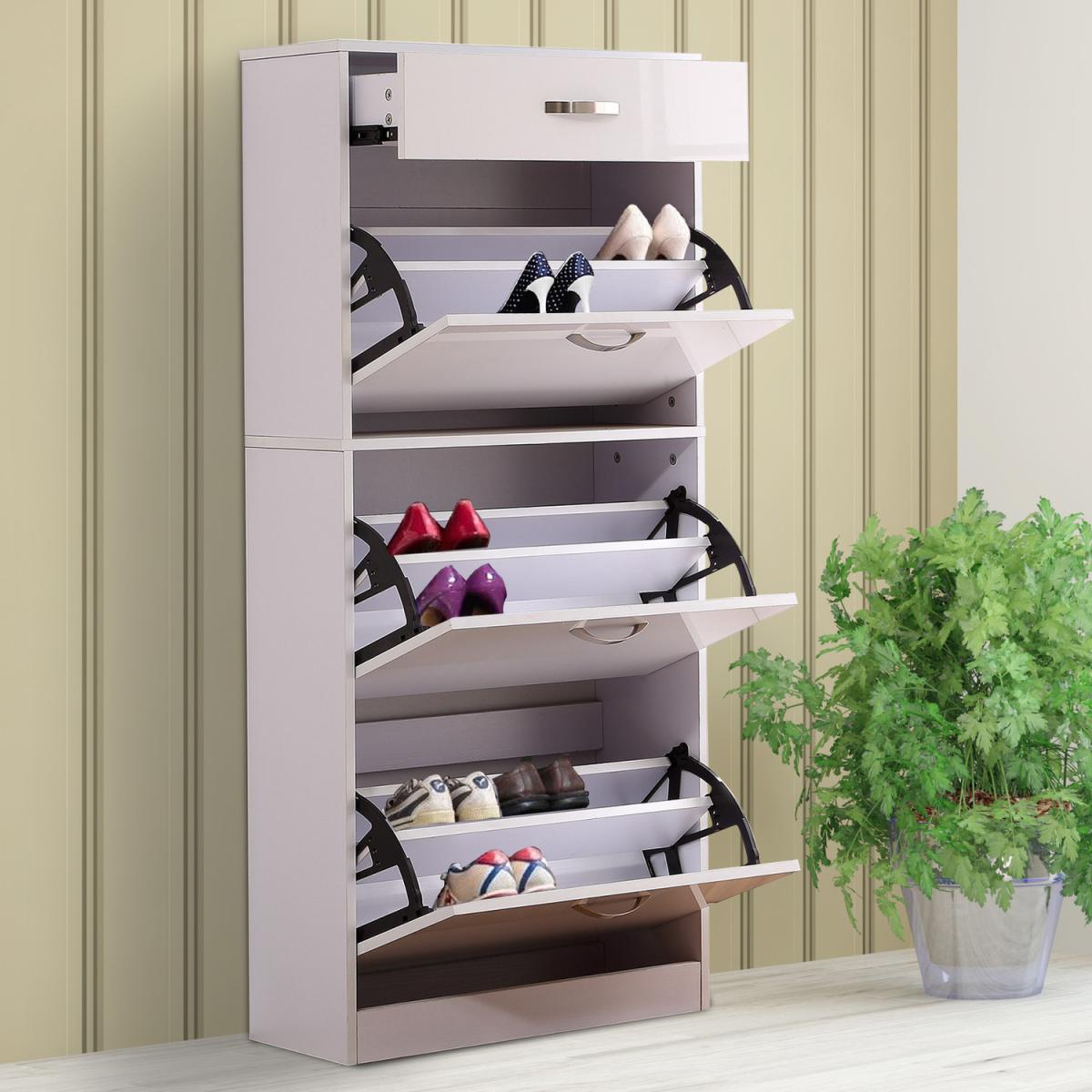 This elegant shoe cabinet from HOMCOM comes with 3 tipping drawers with high gloss panels and a single slide-out drawer to keep any essentials. It can hold up to 18 pairs of shoes in an organised and tidy manner. The storage unit with a modern stylish design is an elegant and functional addition to your hallway or corridor.