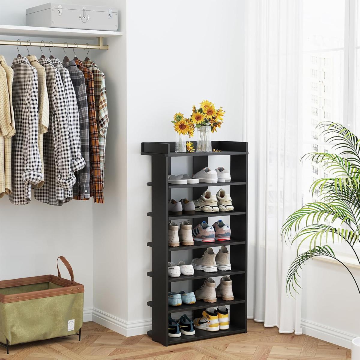 Our shoe rack is made of PVC wood plastic composite which is a new eco-friendly material for furniture use. Strong and durable, smooth surfaces can be cleaned with water directly. Easy to assemble with a simple structure. You can assemble this shoe rack effortlessly even if you don't have great DIY skills. It is suitable as a shoe rack, display stand or plant rack in our daily life. The top layer is the design of a storage desk, equipped with a fence, which can facilitate the placement of keys, bags, umbrellas, etc.