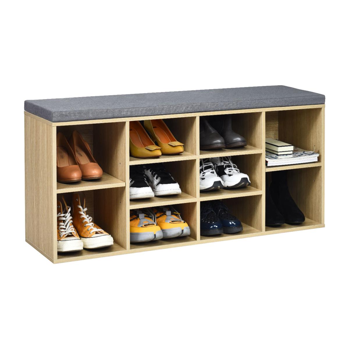 This large shoe bench offers 6 pre-set compartments in the centre of the bench, with the 4 outer compartments height adjustable, for large boots and shoes. The thick, high-density cushion offers a comfy seat to put on or take off your shoes and is kept in place with hook and loop fastenings. Alternatively, this storage bench could be used for storing other items such as books, toys and games, and the bench can be used as somewhere cosy to sit.