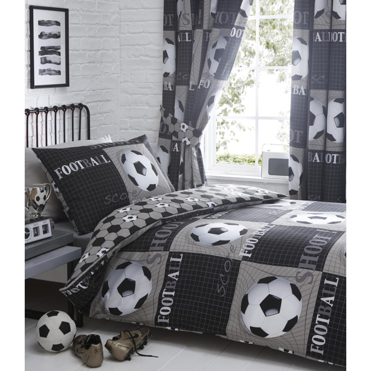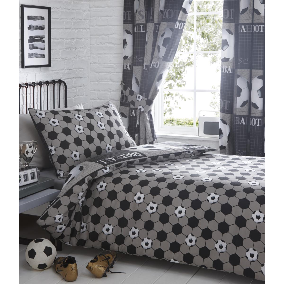 Score with this football inspired design duvet and pillowcase set. In tones of black and charcoal, coordinating curtains available. A great bedroom addition for any football lover.