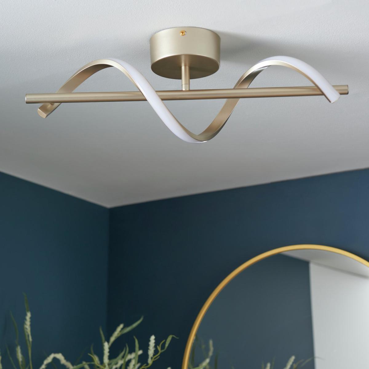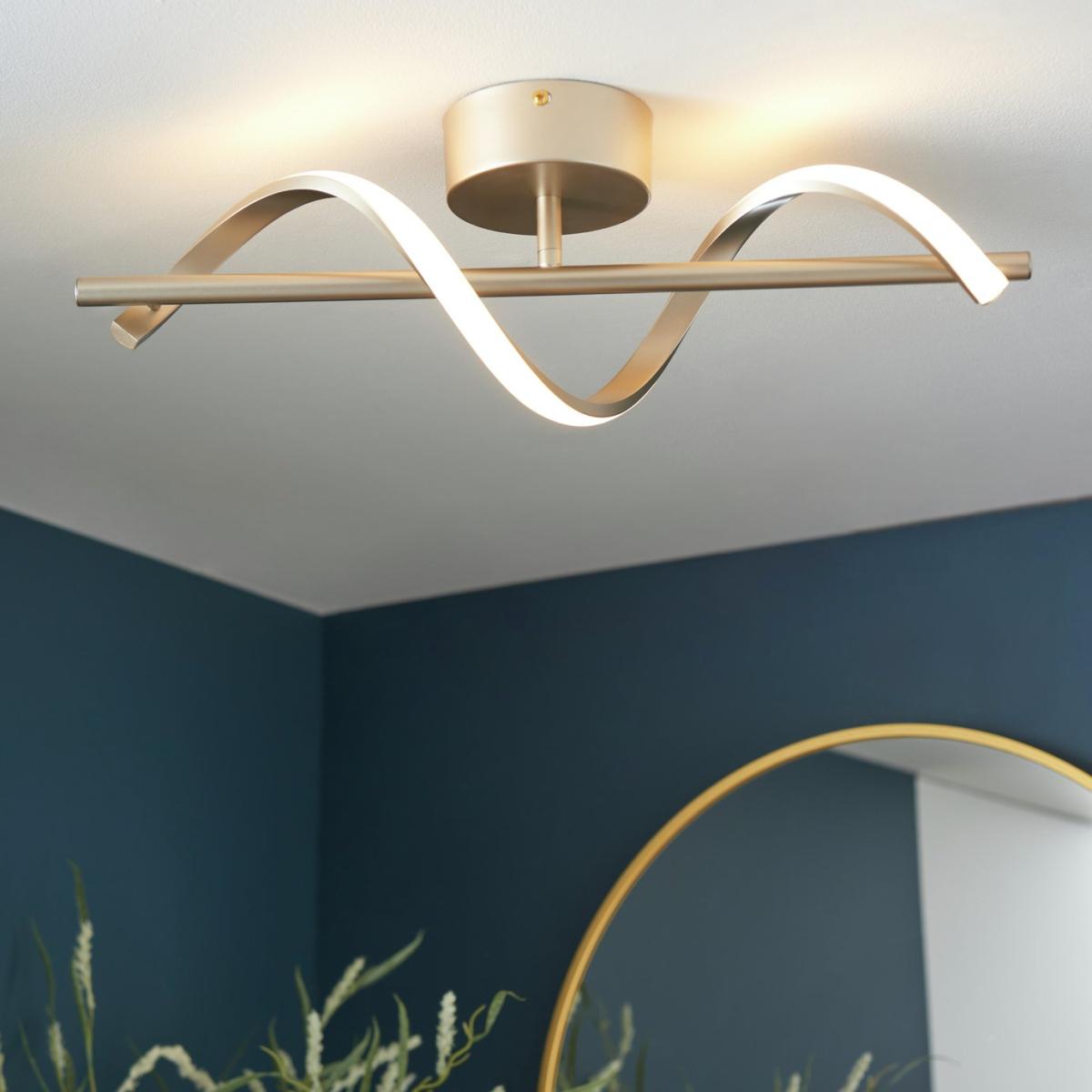 The Caliso Flush Ceiling Fitting is a sophisticated lighting solution featuring integrated LED technology, this ceiling fixture bathes your space in a warm and inviting 3000k warm white light, creating a comfortable and well-lit environment. With a luminosity of 760 lumens, it offers both efficiency and aesthetic appeal. The soft gold finish adds a touch of elegance to the fixture, enhancing the overall aesthetic of the space. Additionally, the Caliso Flush Ceiling Fitting allows for a coordinated decor with matching items available. Matching items available. Integrated LED. Dimensions: Size H15, W50, D13cm. Bulb Information: Bulbs required 1 x integrated LED (included). Can not be used with a dimmer switch. Colour rendering index 80. Colour temperature 3000. K. Rated luminous flux 760 lumens. General Information: Metal and plastic. IP rating 20 - not suitable for bathroom use. Weight: 0.6kg. Minimal assembly. Product is hard-wired into electrics. This lighting product is a class 2 fitting. Manufacturer's 1 year guarantee.