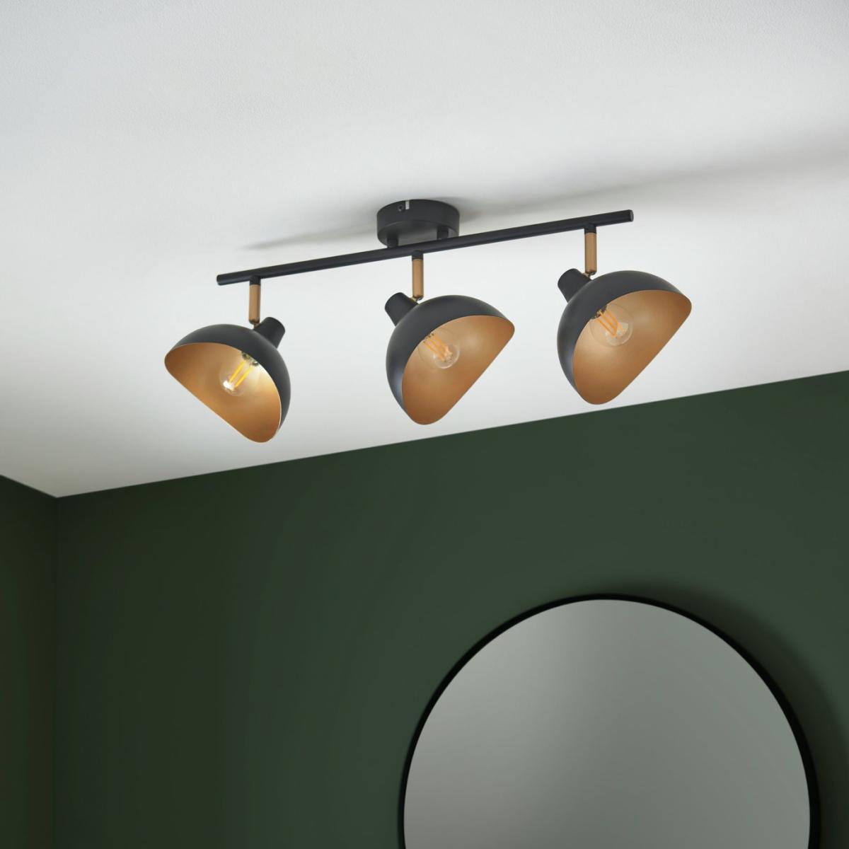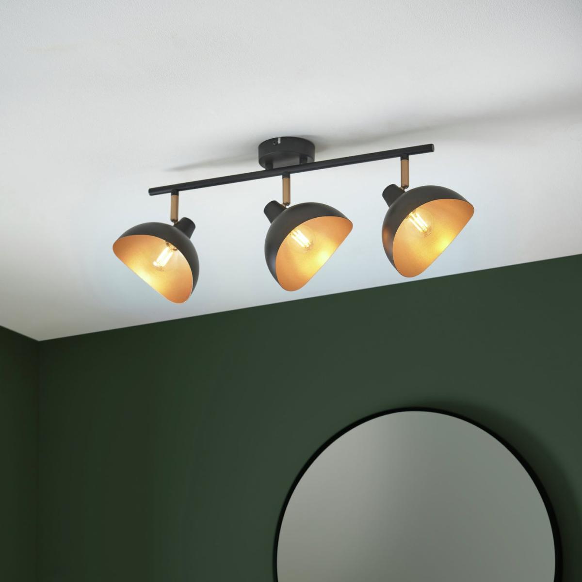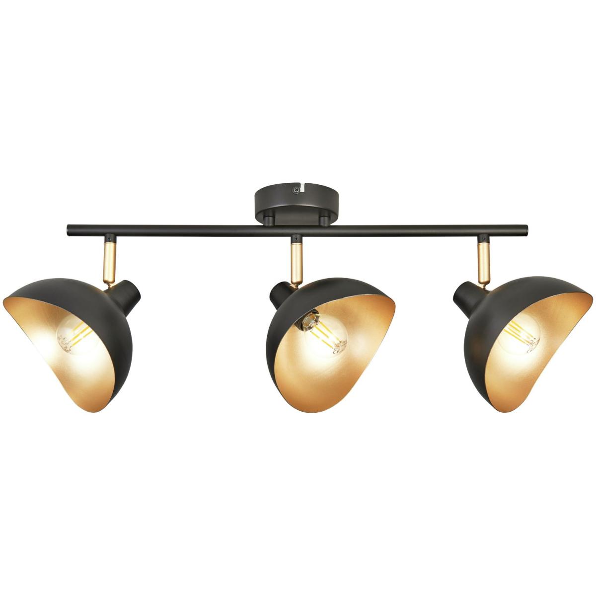 The Fortuna 3-Light Spotlight is a stylish lighting fixture featuring a matte black exterior with captivating gold inner shades. Designed for E14 LED lamps, it offers energy-efficient and adjustable illumination. With dimmable functionality and adjustable shades, it allows you to create the perfect lighting atmosphere. Elevate your space with the Fortuna 3-Light Spotlight's modern charm and versatility. Adjustable shade heads. Dimensions: Size H24, W15, D52cm. None adjustable cord drop. Bulb Information: Bulbs required 3 x golfball E14 small edison screw LED (not included). Recommended maximum wattage: 6 watts. Can be used with a dimmer switch. LED bulb only. General Information: Steel. IP rating 20 - not suitable for bathroom use. Weight: 0.85kg. Minimal assembly. Product is hard-wired into electrics. This lighting product is a class 1 fitting. Manufacturer's 1 year guarantee.
