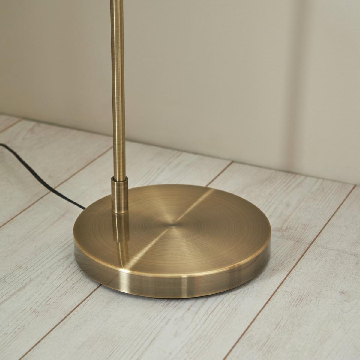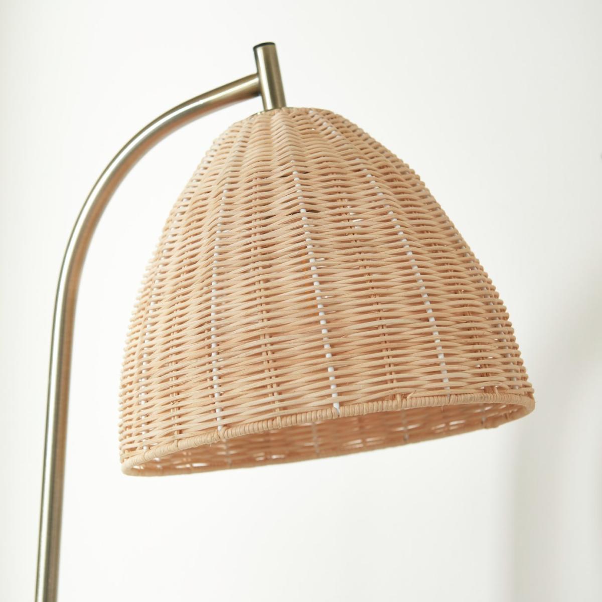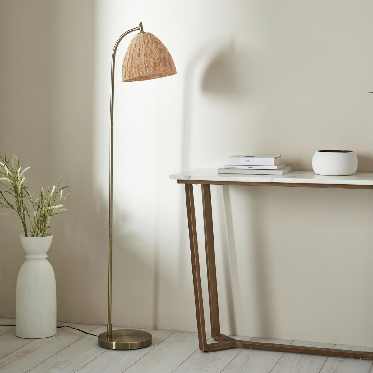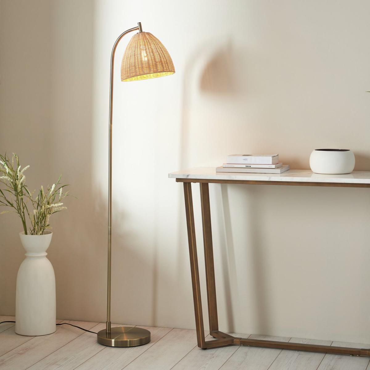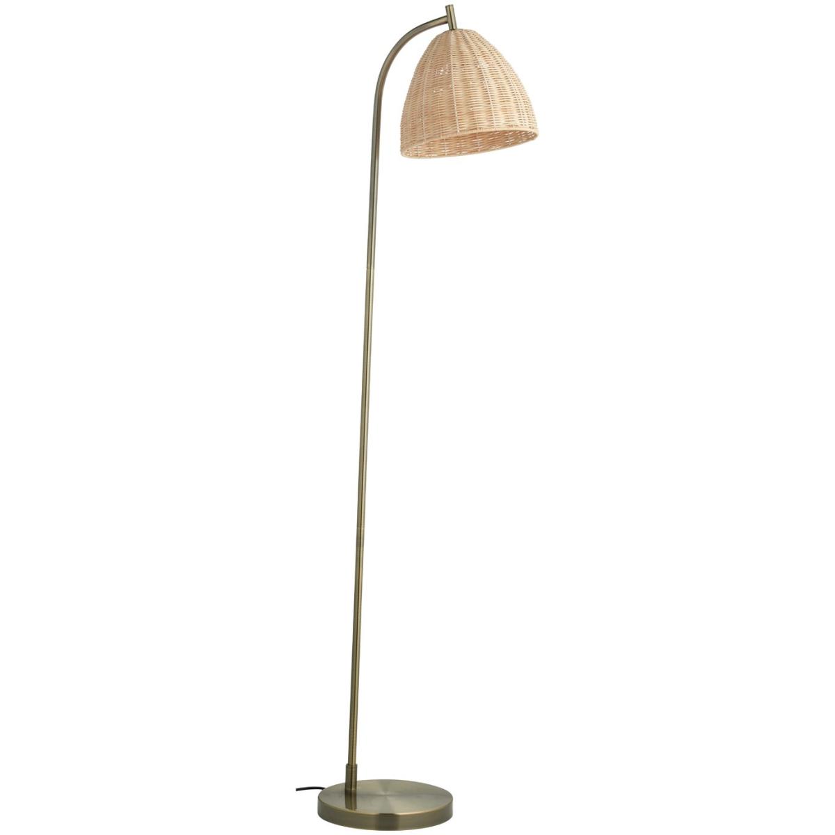 Introducing the Hellie Floor Lamp, a stylish fusion of contemporary design and natural allure. The rattan shade, paired with an antique brass base and stem, creates a harmonious blend of elegance and earthy charm. Explore cohesive design possibilities with matching items, curating a seamless and chic lighting ensemble. Hellie transforms any room into a haven of modern sophistication with a touch of organic warmth, making it a distinctive and inviting addition to your decor. Rattan Shade. Compatible with LED Lamps. Dimensions: Size H150, W38, D25, Diameter 30cm. Diameter of base 25cm. Shade size H20, D25cm. Cord length 2m. Bulb Information: Bulb required 1 x GLS E27 edison screw LED (not included). 15 watts. LED bulb only. General Information: Base material: metal. Foot switch. IP 20 - not suitable for bathroom use. Self-assembly. Product is mains powered plug in. This lighting product is a class 2 fitting. Weight 4.2kg. Manufacturer's 1 year guarantee.