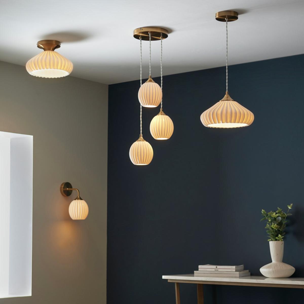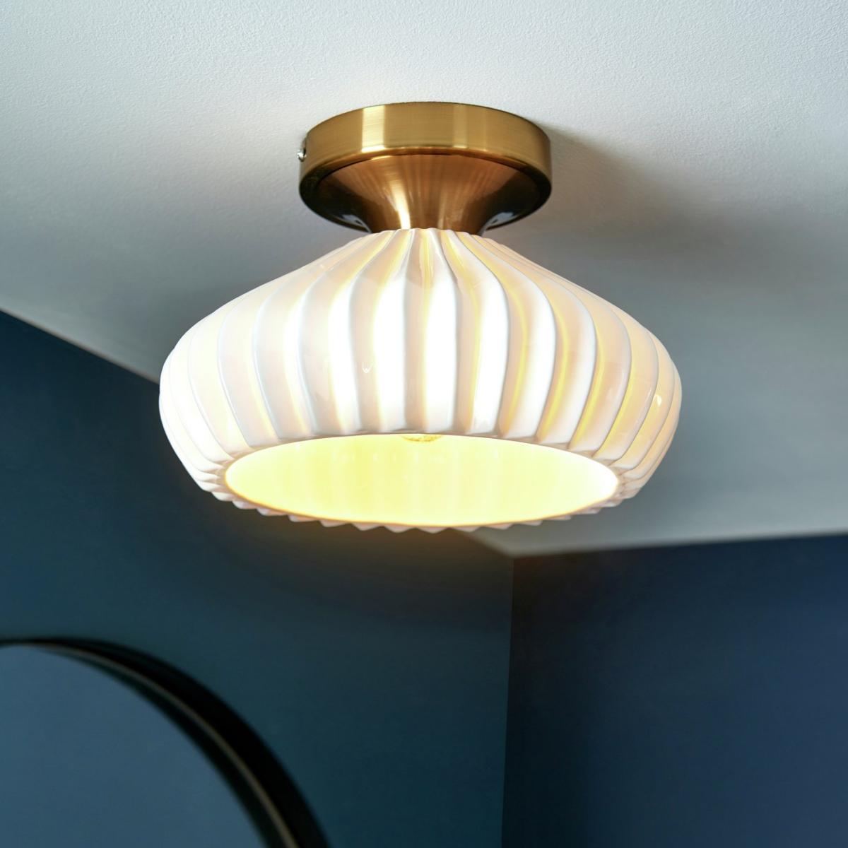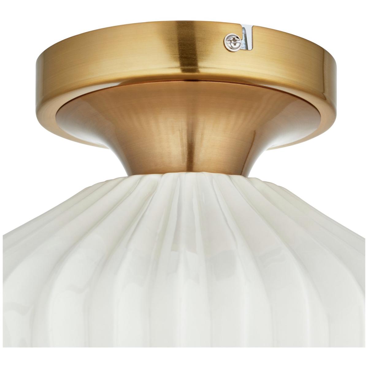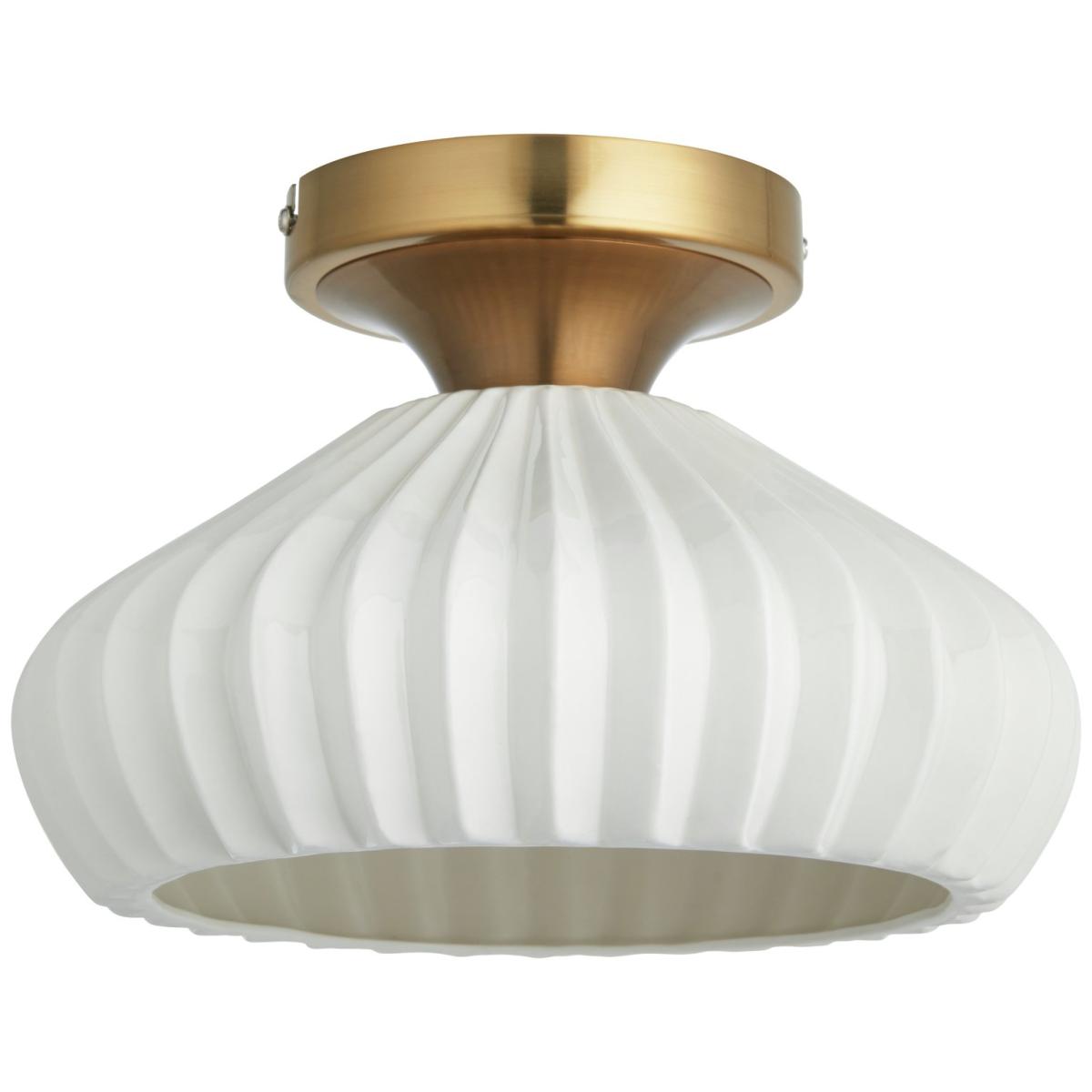 The Leah Flush Ceiling Light is a refined lighting fixture featuring a white porcelain shade with a satin brushed gold finish. With its dimmable functionality, it allows you to create the perfect lighting ambiance. Explore the matching family items, available separately, to maintain a cohesive and elegant decor theme throughout your space. Illuminate with sophistication using the Leah Flush Ceiling Light. Dimensions: Size H19, , Diameter 28cm. Bulb Information: Bulbs required 1 x E27 GLS bulb LED (not included). Recommended maximum wattage: 15 watts. Can be used with a dimmer switch. LED bulb only. General Information: Steel & porcelain. IP rating 20 - not suitable for bathroom use. Weight: 1.65kg. Minimal assembly. Product is hard-wired into electrics. This lighting product is a class 1 fitting. Manufacturer's 1 year guarantee.