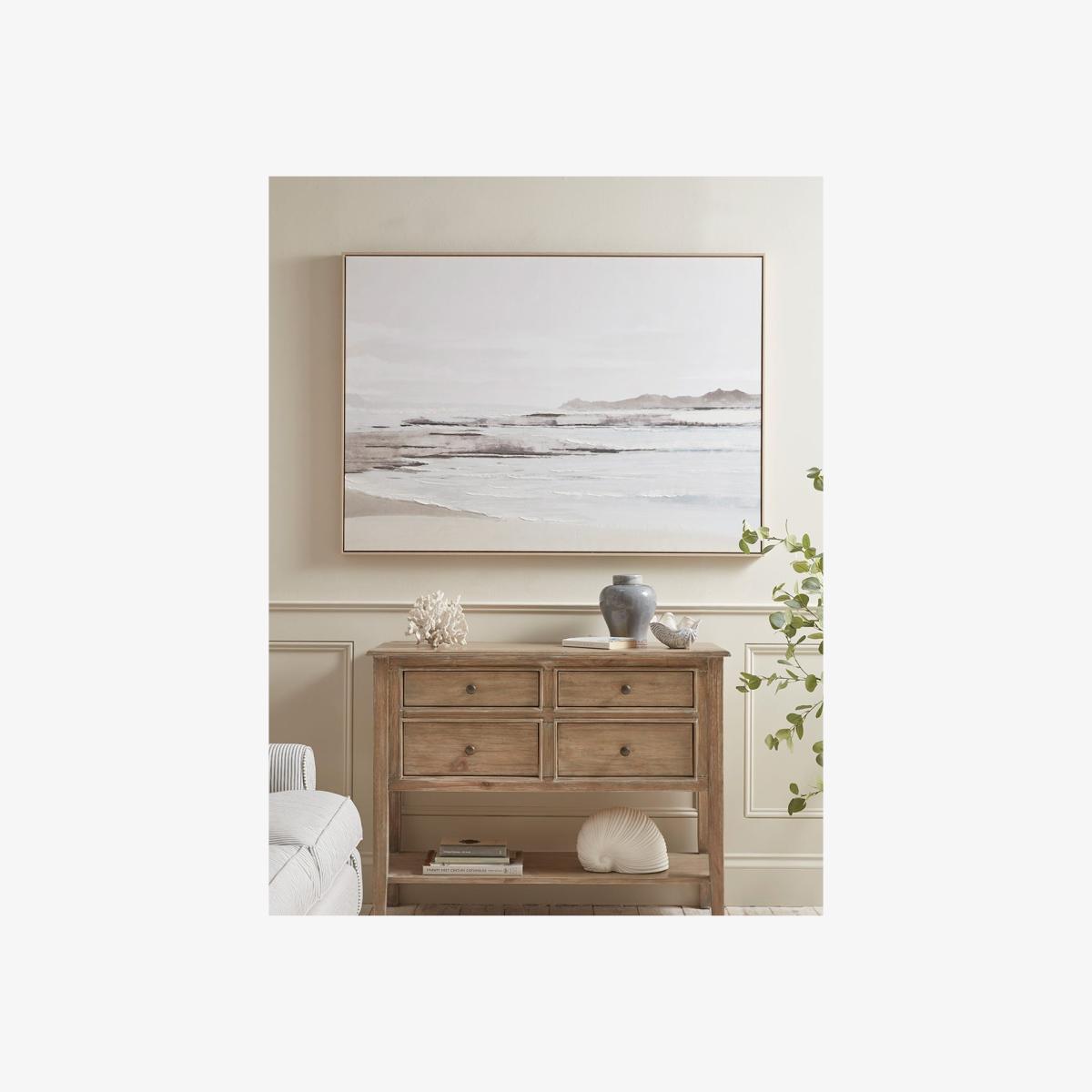 I love this piece for its calming, understated aesthetic-it's perfect for creating a relaxed atmosphere in living rooms, bedrooms, or even a tranquil corner in an office. The Shoreline Framed Canvas works well in coastal or minimalist interiors, where it can complement natural textures and neutral tones. When styling, consider hanging it at eye level above a sideboard or console table, and pair it with simple accessories like ceramic vases or soft textiles. To keep the look cohesive, opt for natural wood or light metals nearby, allowing the artwork to add a touch of serenity without overwhelming the space.