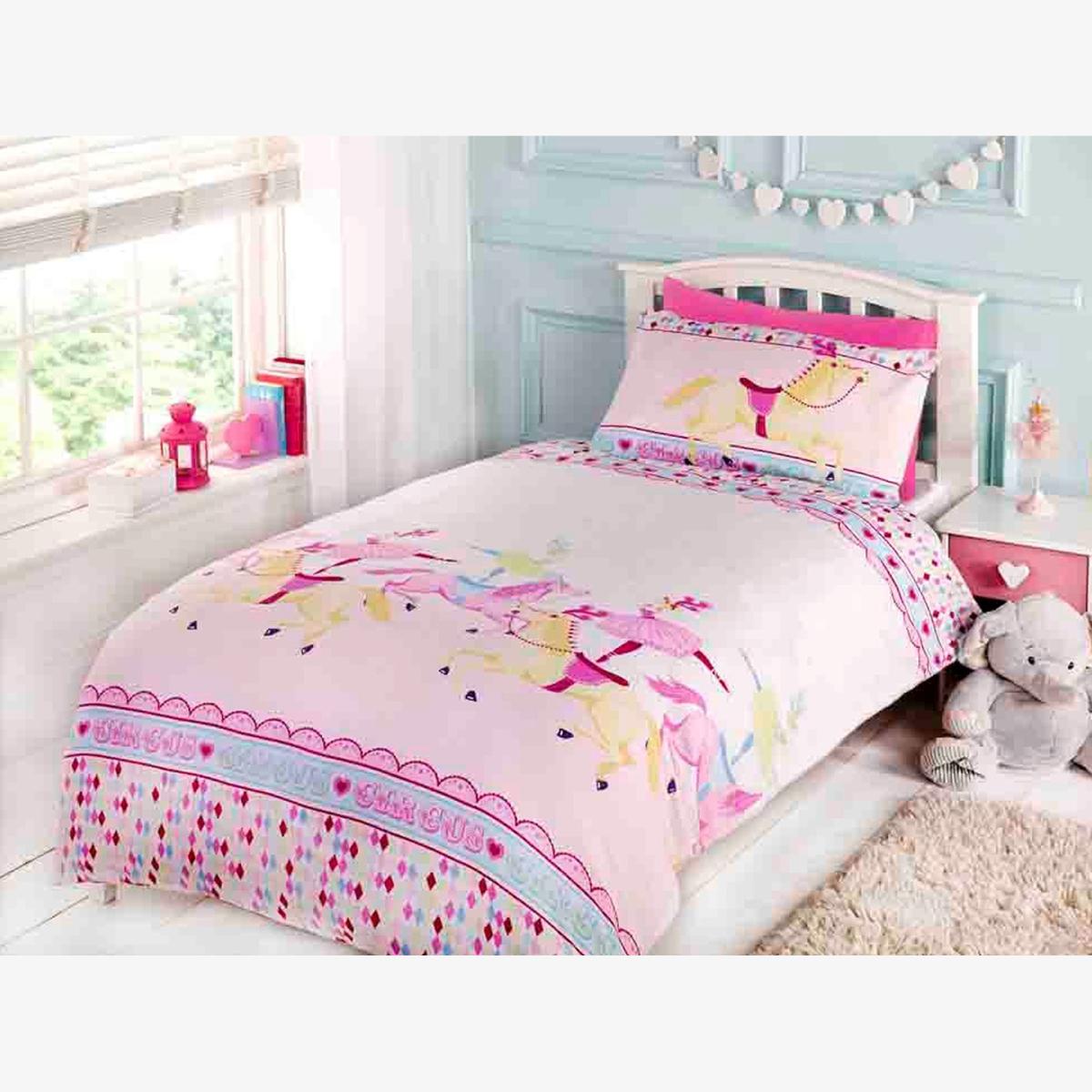 Our show time duvet cover features carousel horses with the word circus running at the bottom of the duvet cover. Printed in shades of pink and a carousel horse on the pillowcase.