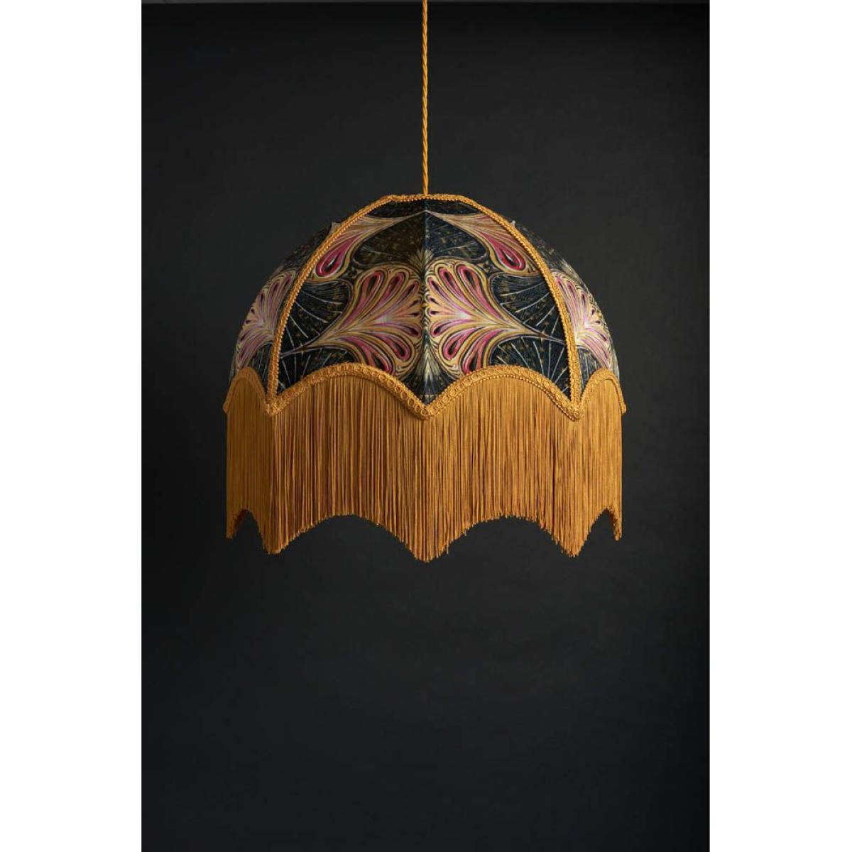 About The Anna Hayman Designs Showgirl Lamp Shade - Different Options AvailableAvailable in a selection of functional sizes and in two plush fabrics, the Anna Hayman Designs Showgirl Lamp Shade is a fun, flirty and feminine choice of shade. Using the art of linocut to give the piece immense depth, this statement lamp shade features a glamorous fan-like design in a mix of black, gold and bright pink tones. Giving the piece an extra touch of luxury, this vintage lamp shade showcases a deep gold braided trim and fringe. Marvellously handcrafted by Anna Hayman Designs in Sussex, we offer a range of variable choices so you can choose the exact right light feature to suit your space. With the option of a shade for your table and floor lamps or for your ceiling pendant light fittings, you can style this gorgeous shade as an accent piece or the focal point of a room. There are then two plush fabrics to choose from, Duchess Satin or sumptuous Velvet, as well as a gold or white lining, to make this elegant lamp shade a luxurious statement in your home. Available in XL, L, M & S, you won’t be disappointed with the shade you receive, it is truly a piece of art!Why We Think You’ll Love The Unique Lamp ShadeShowcasing outstanding craftsmanship, this vintage light shade will serve as a show stopping centrepiece in your interior décor. Made by highly skilled artisans who carefully stretch and trim the sumptuous fabrics over the frames with extreme care, this statement light shade goes down as a glamorous interior treasure that will be cherished for years to come in our books! Should you desire a bright glow we suggest opting for the Duchess Satin fabric. However, if you prefer the plush texture of soft velvet then we recommend using a high voltage bulb so the glow radiates through the luxurious fabric. How To Style The Quirky Lamp ShadeThis statement lamp shade creates a simple way to instantly incorporate colour, pattern and most importantly fun into your home. Offering a delightfully playful look, display the small size with the lamp attachment in a bedroom scheme or on a side table in a living room, next to one of our Rockett St George bespoke armchairs for a pop of luxury and stand out style. Alternatively, make this light shade the focal point of a room by styling the extra large size with the pendant attachment. We can guarantee that it’ll steal the show, so what’s not to love?!