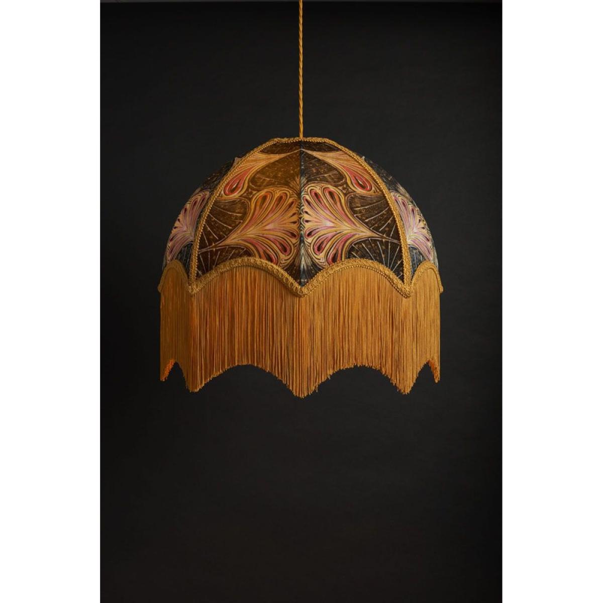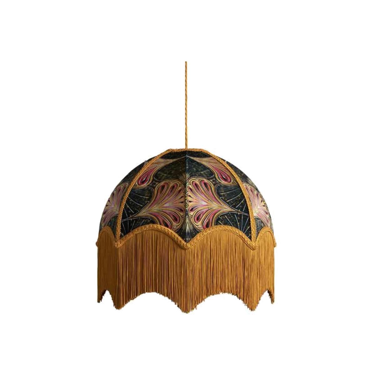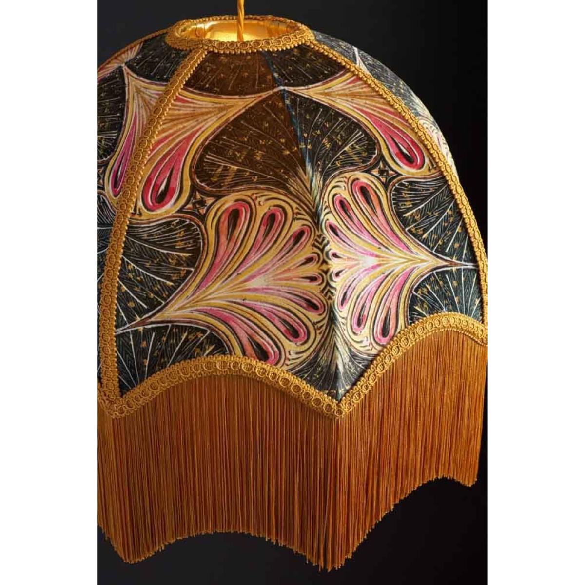 About The Anna Hayman Designs Showgirl Lamp Shade - Different Options AvailableAvailable in a selection of functional sizes and in two plush fabrics, the Anna Hayman Designs Showgirl Lamp Shade is a fun, flirty and feminine choice of shade. Using the art of linocut to give the piece immense depth, this statement lamp shade features a glamorous fan-like design in a mix of black, gold and bright pink tones. Giving the piece an extra touch of luxury, this vintage lamp shade showcases a deep gold braided trim and fringe. Marvellously handcrafted by Anna Hayman Designs in Sussex, we offer a range of variable choices so you can choose the exact right light feature to suit your space. With the option of a shade for your table and floor lamps or for your ceiling pendant light fittings, you can style this gorgeous shade as an accent piece or the focal point of a room. There are then two plush fabrics to choose from, Duchess Satin or sumptuous Velvet, as well as a gold or white lining, to make this elegant lamp shade a luxurious statement in your home. Available in XL, L, M & S, you won’t be disappointed with the shade you receive, it is truly a piece of art!Why We Think You’ll Love The Unique Lamp ShadeShowcasing outstanding craftsmanship, this vintage light shade will serve as a show stopping centrepiece in your interior décor. Made by highly skilled artisans who carefully stretch and trim the sumptuous fabrics over the frames with extreme care, this statement light shade goes down as a glamorous interior treasure that will be cherished for years to come in our books! Should you desire a bright glow we suggest opting for the Duchess Satin fabric. However, if you prefer the plush texture of soft velvet then we recommend using a high voltage bulb so the glow radiates through the luxurious fabric. How To Style The Quirky Lamp ShadeThis statement lamp shade creates a simple way to instantly incorporate colour, pattern and most importantly fun into your home. Offering a delightfully playful look, display the small size with the lamp attachment in a bedroom scheme or on a side table in a living room, next to one of our Rockett St George bespoke armchairs for a pop of luxury and stand out style. Alternatively, make this light shade the focal point of a room by styling the extra large size with the pendant attachment. We can guarantee that it’ll steal the show, so what’s not to love?!