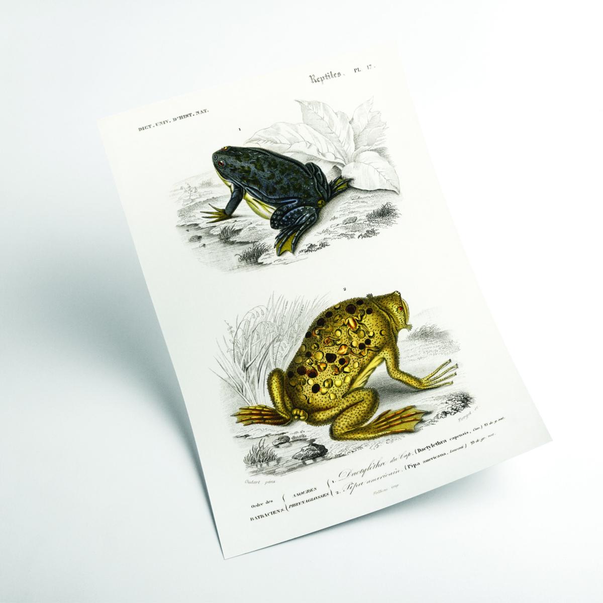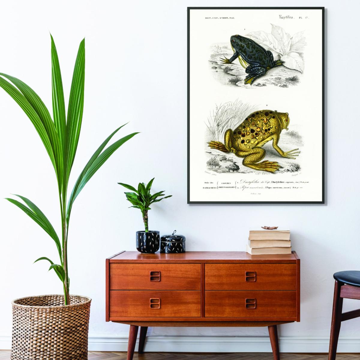 I love this print because it combines a classic, vintage aesthetic with a quirky subject, which can add character to a space. The detailed illustrations of the frog and surinam toad work well in interiors that lean towards traditional or eclectic styles, especially with natural or botanical themes. Practical styling tips include pairing it with neutral walls or framing it alongside other nature-inspired artworks for a curated look. It’s also versatile enough to work in living rooms, studies, or even a bathroom if you want to introduce a touch of humour and curiosity to the décor. Keep the framing simple to let the illustrations take centre stage, and consider placing it above a console or sideboard for an eye-catching focal point.